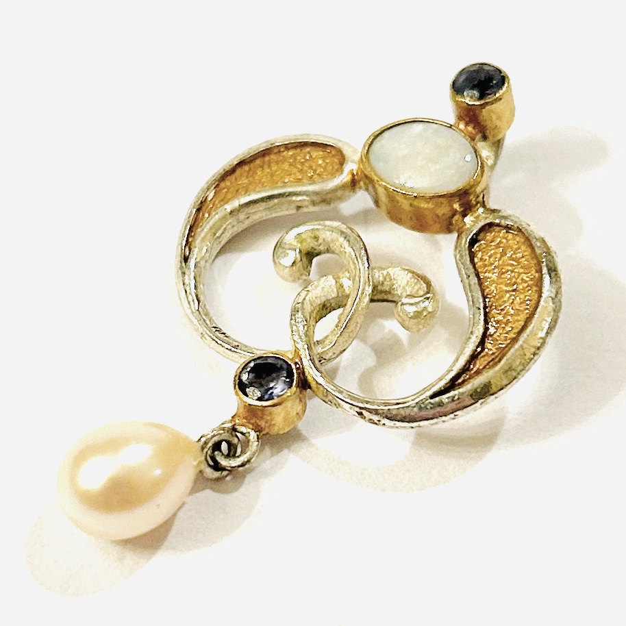 Půvabný, elegantní přívěšek inspirovaný secesním šperkařstvím, osazeno oválnou muglí přírodního mléčného opálu a 2 přírodními modrými safíry kulatého brusu, kinetický ověsek tvořený přírodní kultivovanou bílou perlou ve tvaru slzy. Pečlivě tvarované kovové linie, obruby a prohlubně zlaceny. Precizní, patrně západoevropská autorská zlatnická práce z poslední třetiny 20. století.