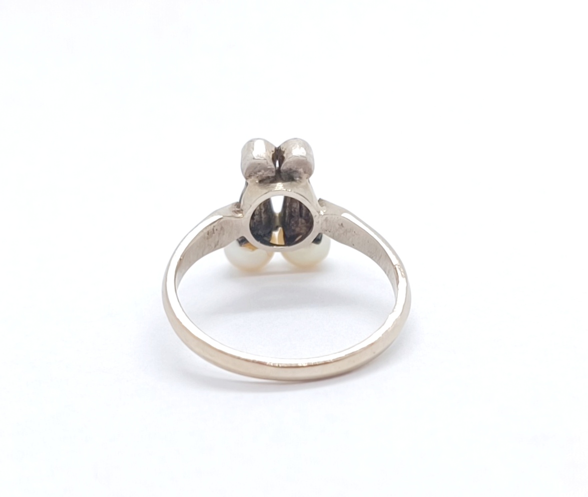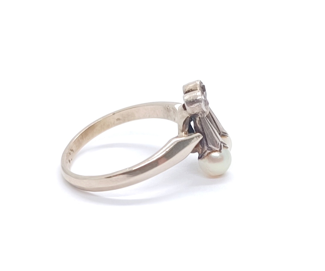 Secesní prsten s drobnými diamanty a perličkami, kombinace zlata a stříbra, Au+Ag btto 2,90g/585+925/1000, západní Evropa, kolem roku 1910, atest puncovního úřadu; velikost prstenu 54