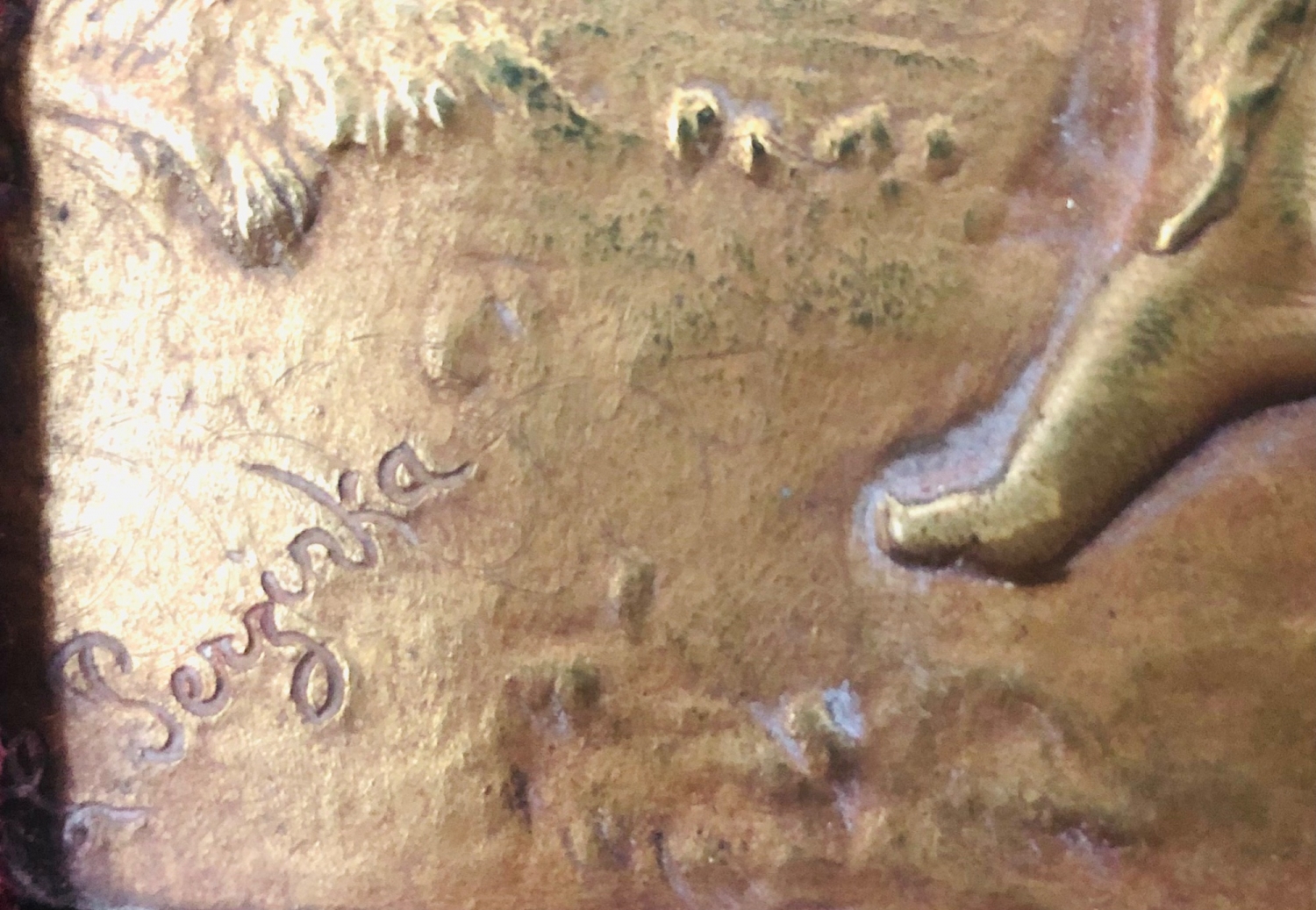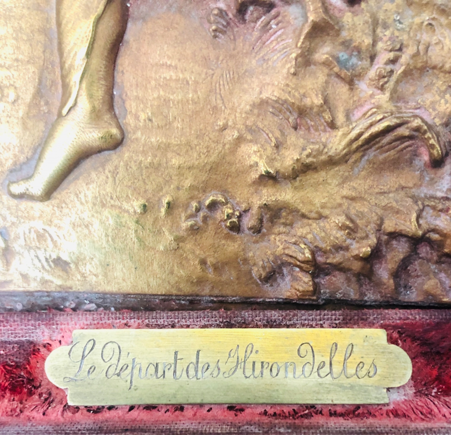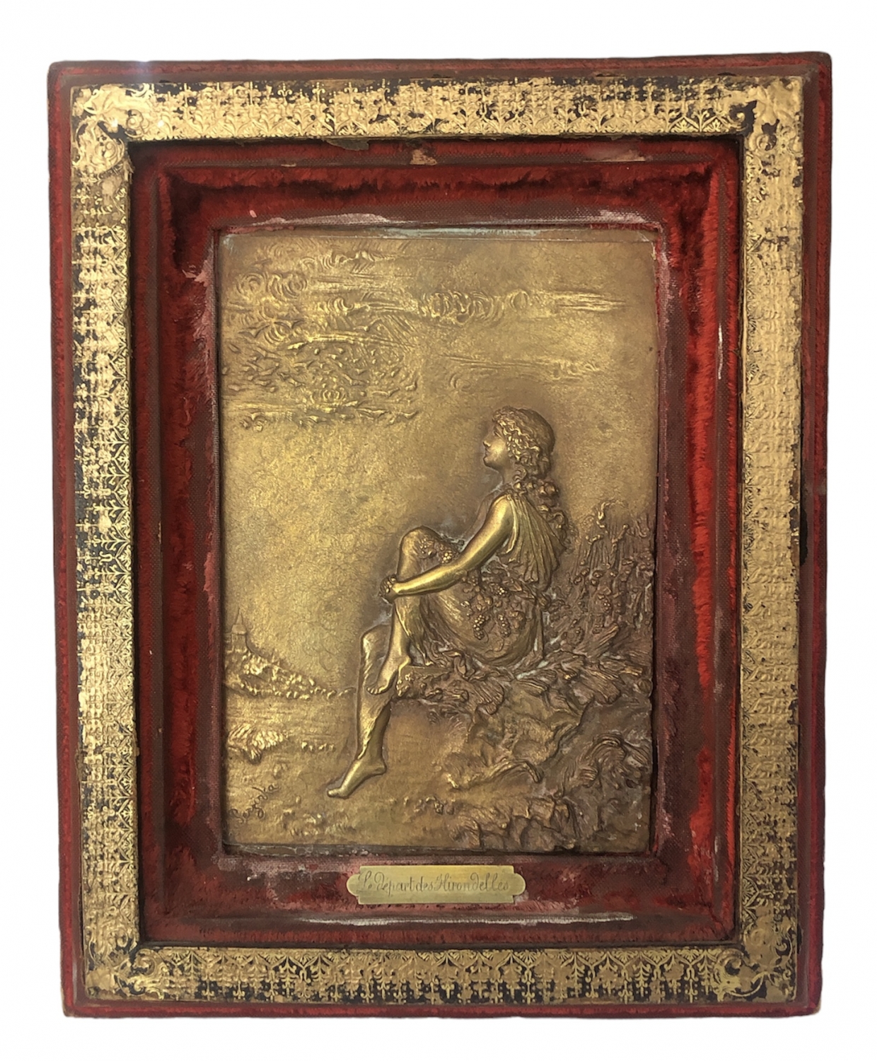 Měděný secesní reliéf, na destičce název Le Départ des Hirondelles (Odchod vlaštovek), signováno L. Terzinka, kolem roku 1900, v původním koženém rámečku potažený sametem; s ràmečkem 28,5×23 cm, samotný reliéf 18,5×13 cm