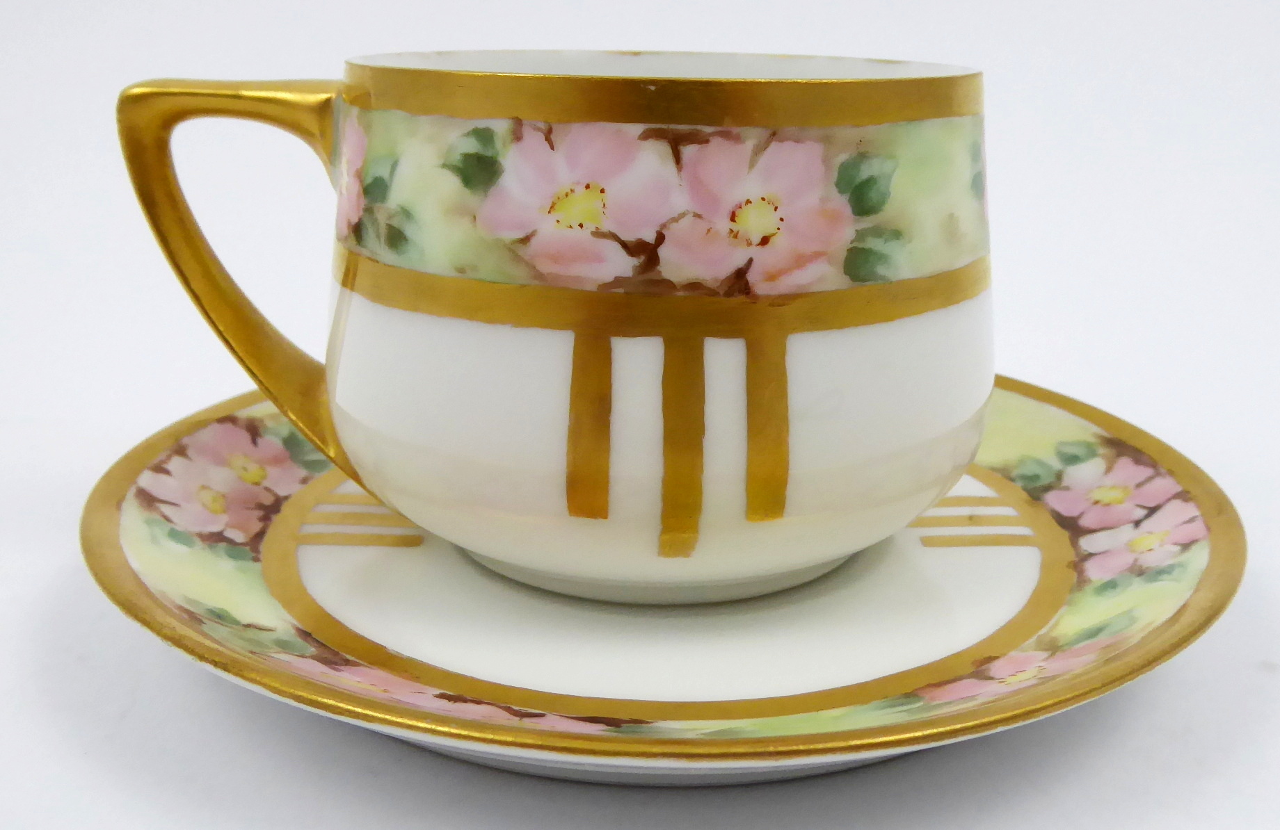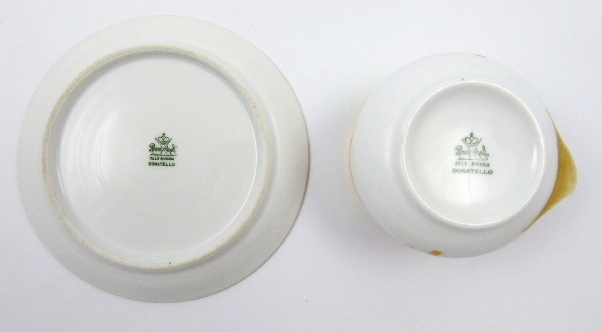 Bílý, barevně ručně malovaný a zlacený porcelán. Období a styl: secese. Porcelánka Rosenthal. Název vzoru: Donatello. Elegantní porcelánový šálek s podšálkem z období secese s ručně na glazuře malovanými květy šípkových růžiček s listy a úponky. Barevné pásy jsou ohraničené silným zlacením. Celozlacený hraněný úchyt. Značeno zespodu: značka Rosenthal platná pro dané období a název vzoru Donatello. Německo, Rosenthal, kolem roku 1910. Výška šálku 5,5 cm, průměr podšálku 12,5 cm.