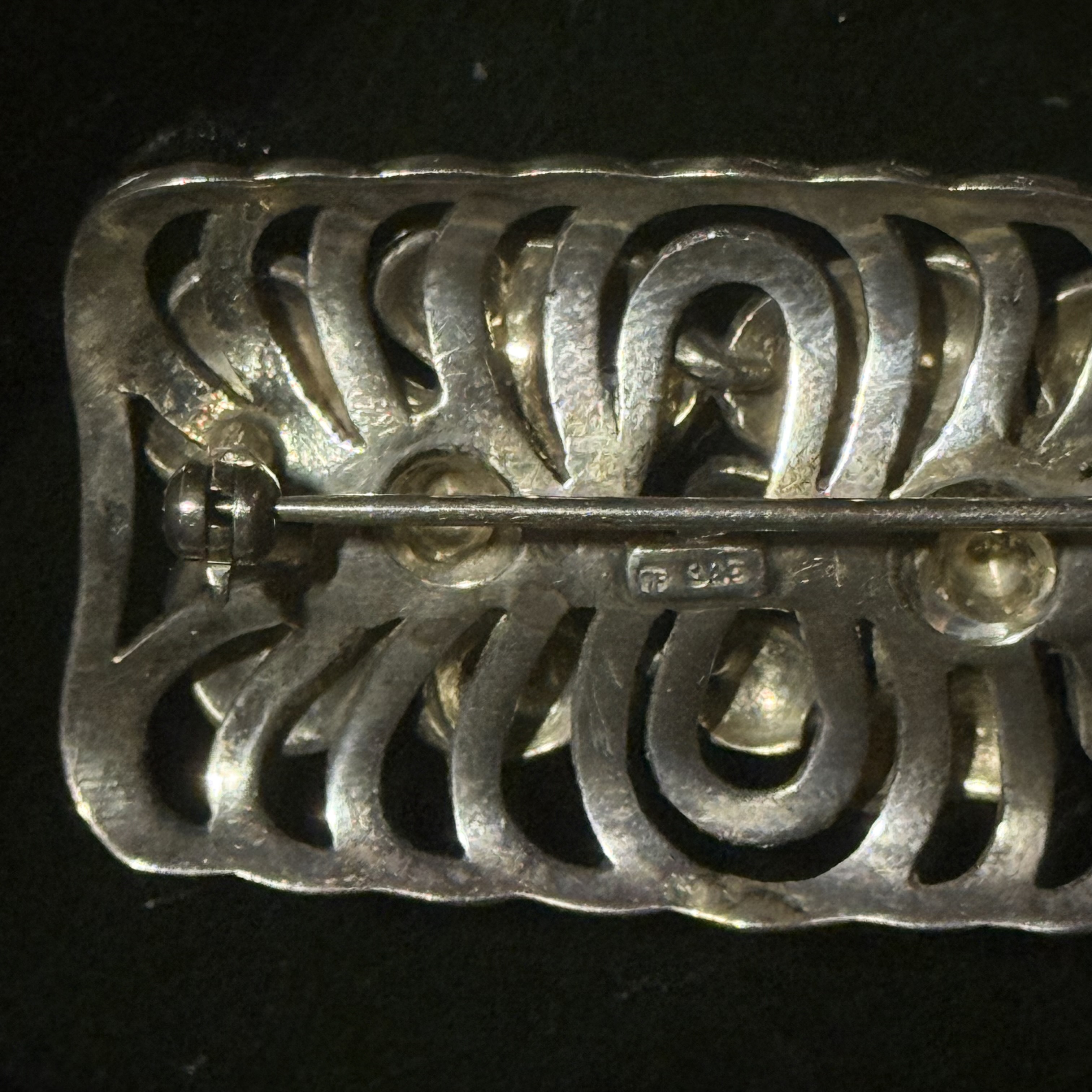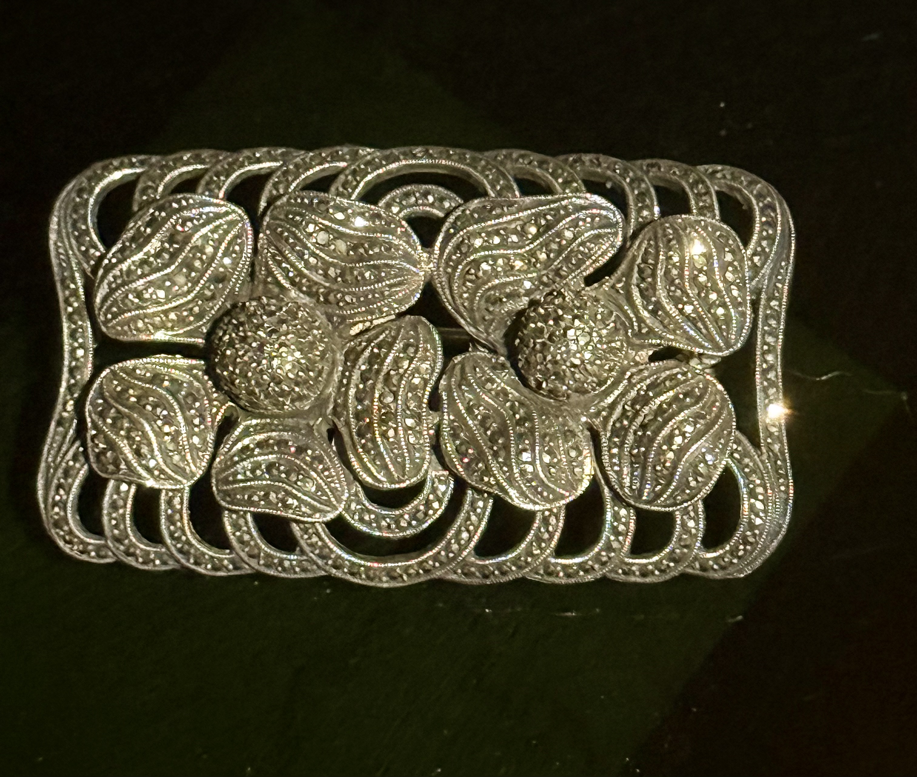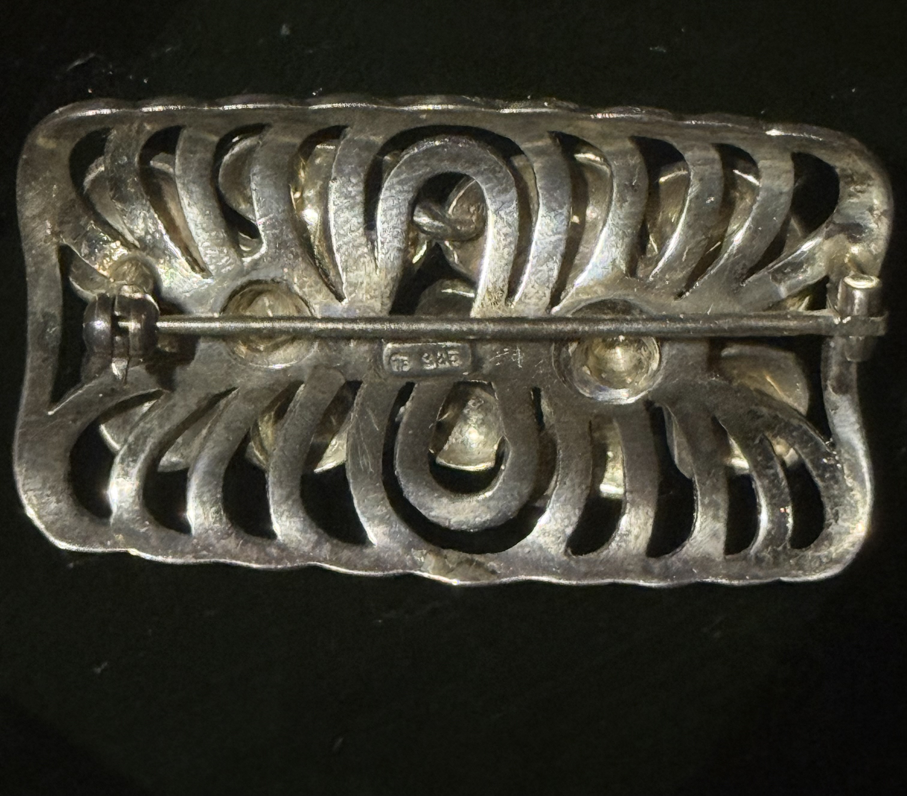 Starožitná stříbrná brož s markazity , secesní . Ryzost 925/1000, váha 19,2 g. Zezadu značeno TF.