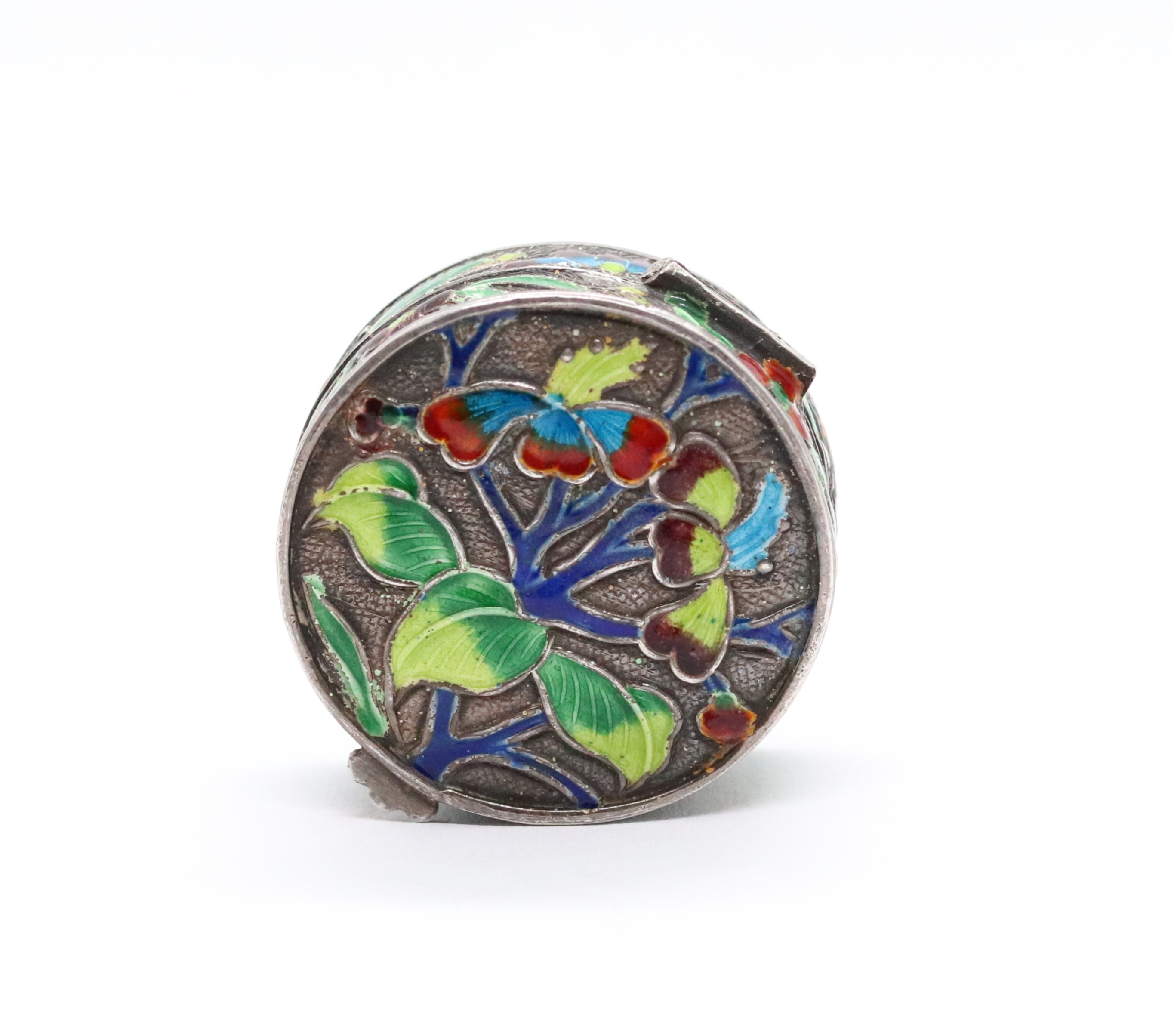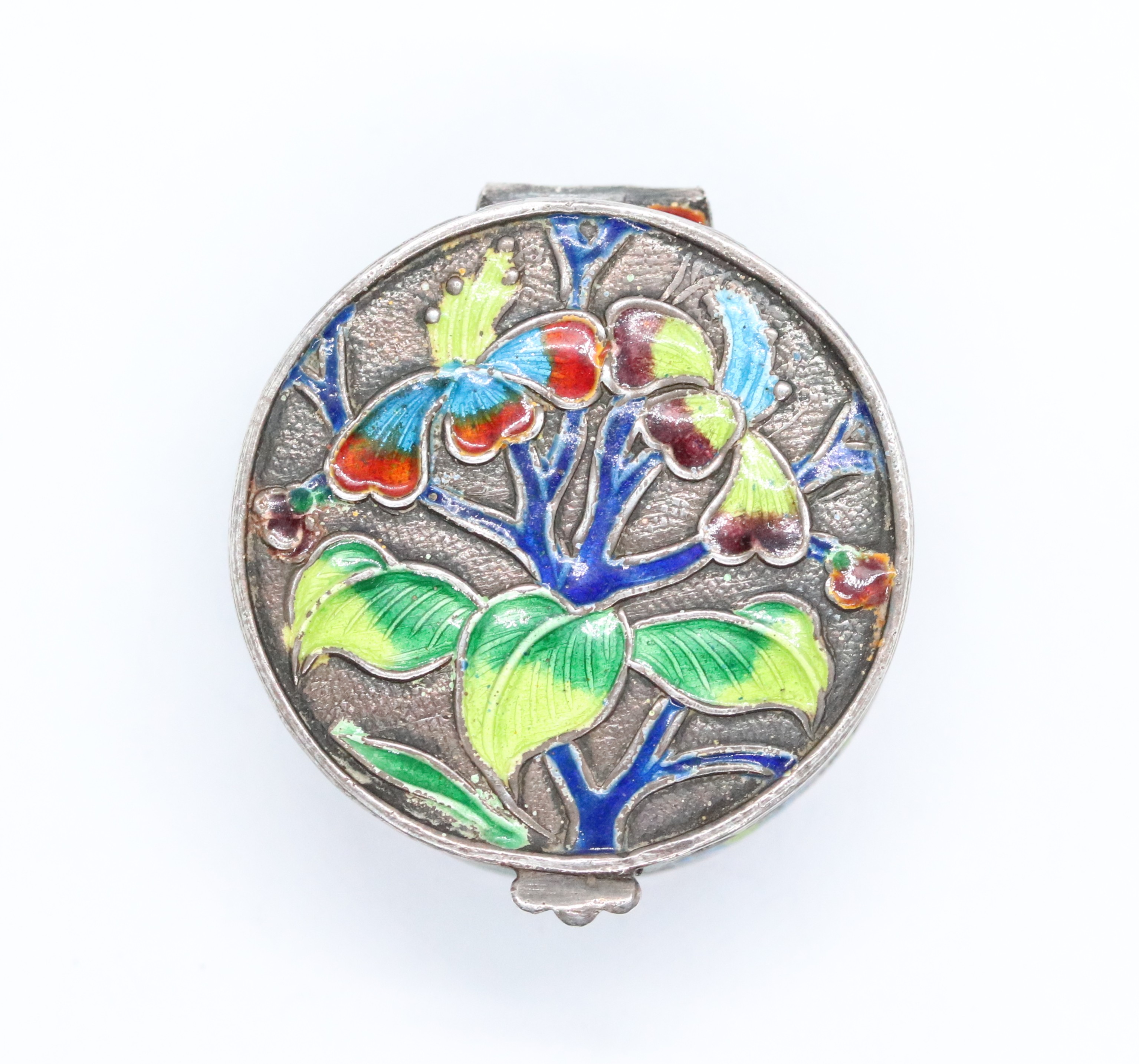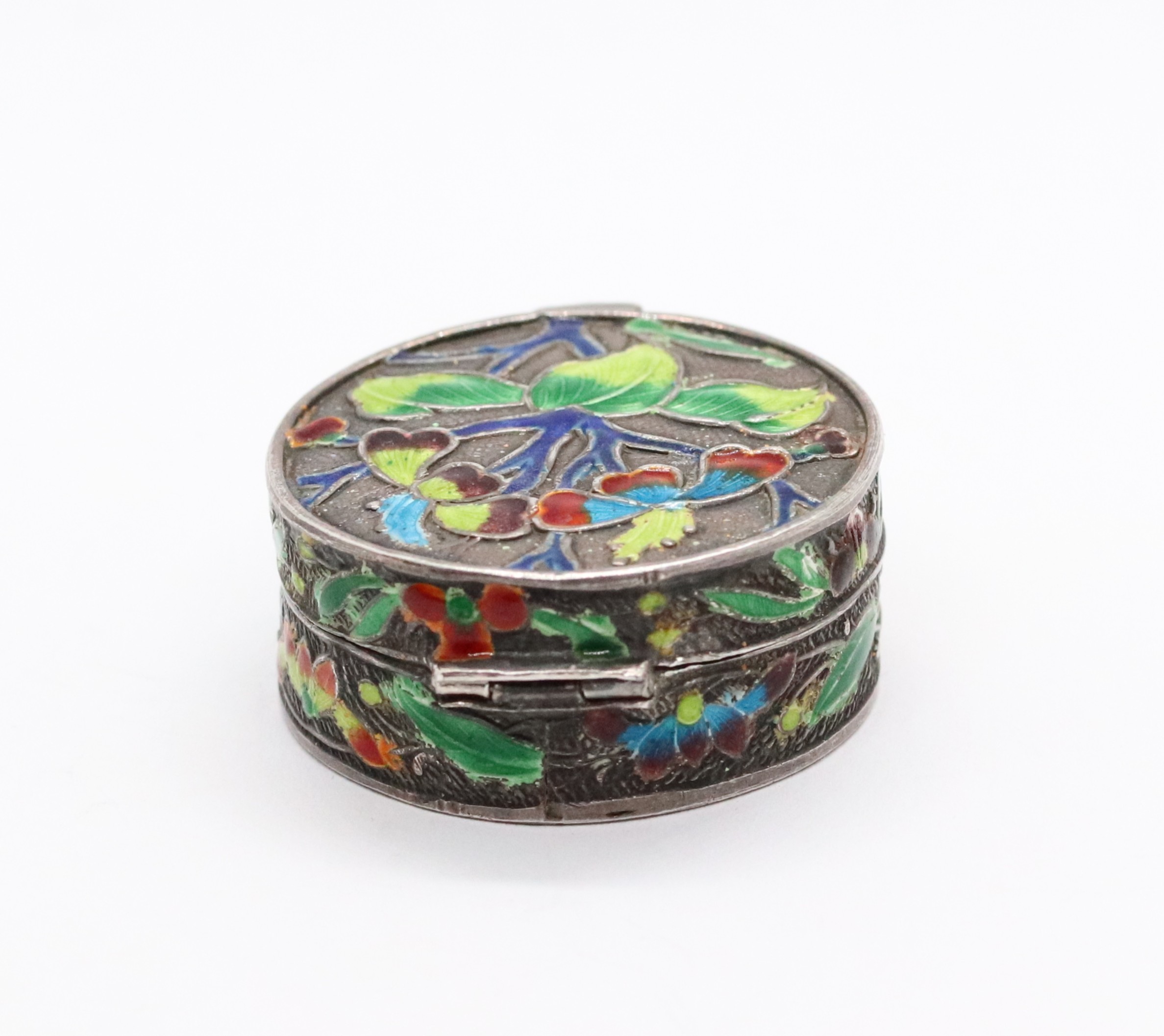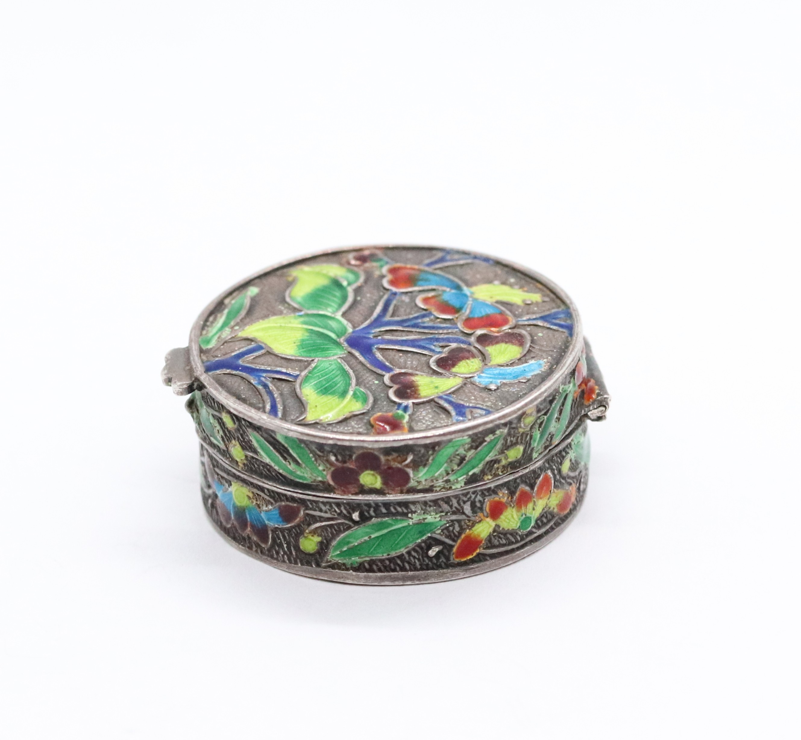Secesní stříbrná lékovka celá bohatě zdobená smalty, Ag btto 17,55g/925/1000, západní Evropa, kolem roku 1915, atest puncovního úřadu; průměr 3 cm, výška 1,9 cm (víčko visí na jednom pantíků ze dvou, ale je funkční)