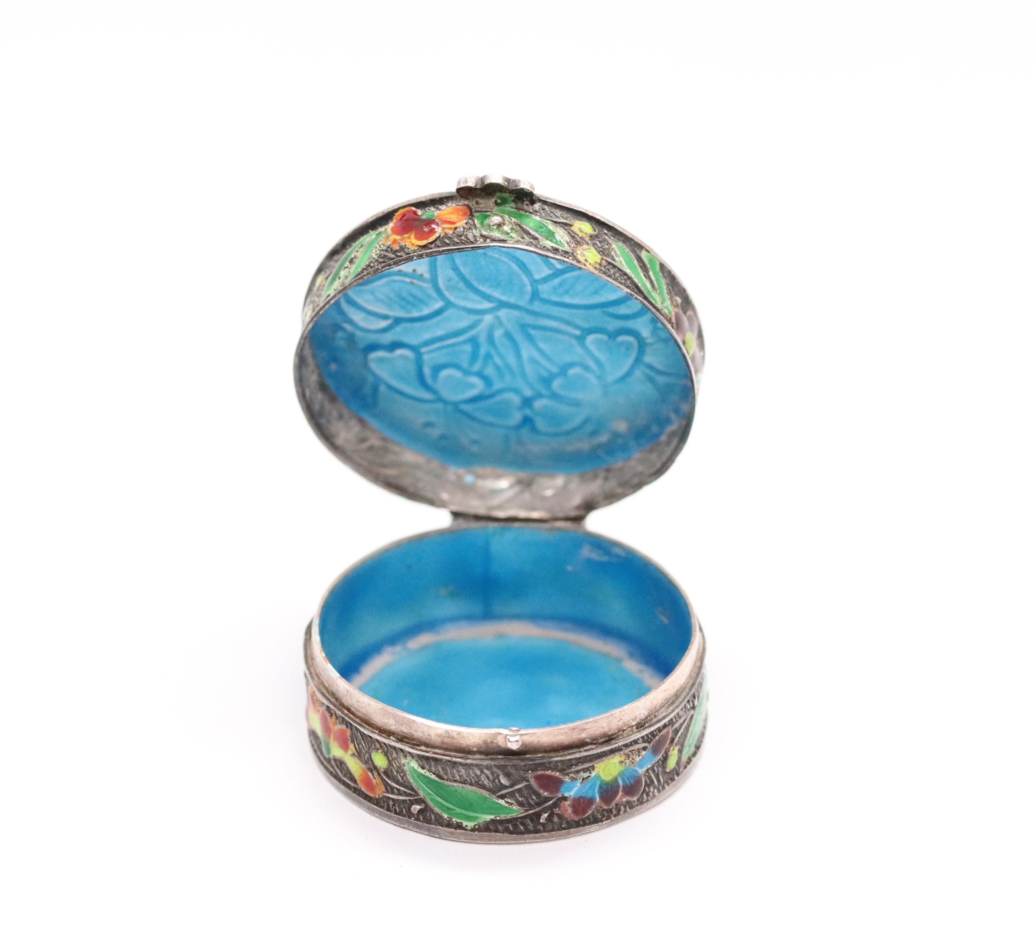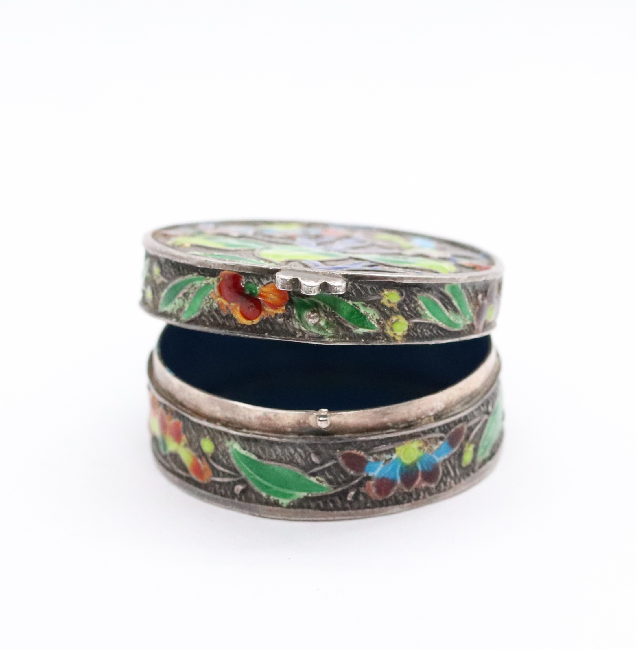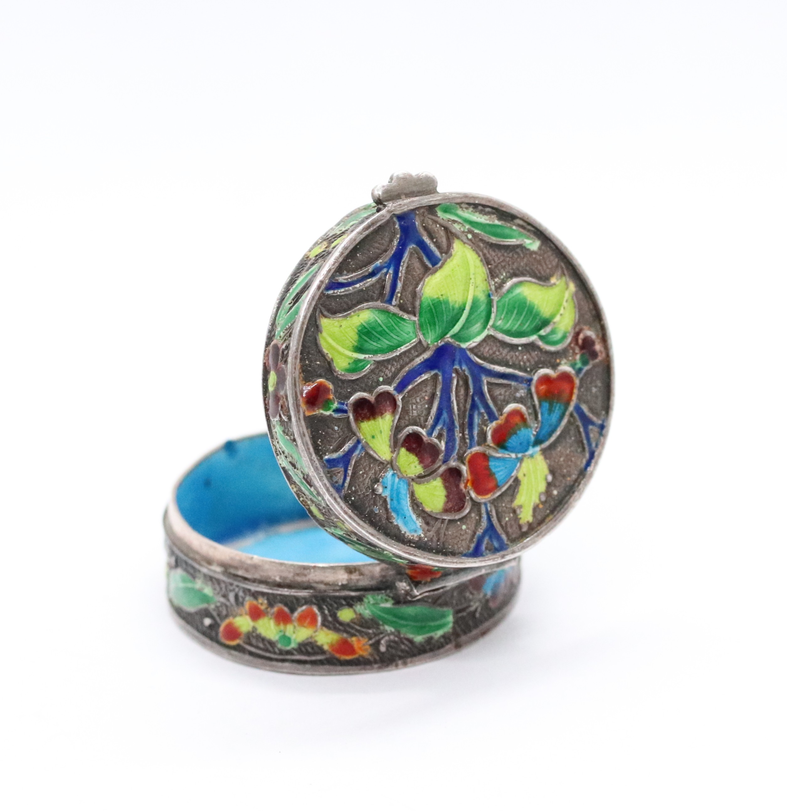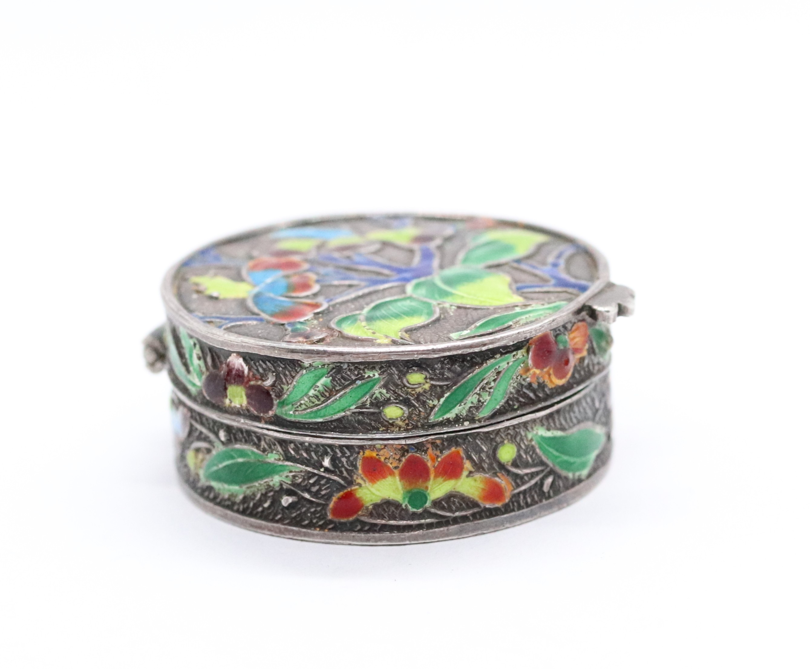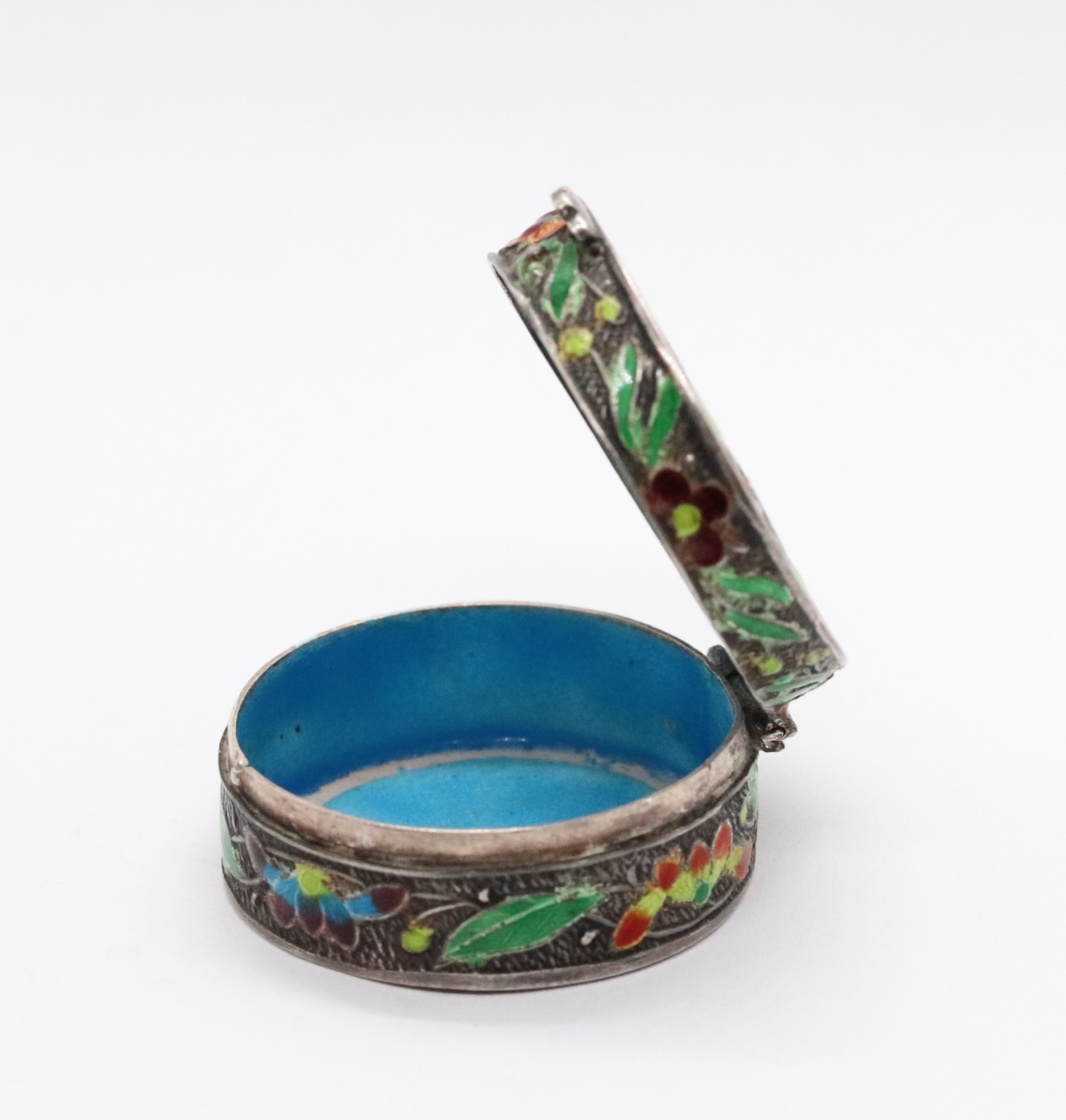 Secesní stříbrná lékovka celá bohatě zdobená smalty, Ag btto 17,55g/925/1000, západní Evropa, kolem roku 1915, atest puncovního úřadu; průměr 3 cm, výška 1,9 cm (víčko visí na jednom pantíků ze dvou, ale je funkční)