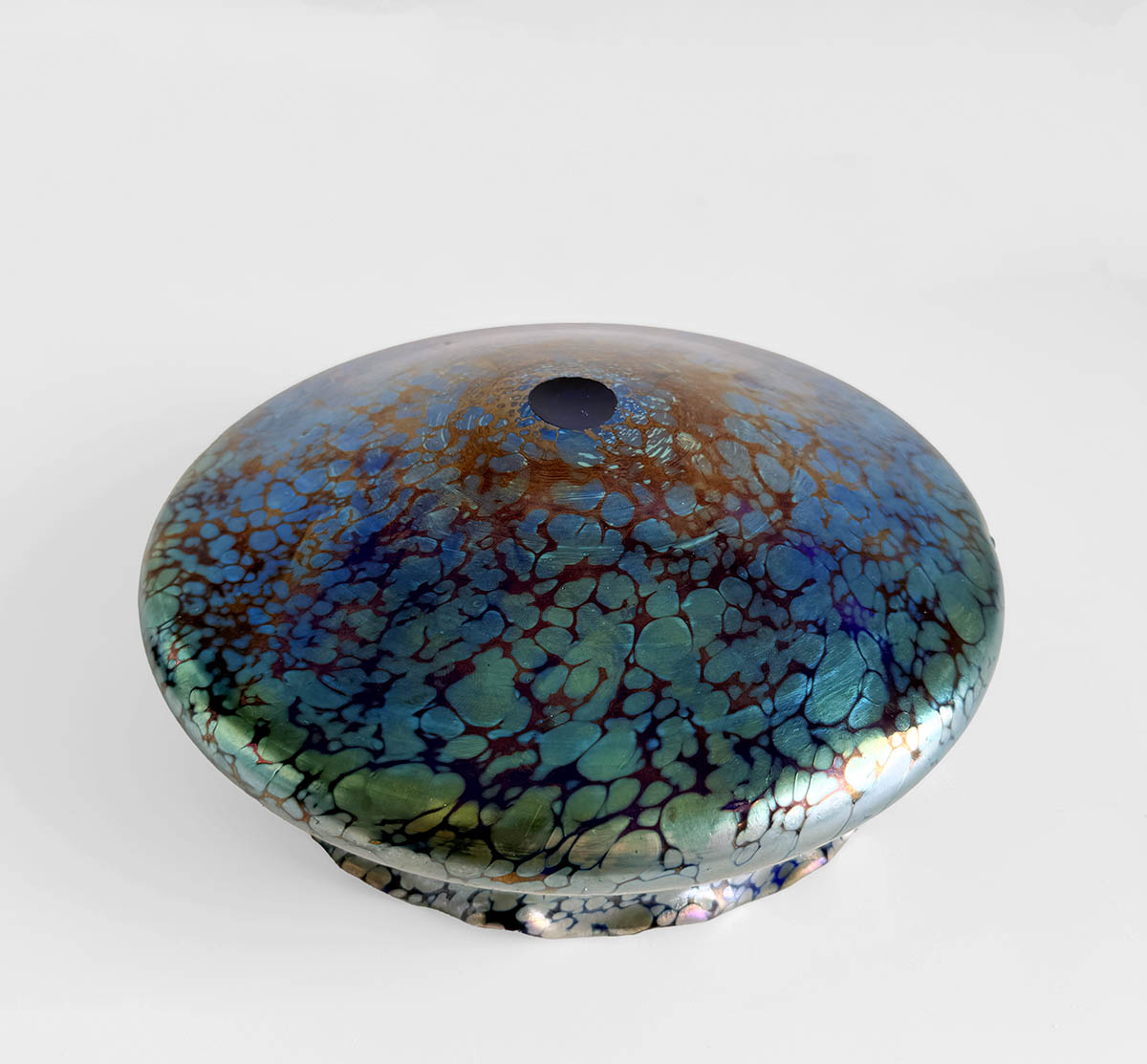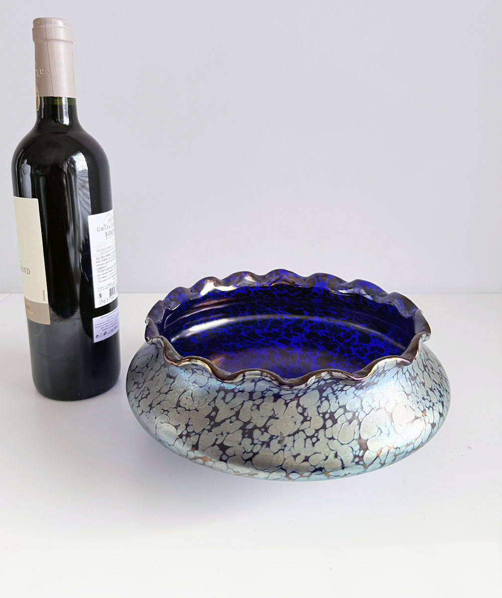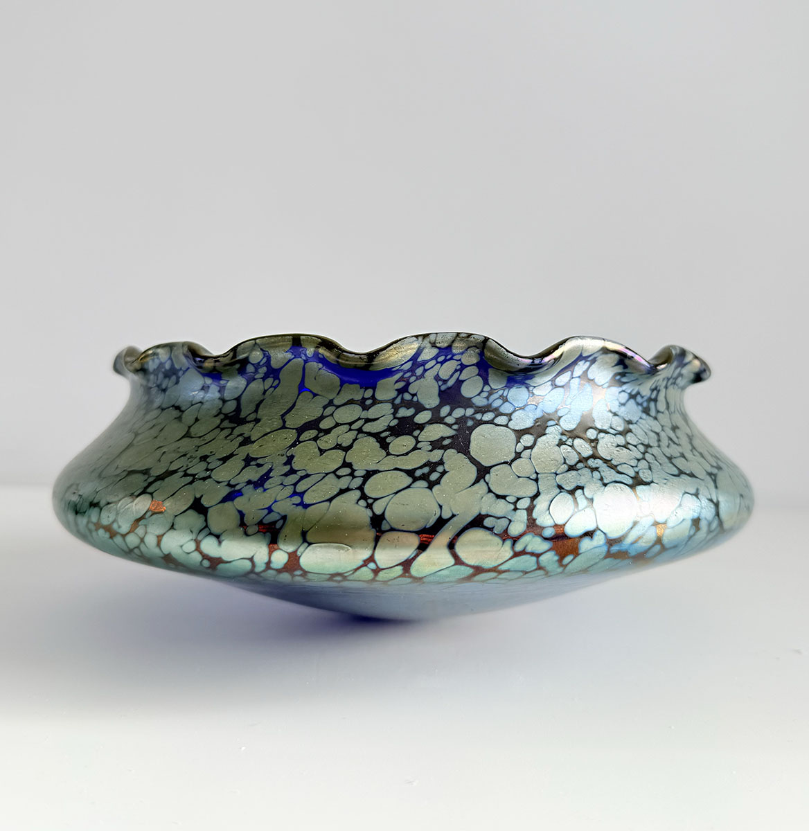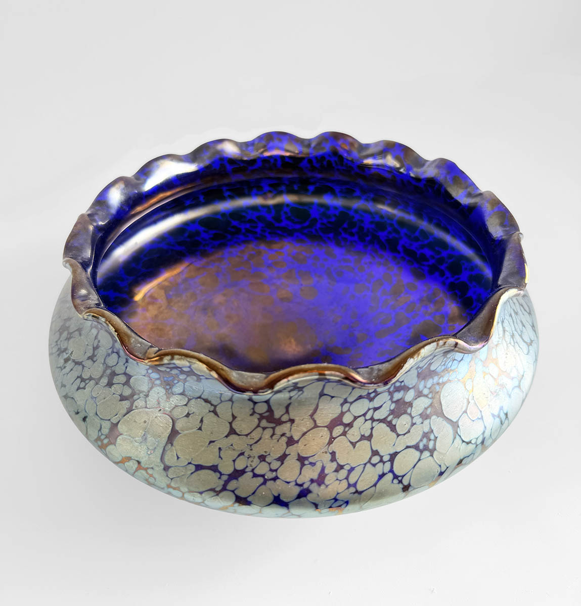 váza ze sklárny Loetz z Klášterského Mlýna, čiré modré sklo přejímané briliantovým opálem s natavenými broky z čirého hnědého skla (candia), hutně tvarovaný okraj, irizované, na zakázku pro Robert Medeu & Co., zřejmě pro doplnění kovové konstrukce. Zdroj: H. Ricke, Lötz, Bohemian Glass 1880–1940, Mnichov 1989, sv. 2, katalog výřezů vzorů, str. 368, č. 1335/3. Vyrobena v r. 1900, průměr 23,5 cm, výška 9,5 cm.