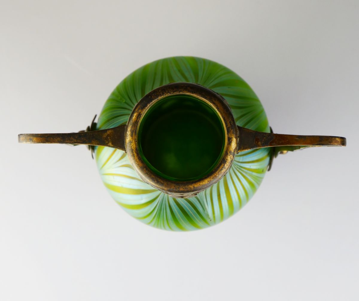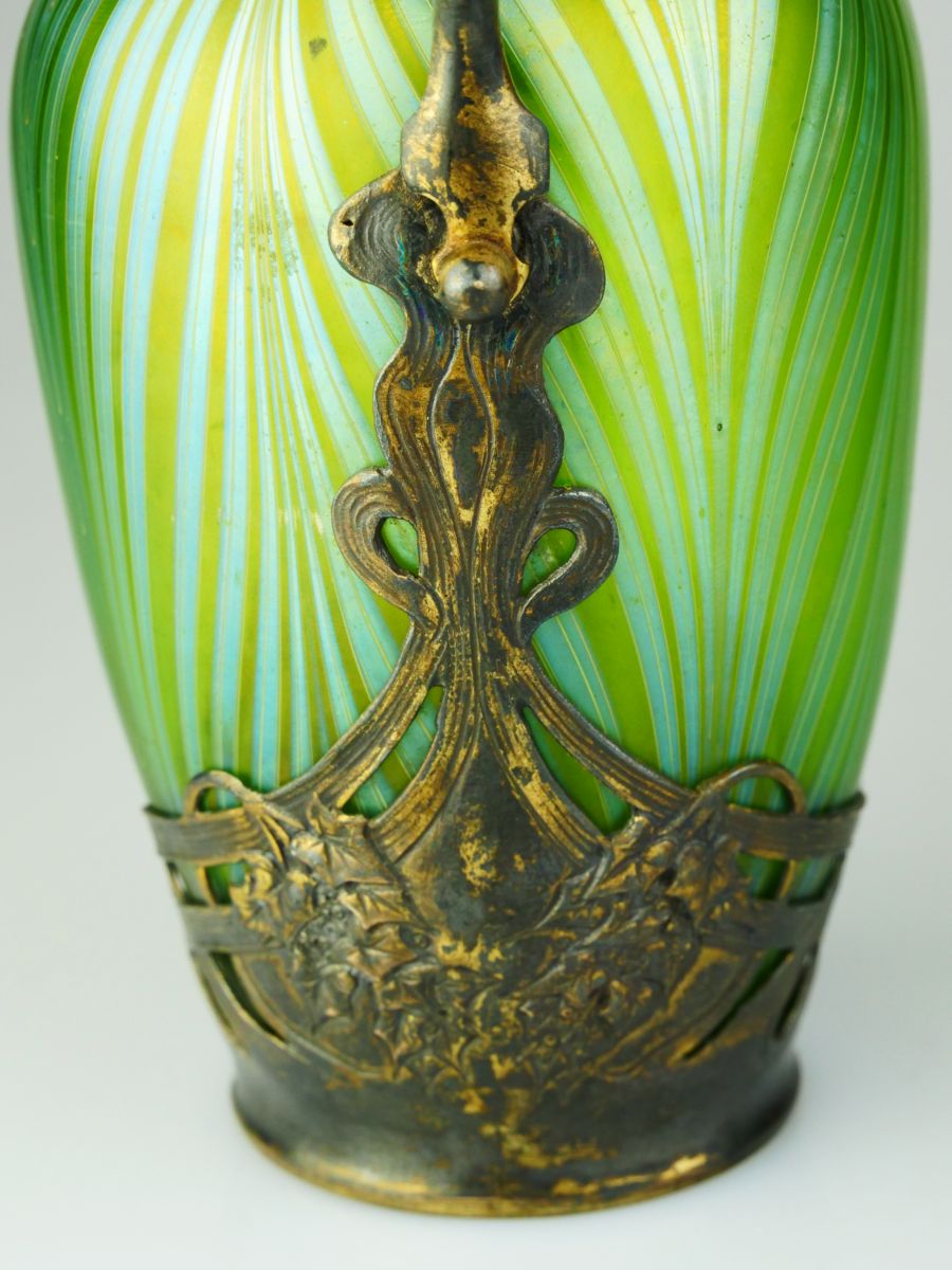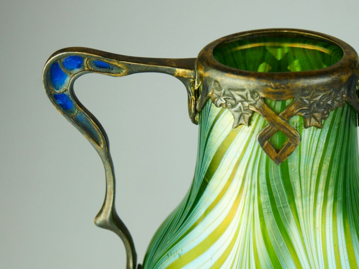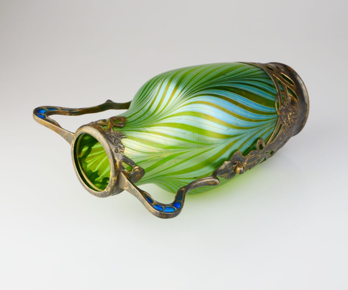 secesní váza šumavské sklárny Loetz z Klášterského Mlýna, dekor creta PG 7501, efektní stříbrná montáž s modrým okénkovým emailem, Čechy (Rakousko-Uhersko), kolem r. 1899, výška 15,5 cm, šířka 12 cm; sběratelsky zajímavé