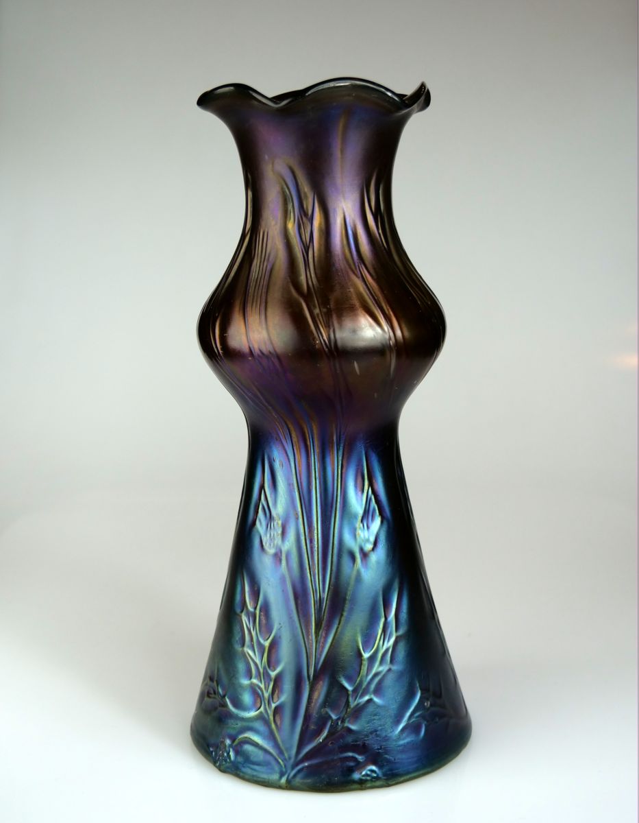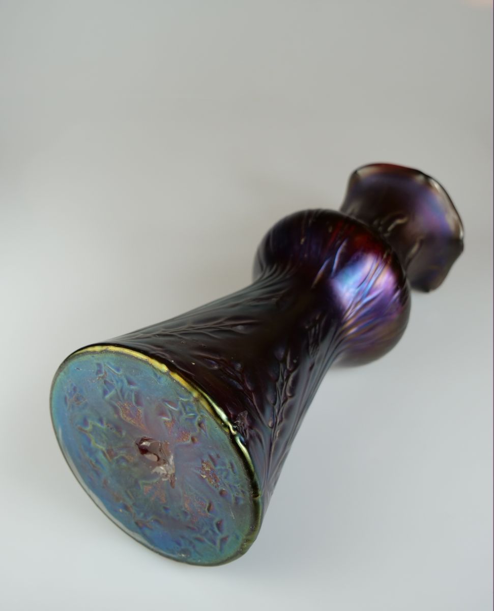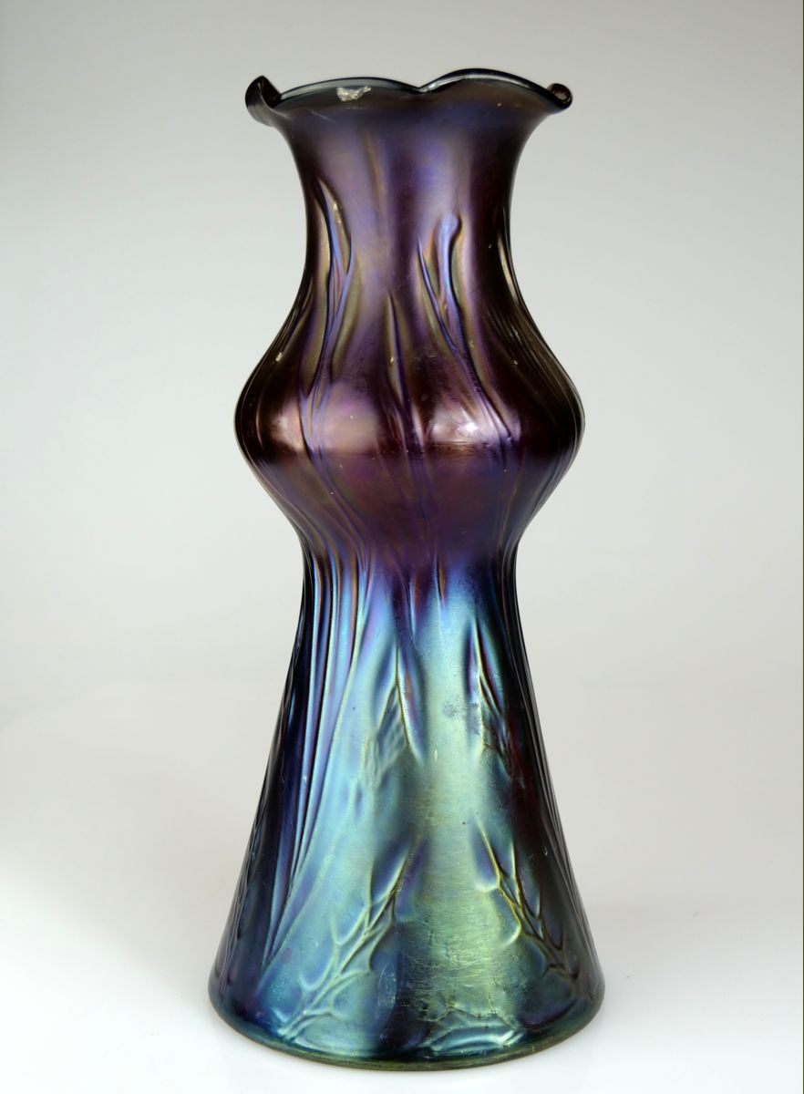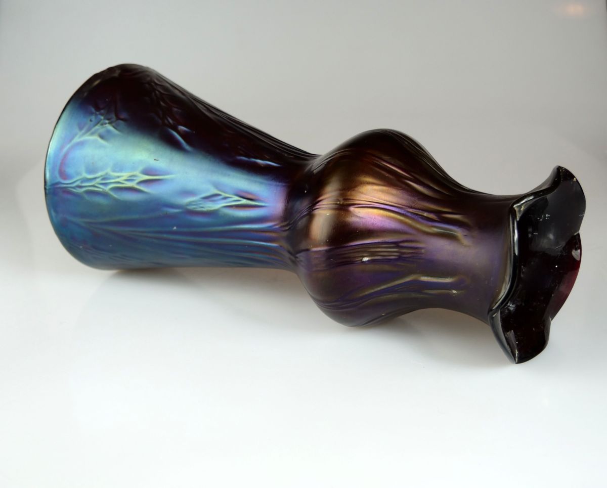 secesní skleněná váza, sytě irizované rubínové (granátové) sklo s plastickým stylizovaným rostlinným motivem, kolem r. 1910 vyrobila sklárna Rindskopf se sídlem v Teplicích, dekor ”Rindskopf Papillon I; výška 24,5 cm, průměr 11 cm; sběratelsky zajímavé