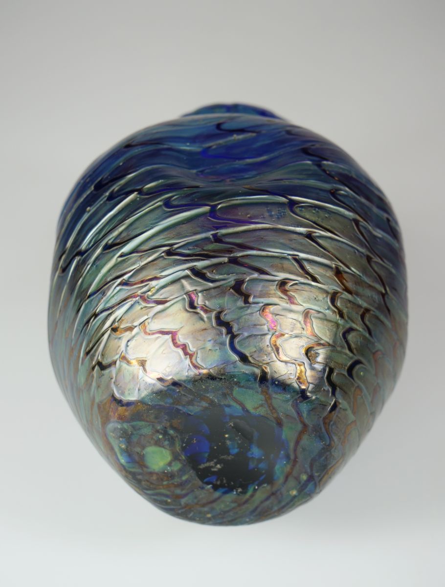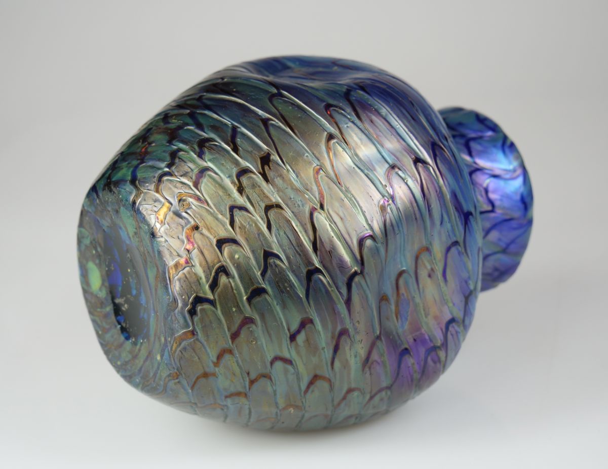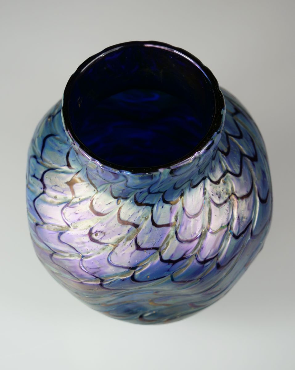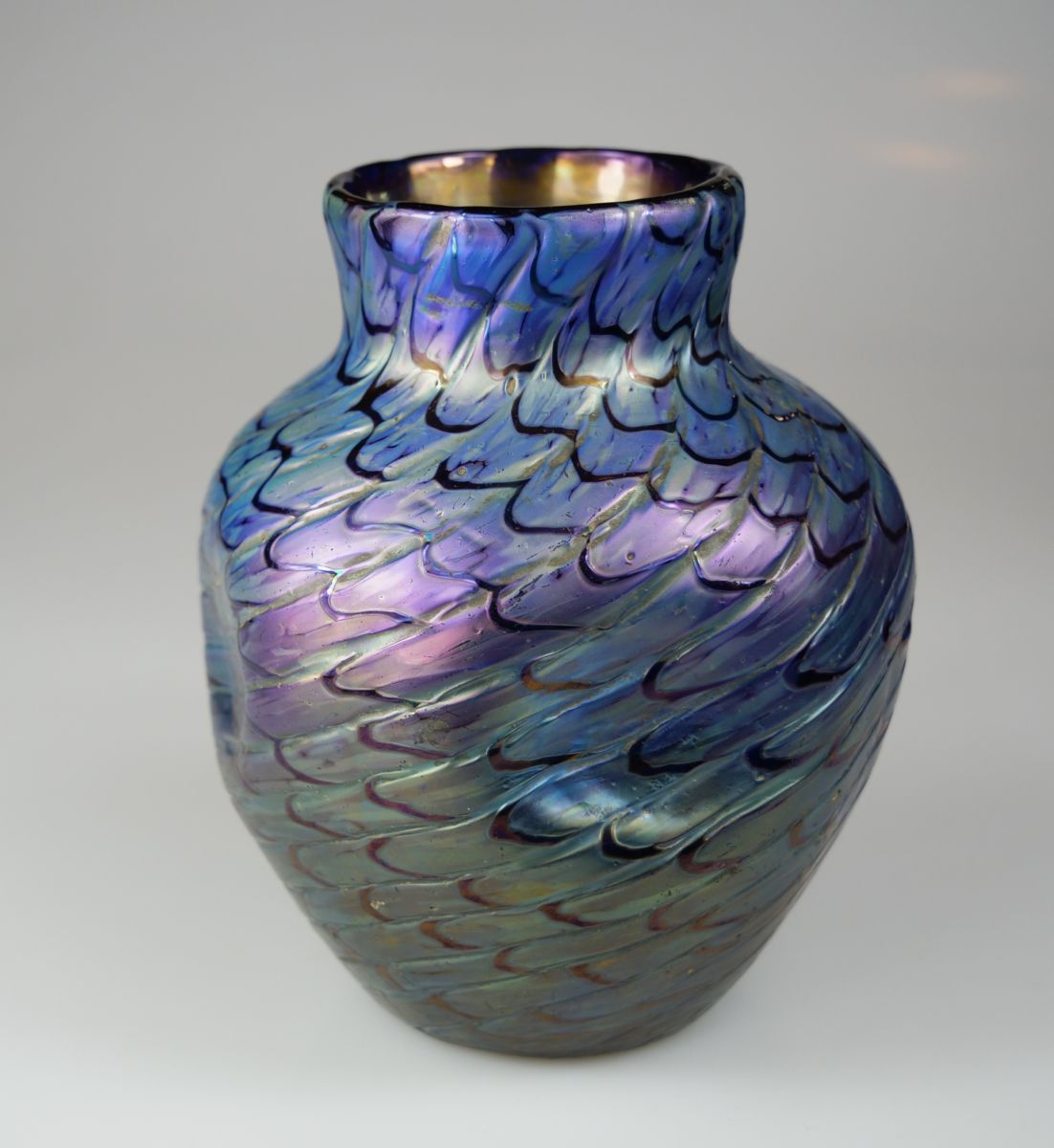 secesní váza šumavské sklárny Lenora – Wilhelm Kralik, fialové sklo s česaným šupinovým irisovaným dekorem (Fish Scales), Čechy, kolem r. 1905; výška 13 cm, průměr 11,5 cm; sběratelsky zajímavé