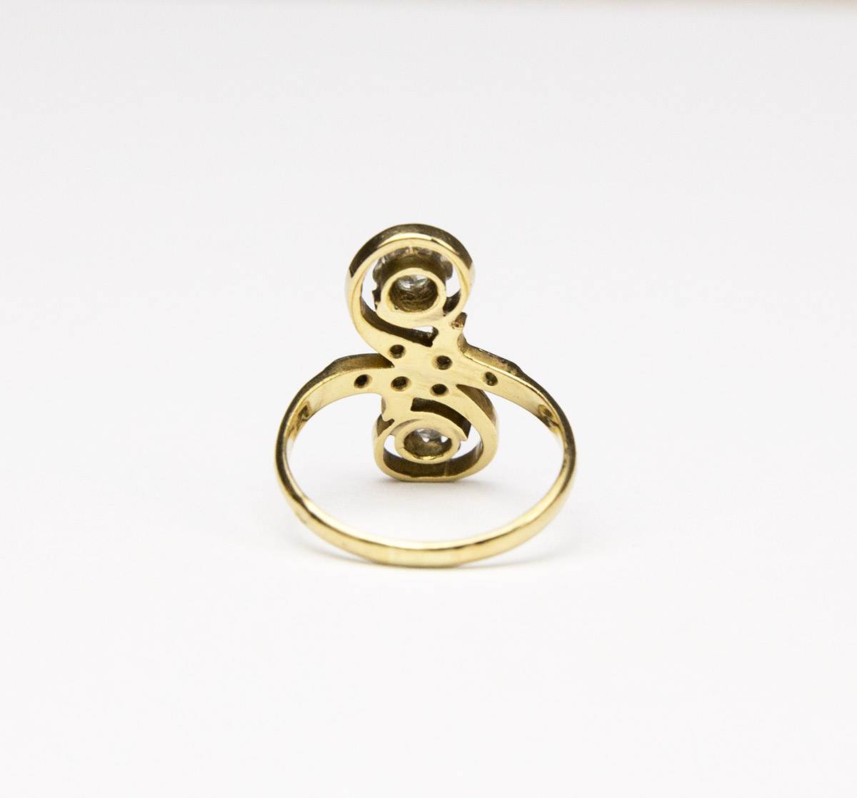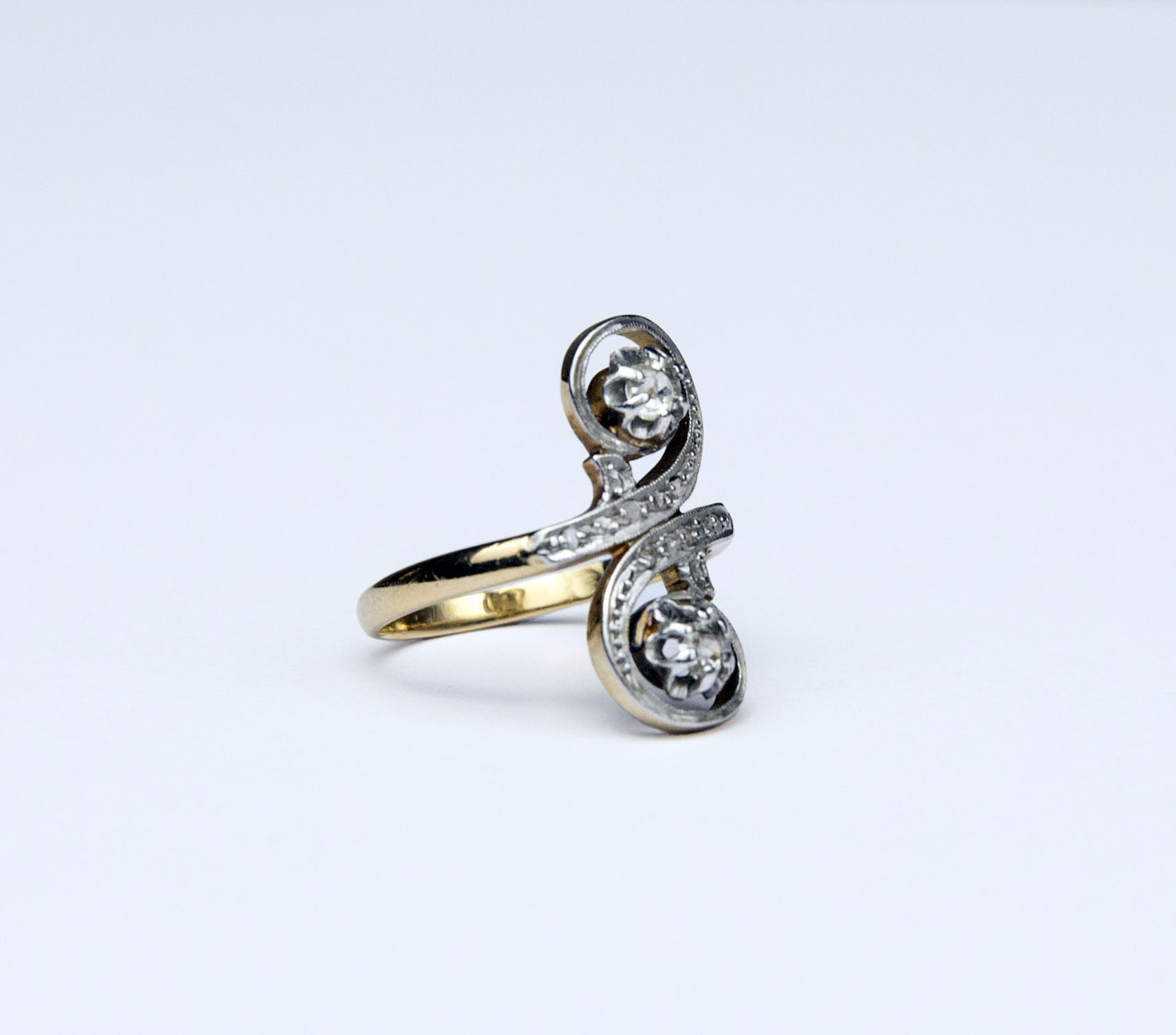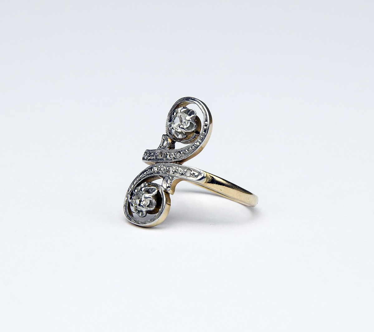 secesní zlatý prsten s diamanty, 2 diamanty briliantového starého brusu o celkové hmotnosti cca 0,2 ct, 4 diamanty routového brusu, Au + Pt 4,09 g/750+950/1000, osvědčení Puncovního úřadu. Francie, kolem r. 1910, velikost prstenu 53