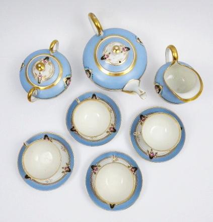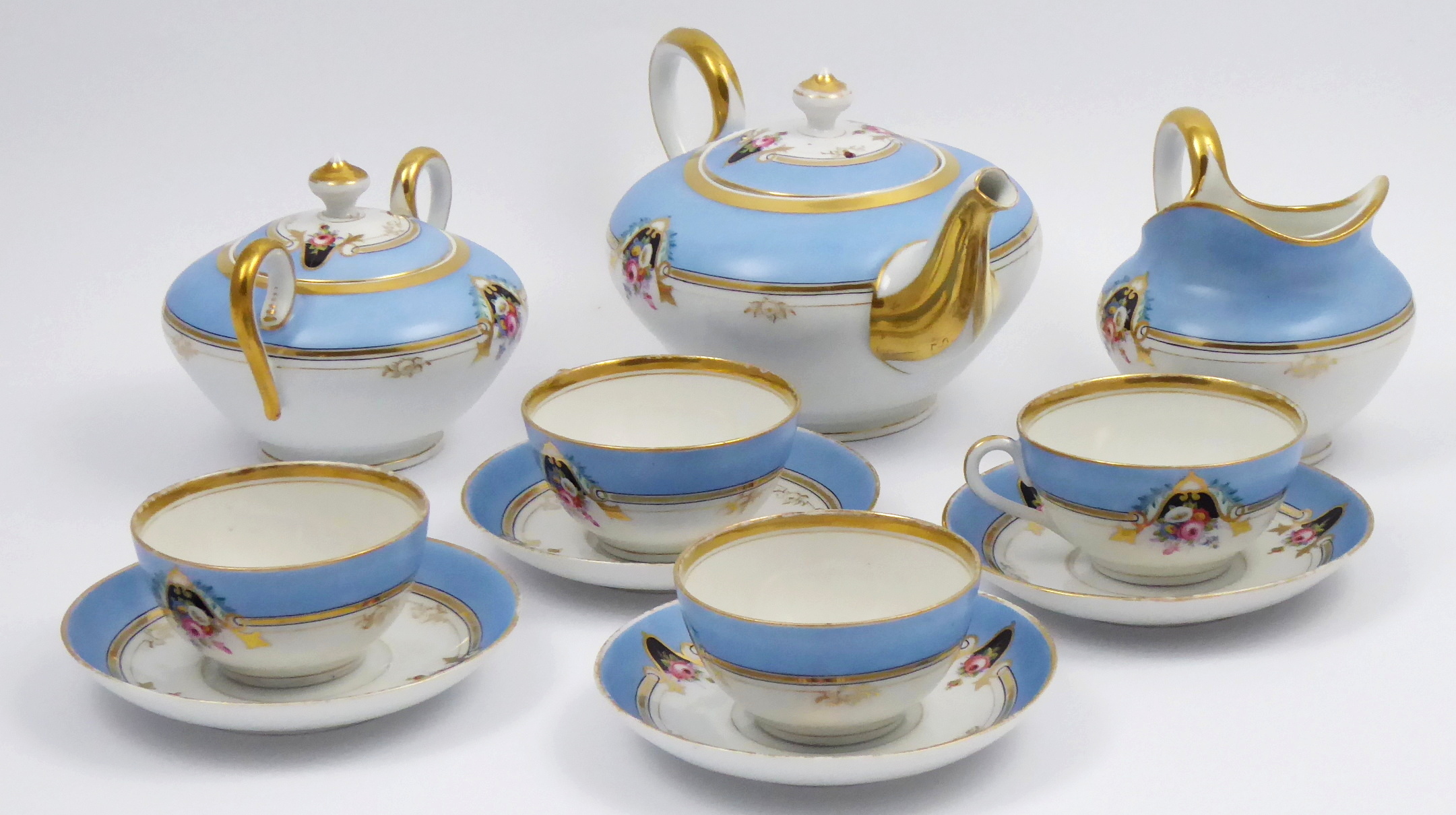 Bílý, barevně ručně malovaný a zlacený porcelán. Porcelánka Doccia Porcelain Manufactory nedaleko italské Florencie založená roku 1720. Nápojová porcelánová souprava složená ze čtyř šálků s podšálky, konvice, konvičky na mléko a cukřenky italské provenience z dílen porcelánové manufaktury Doccia. Souprava zdobená širokými bleděmodrými pásy a ručně zlacenými festony s barevnými kyticemi umístěnými částečně na černém poli. Zlacení místy mírně setřelé a lepený poškozený úchyt u cukřenky. Značeno zespodu: vtlačená hvězdička. Itálie, Doccia 1840 – 1860. Výška šálků 6 cm, průměr podšálků 16 cm, výška konvice 14 cm, výška konvičky na mléko 13 cm a výška cukřenky 13 cm.