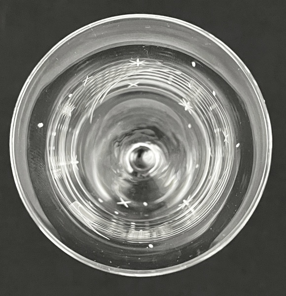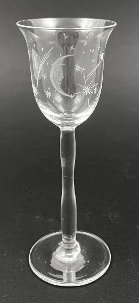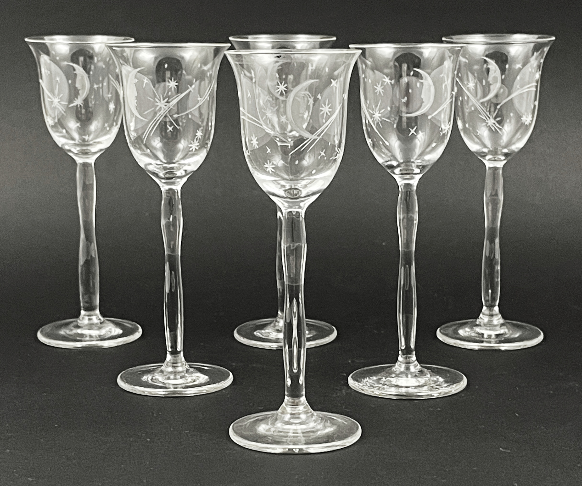 Bezbarvé ručně broušené tenkostěnné sklo. Období a styl: art deco a prvky vídeňské secese. Haida (Nový Bor) nebo Steinschönau (Kamenický Šenov) nebo Alois Metelák (1897-1980) spolu se studenty tehdejší Státní odborné sklářské školy v Železném Brodě. Ovlivněno tvorbou slavného vídeňského architekta a designéra Josefa Hoffmanna (1870-1956). Zvláště jeho návrhy mušelínového nápojového skla pro firmy J. & L. Lobmeyr, které byly často vyráběny v Čechách. Sada šesti skleniček na likér s kupou ve tvaru kalichu zdobená ručně broušenými hvězdičkami a kometami. Stylová profilovaná vysoká nožka zakončená kulatou patkou. Ve výborném stavu. Čechy 1925 – 1935. Výška 13 cm.