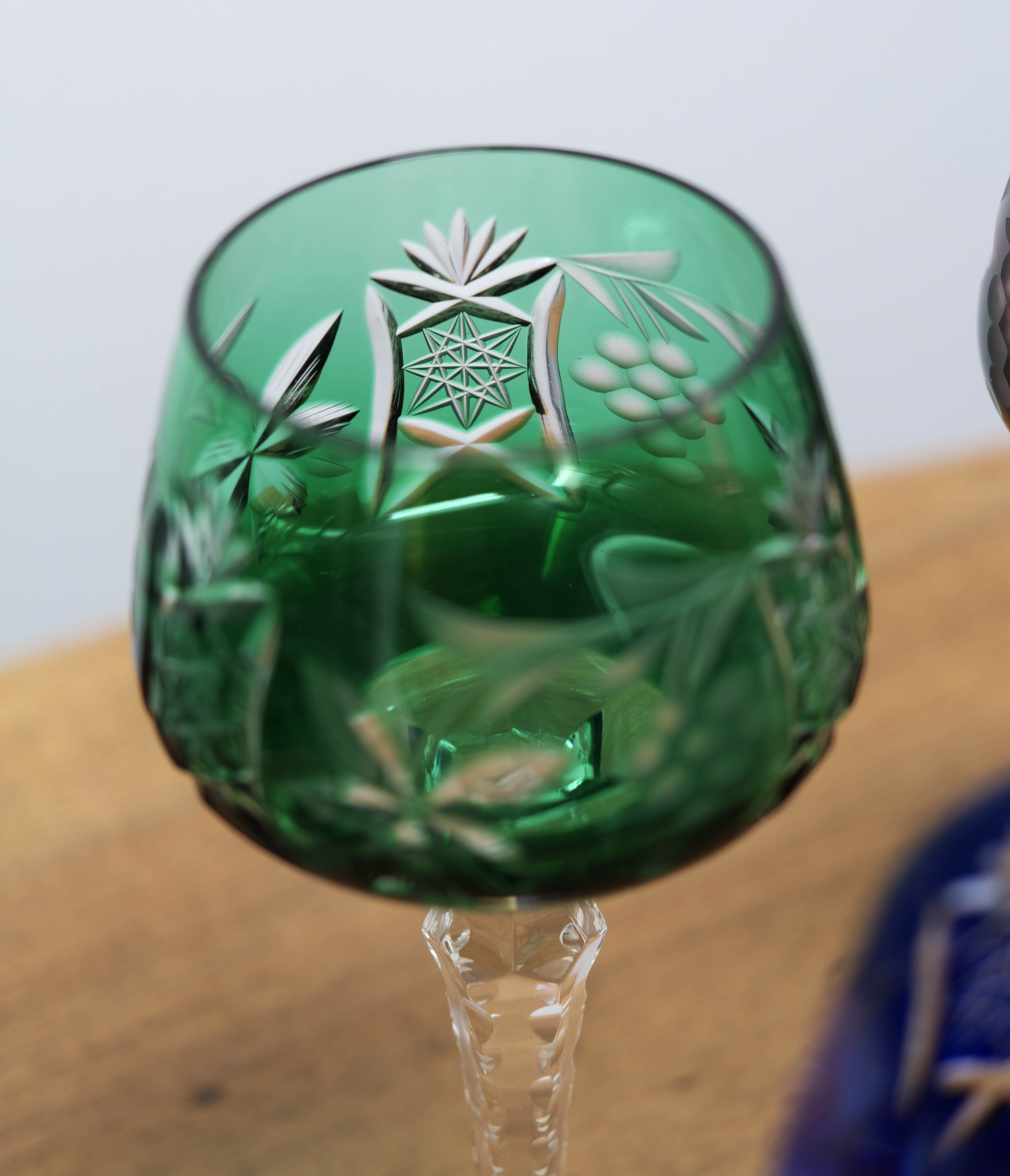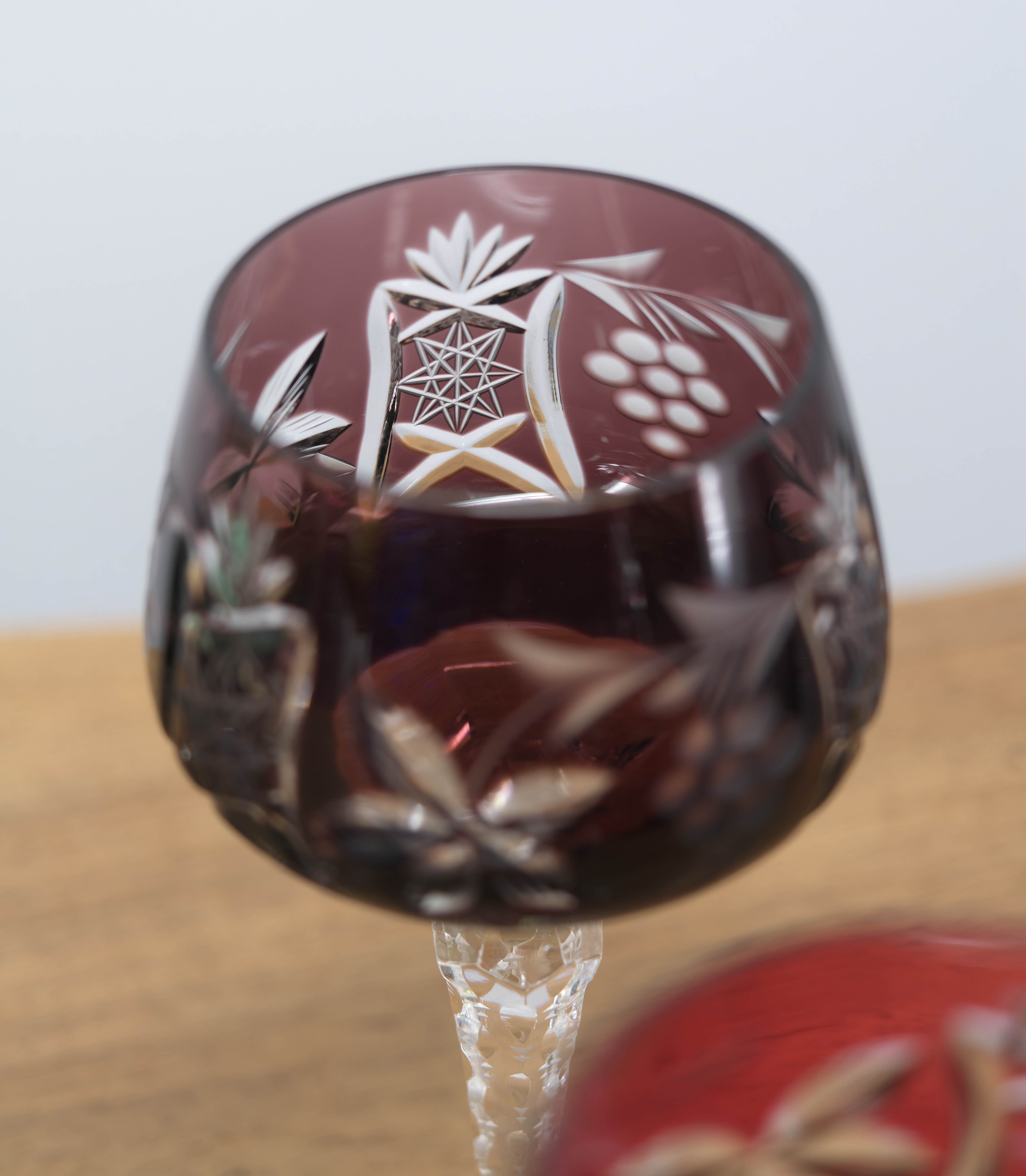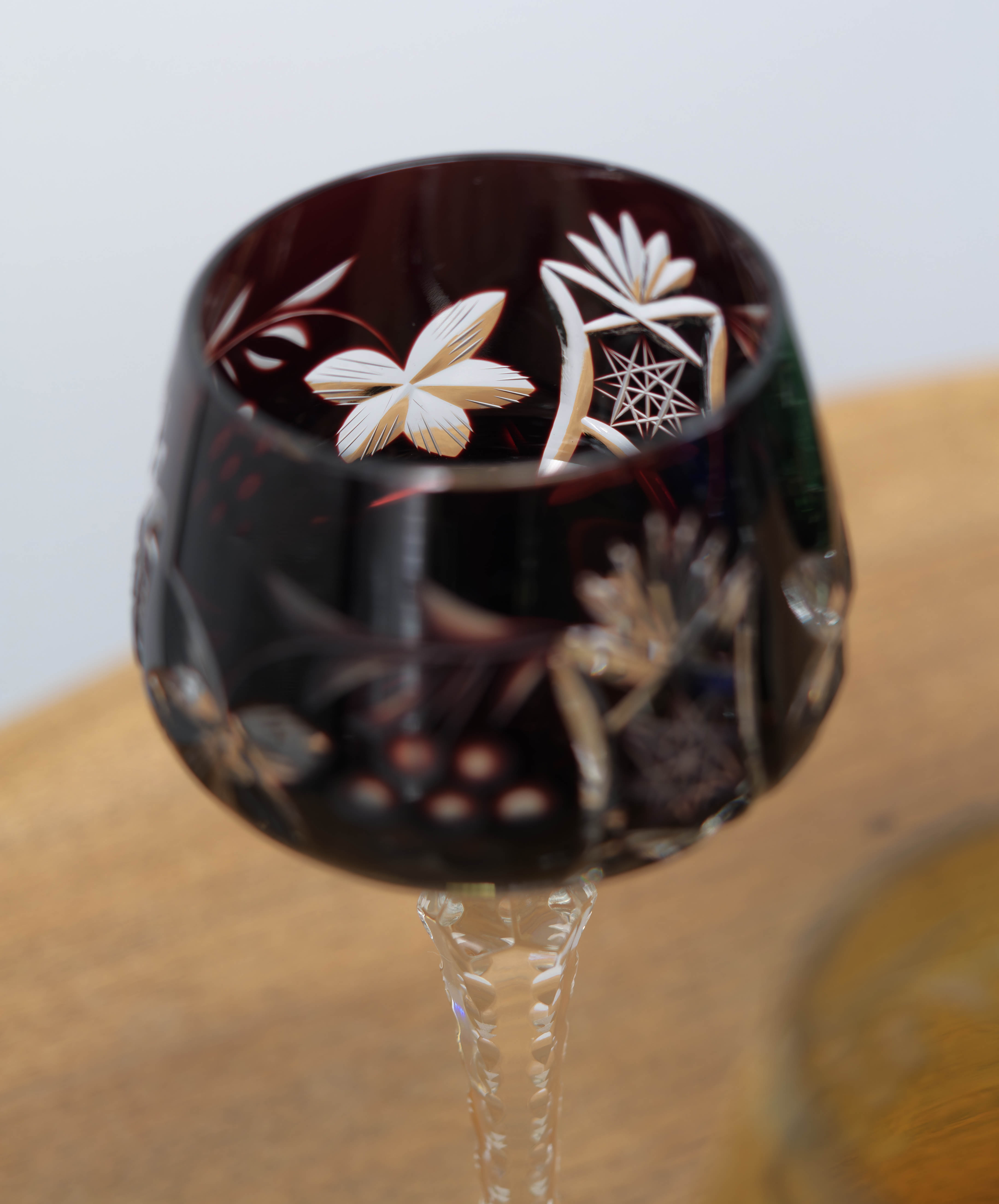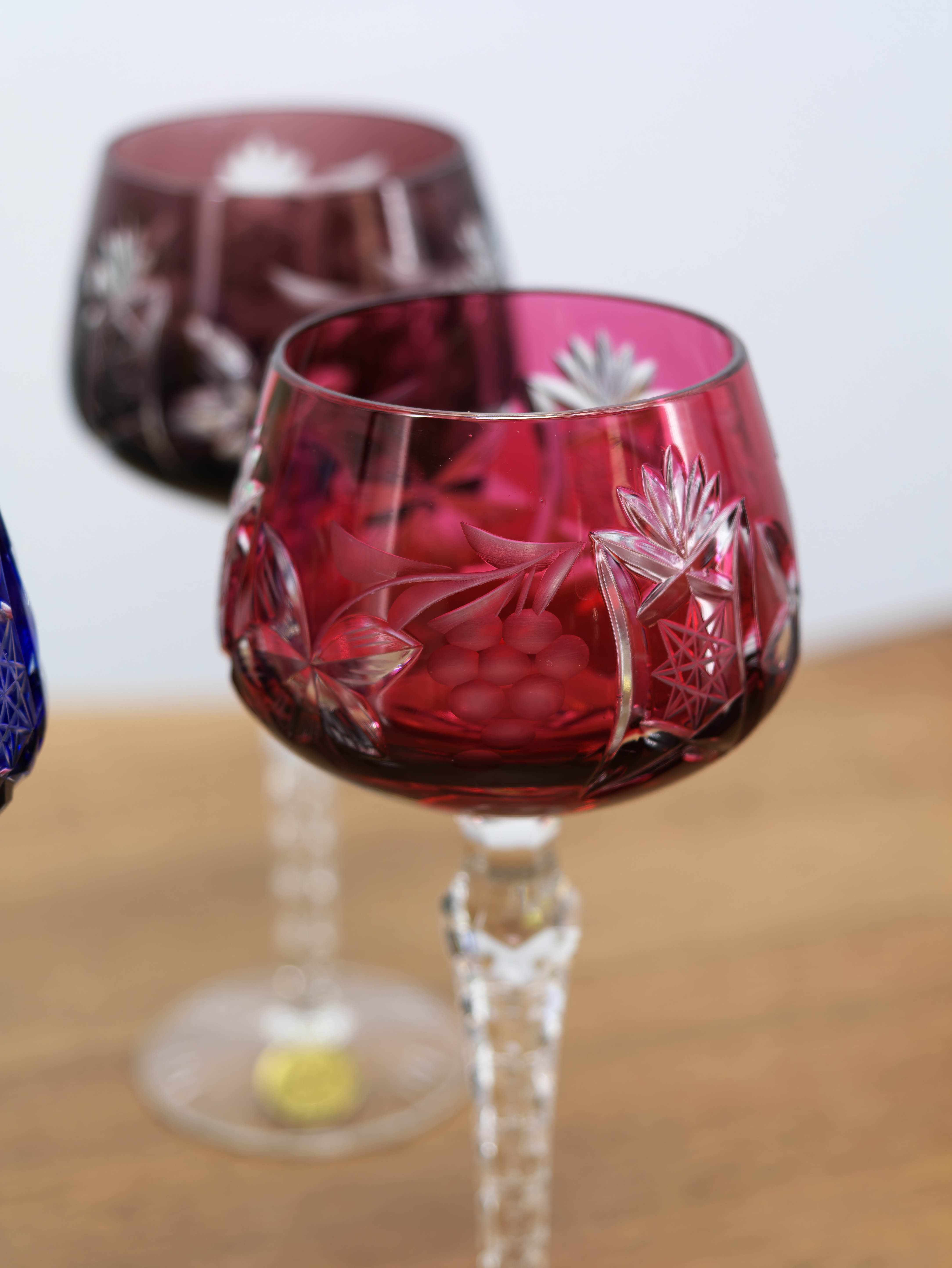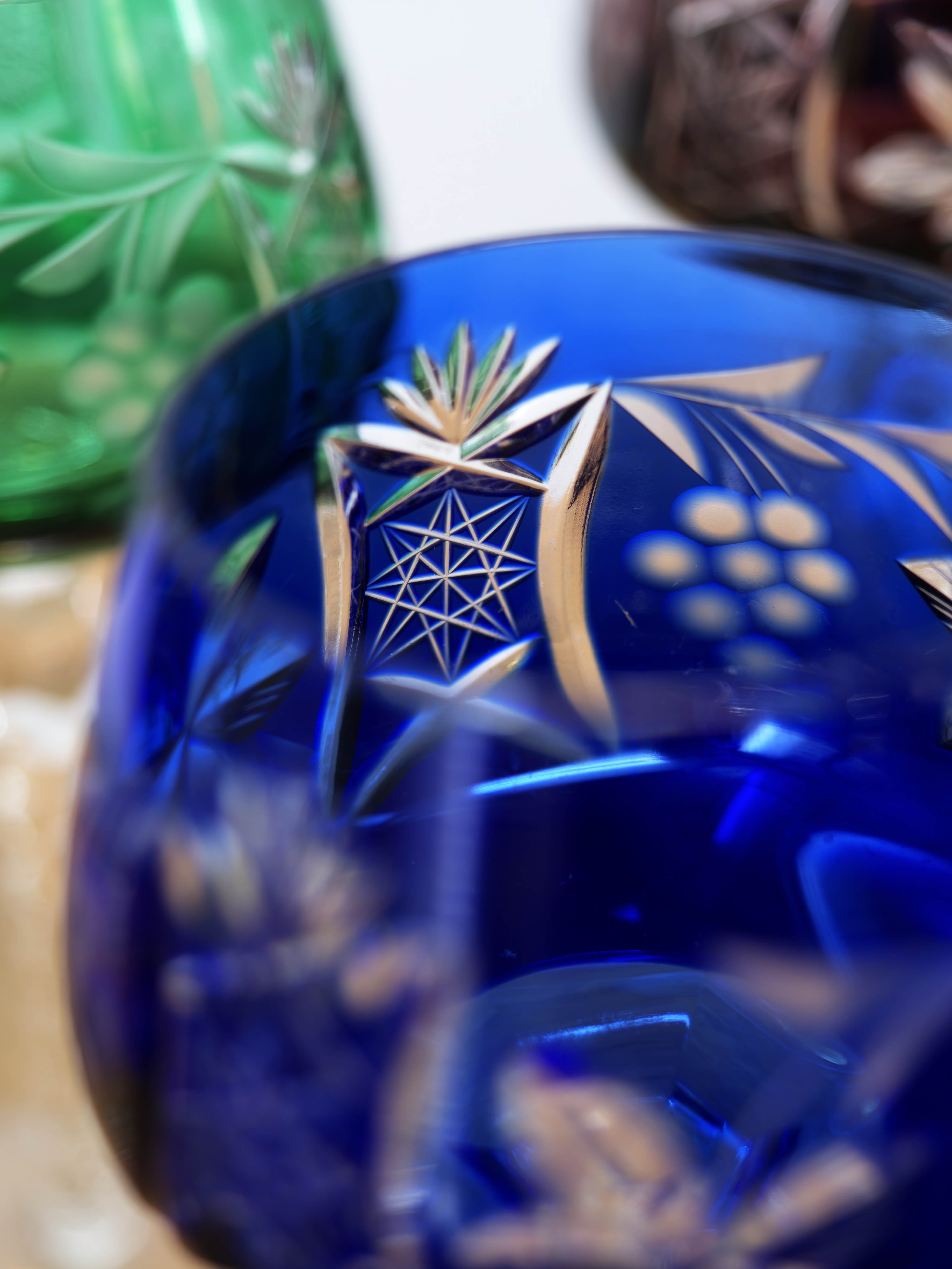 Kalichy jsou provedeny v různých barevných odstínech, které spolu tvoří harmonický a dekorativní celek. Povrch zdobí bohatý ruční brus s hvězdicovými, geometrickými a stylizovanými rostlinnými motivy, doplněný fazetovanými detaily na okraji kalichu. Všechny brusné plochy jsou pečlivě leštěny, aby vynikla hloubka řezu i hra světla z každého úhlu.