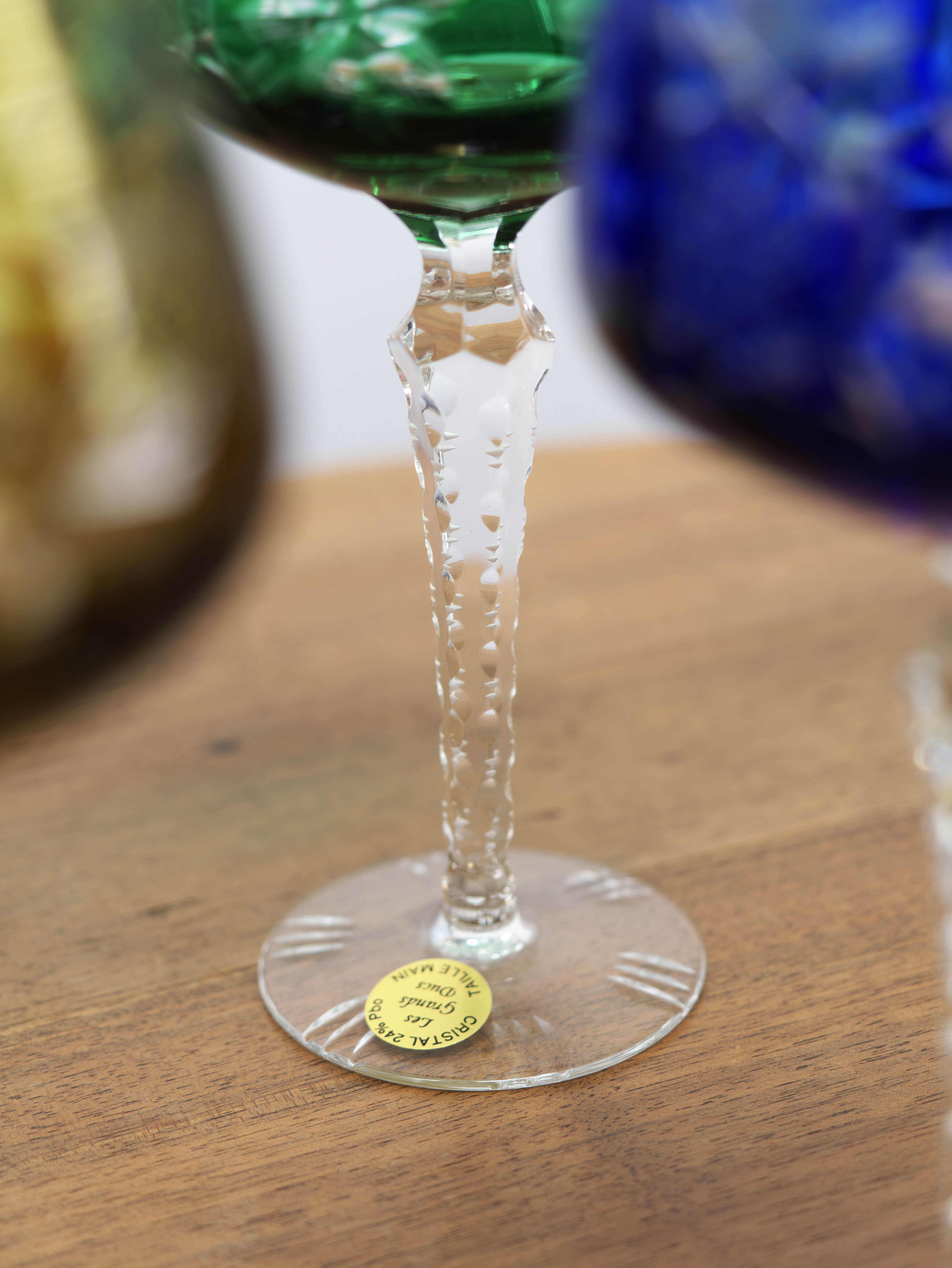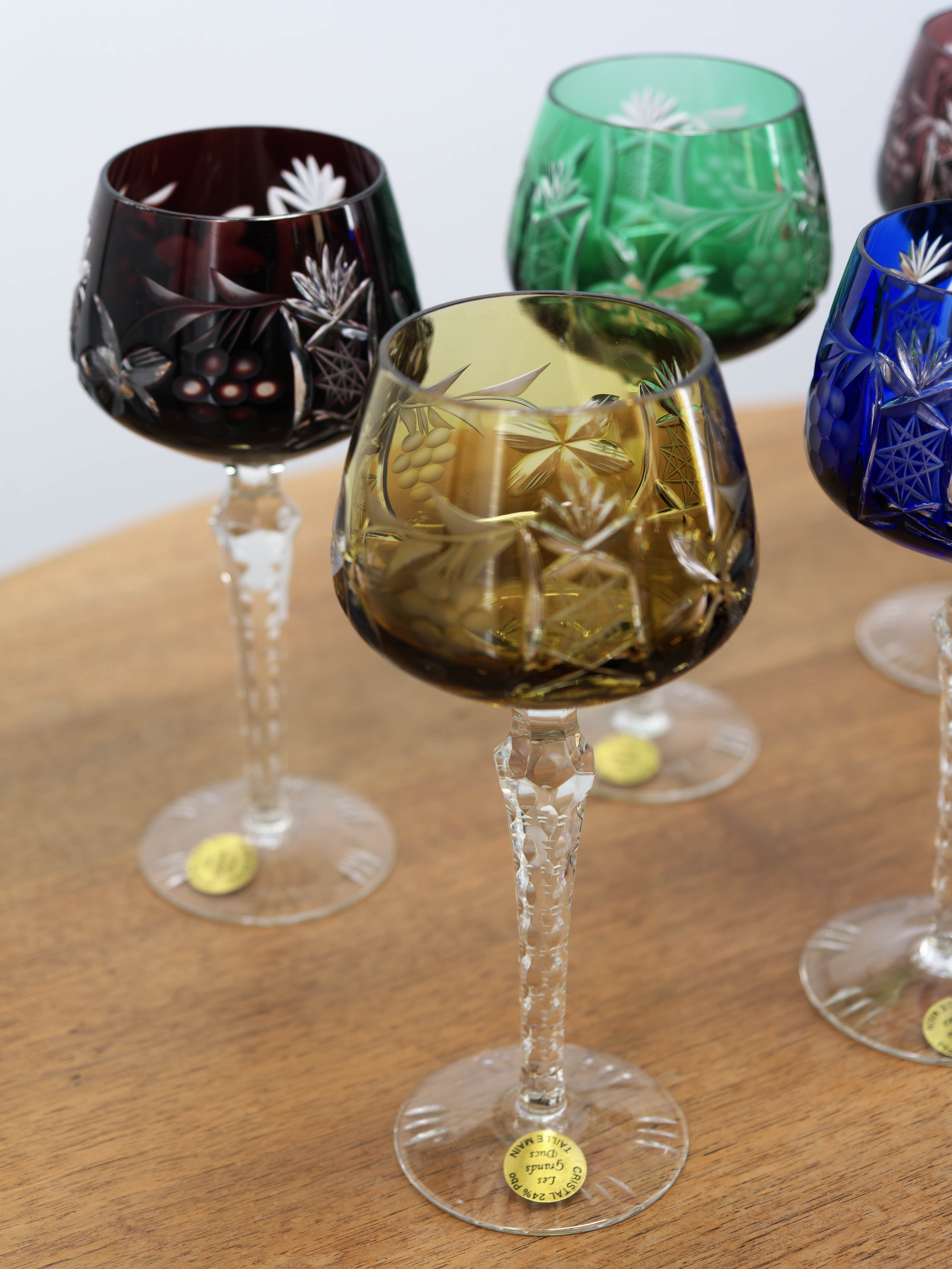 Soubor šesti křišťálových sklenic z barevného olovnatého křišťálu představuje ukázku precizní francouzské sklářské práce druhé poloviny 20. století. Sklenice pocházejí z produkce manufaktury Les Grands Ducs v oblasti Lorraine, která se specializovala na ručně vyráběný a ručně broušený křišťál nejvyšší kvality.