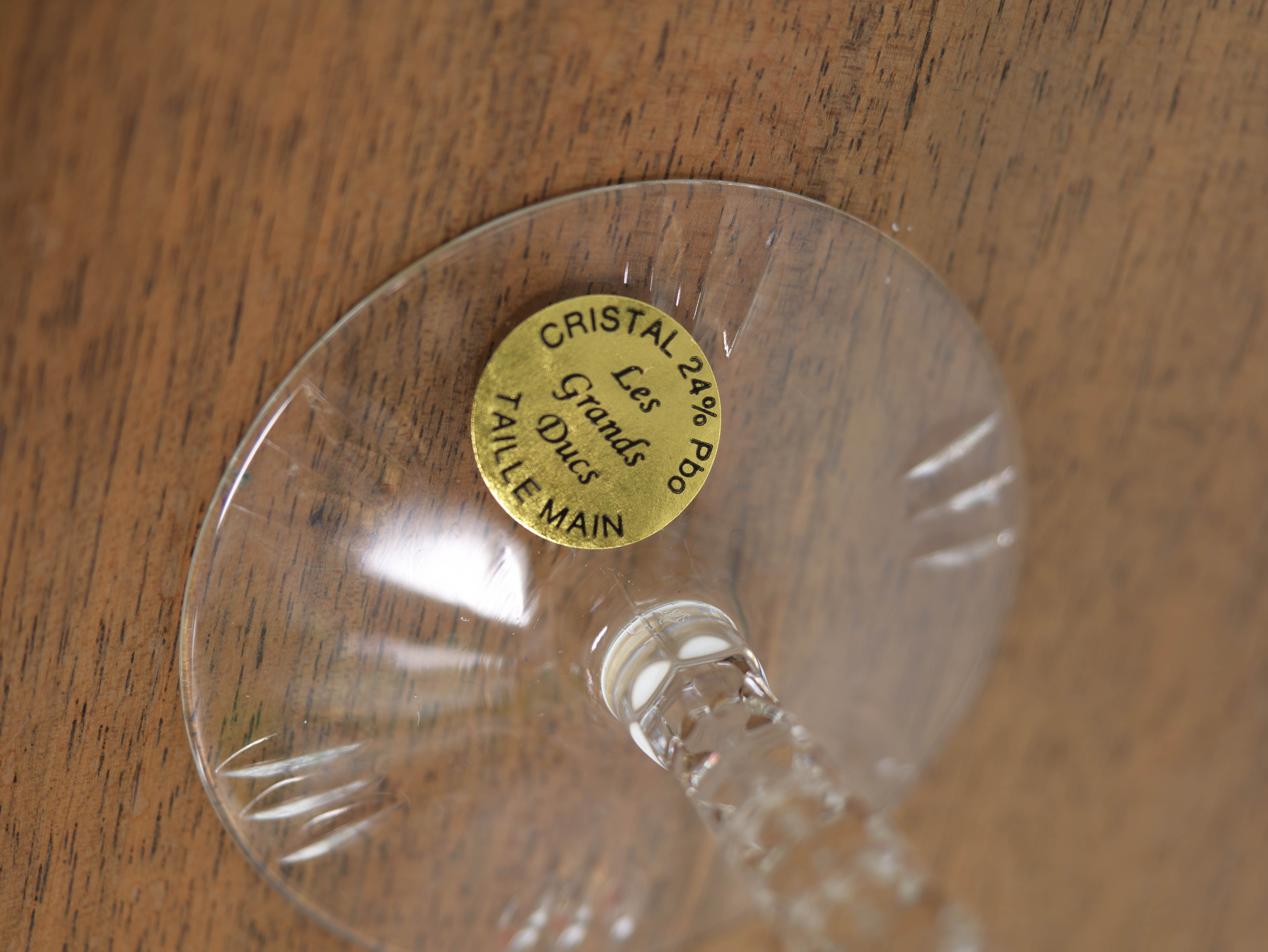 Elegantní, štíhlé nožky z čirého křišťálu plynule přecházejí v stabilní patky. Na spodní straně jsou dochovány původní výrobní etikety, potvrzující původ, ruční zpracování a kvalitu materiálu.