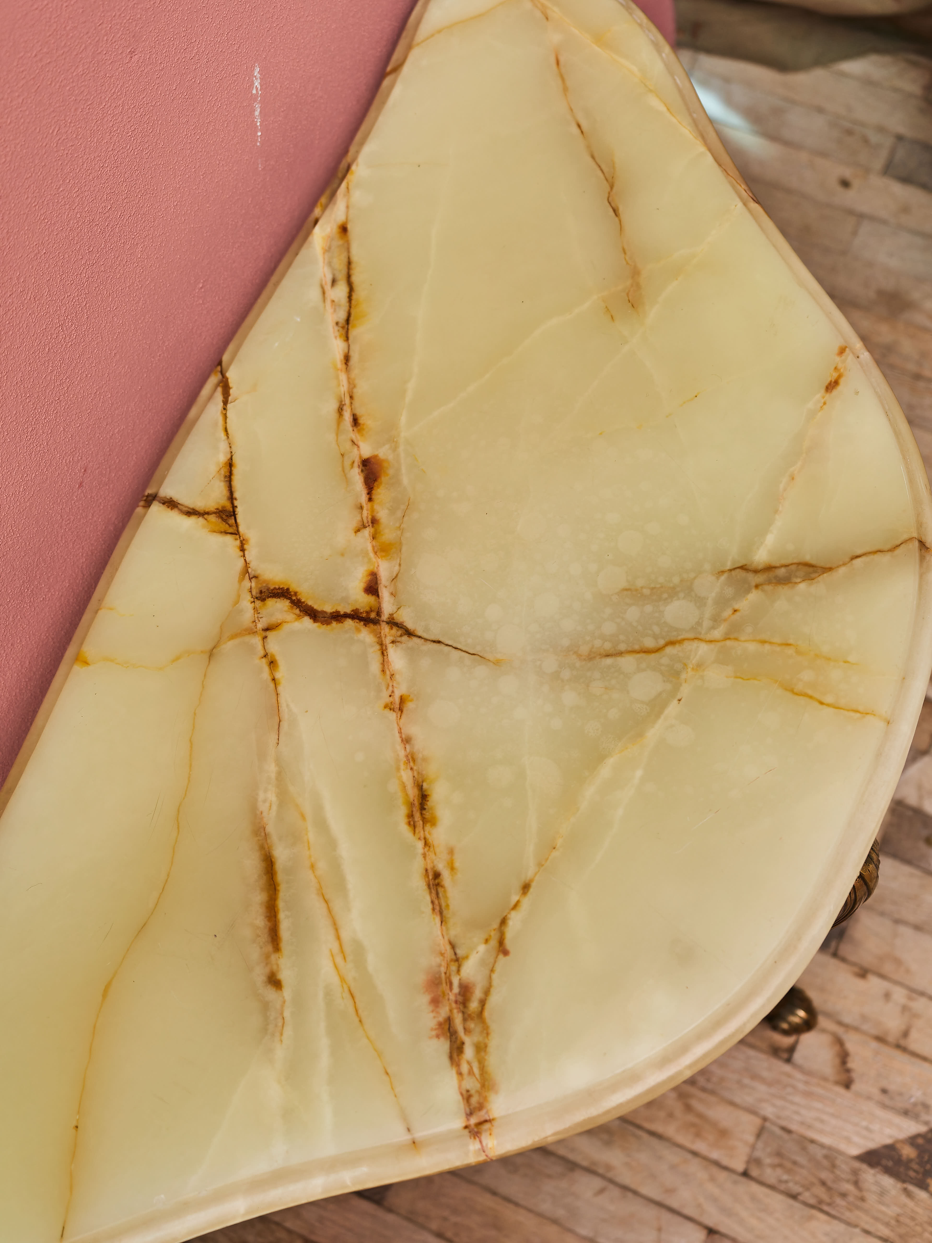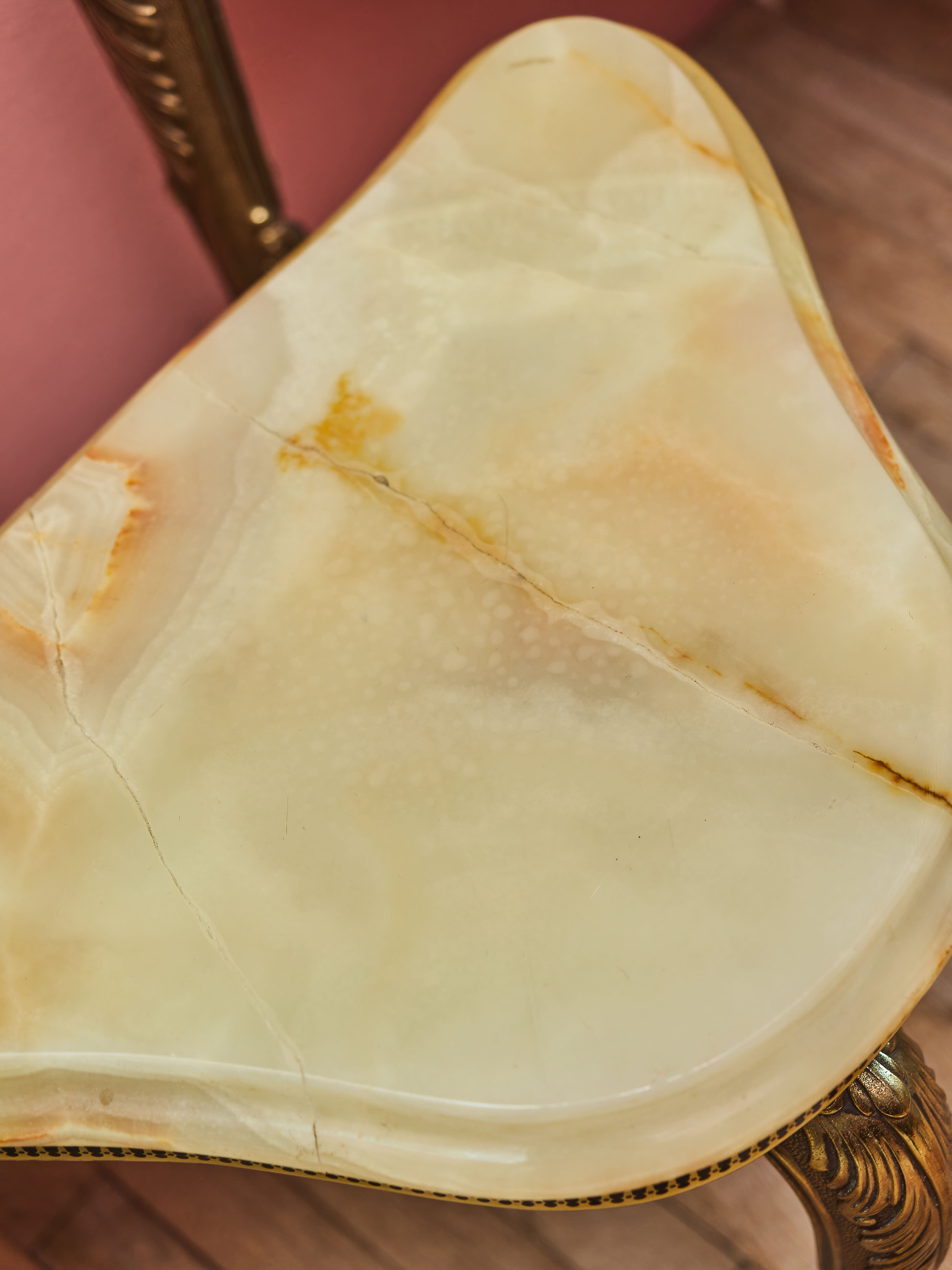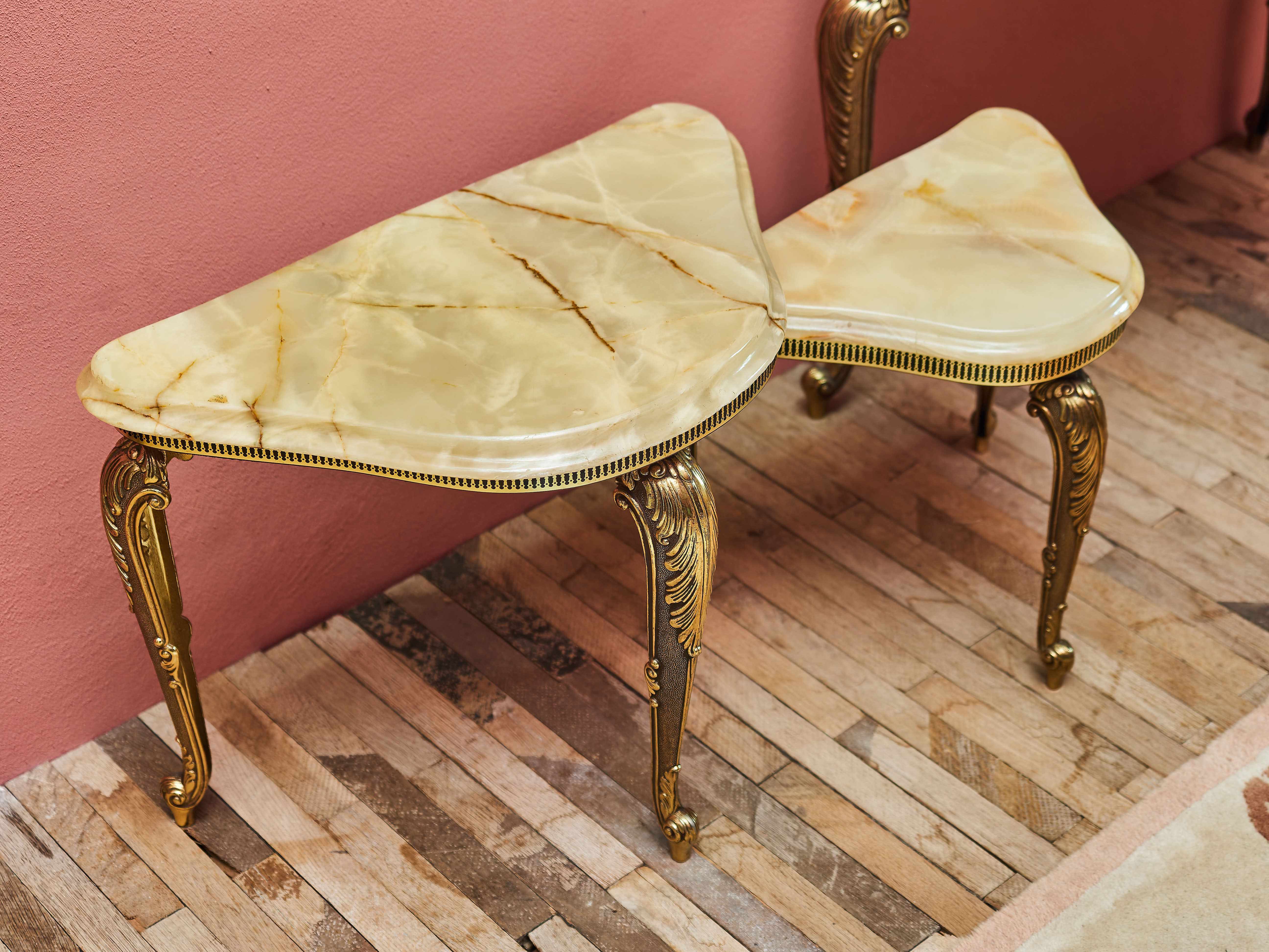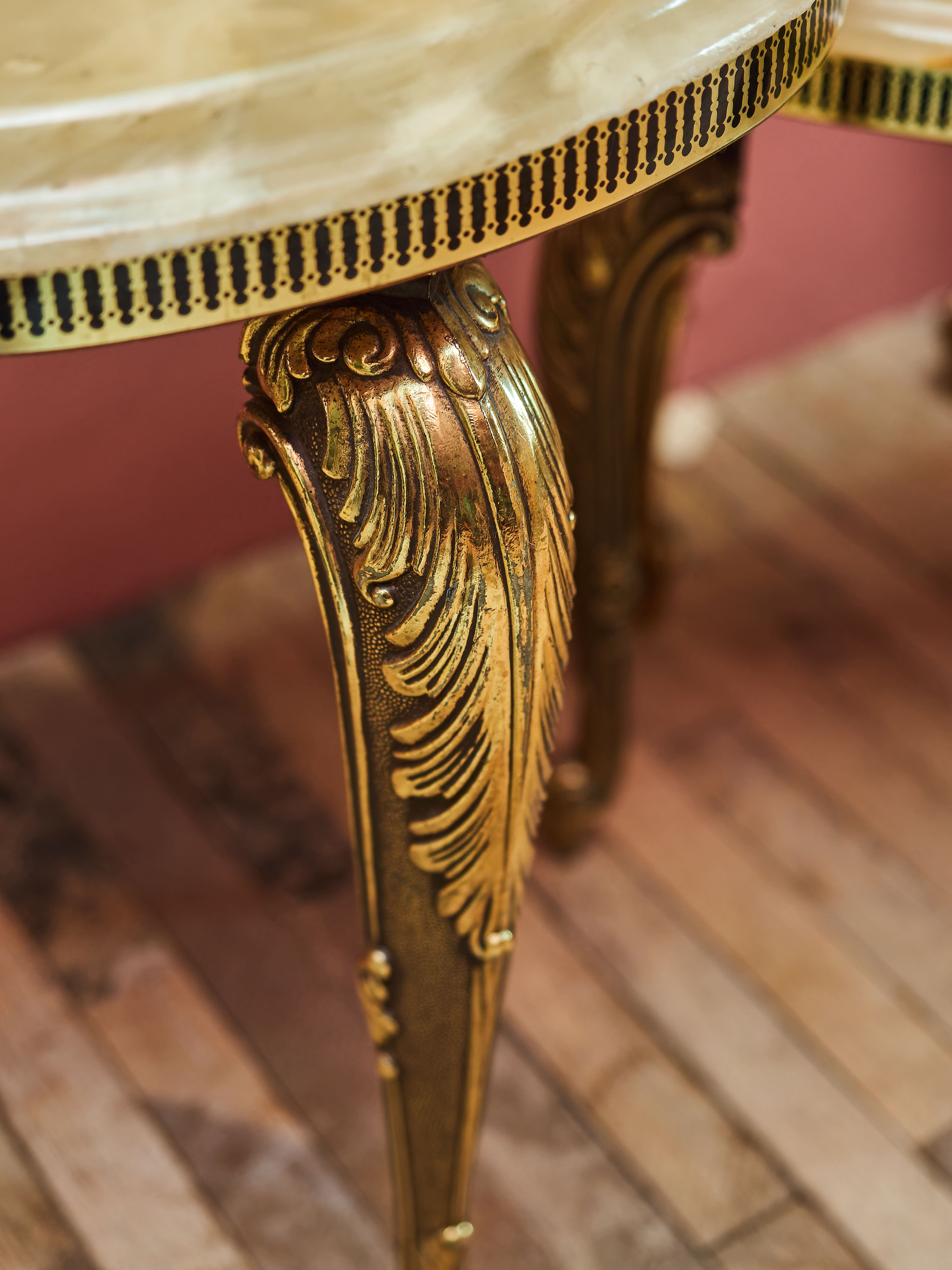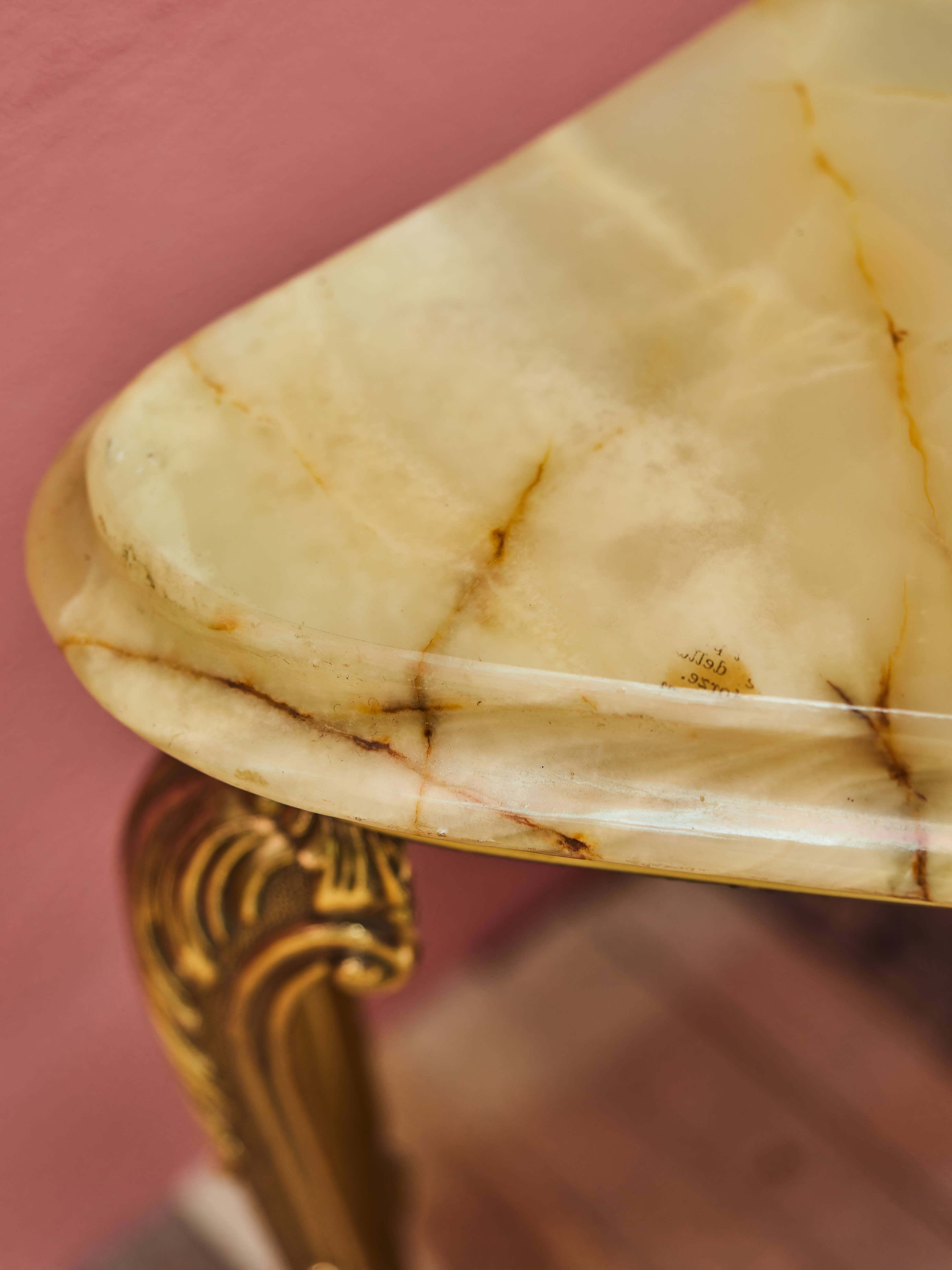 Velmi dekorativní a šikovné stolky z onyxu a mosazi. Stolky jsou odborně zrestaurované v dílně uměleckého kameníka. Vrchní desky mají fasetované okraje. Podnoží z lité mosazi ve stylu Ludvíka XV s akantovými listy a spodními volutami. Ideální do obývacího pokoje k sedací soupravě. Stolky je možné složit pod sebe a zaberou minimum místa.