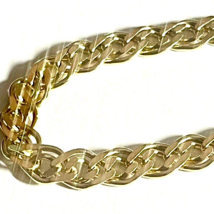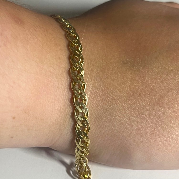 Širší zlatý náramek ze žlutého 14 karátového zlata AU 585/1000, váha náramku 9,54 gramů netto. Masivní náramek se zdvojenými články. Velmi hezký náramek v nenošeném stavu.