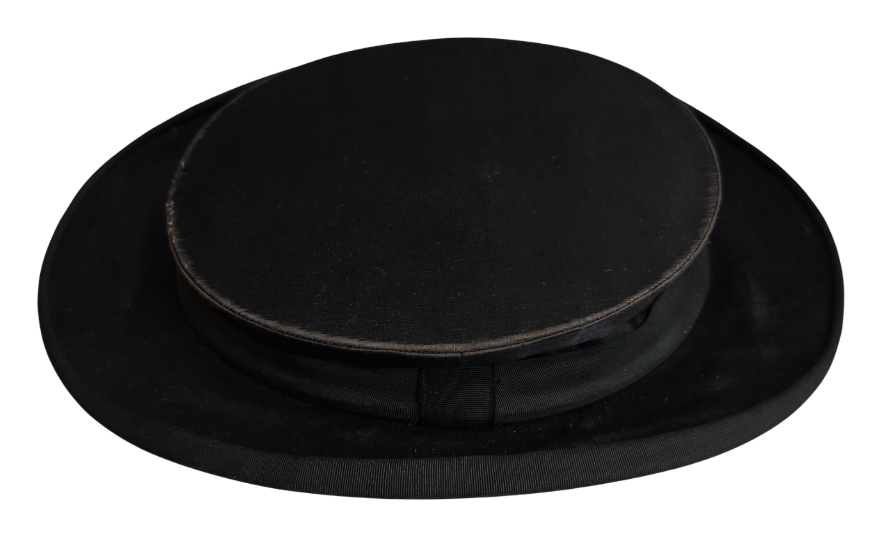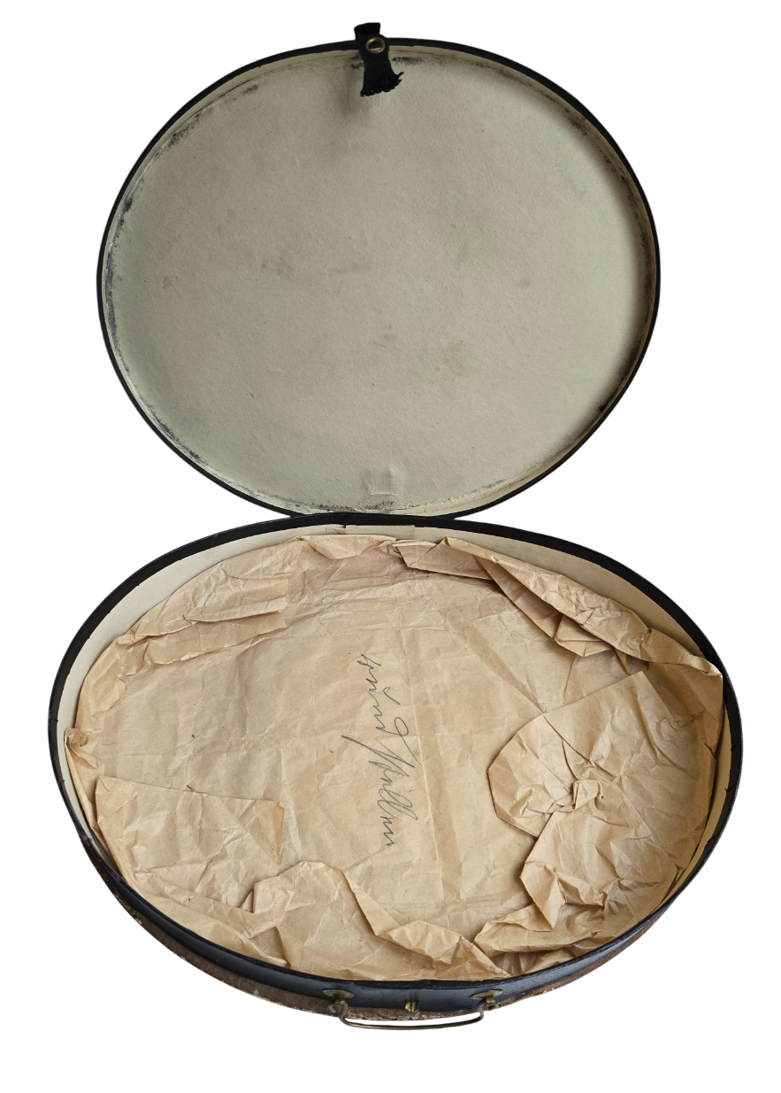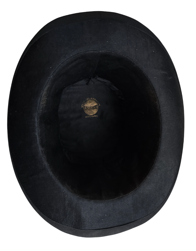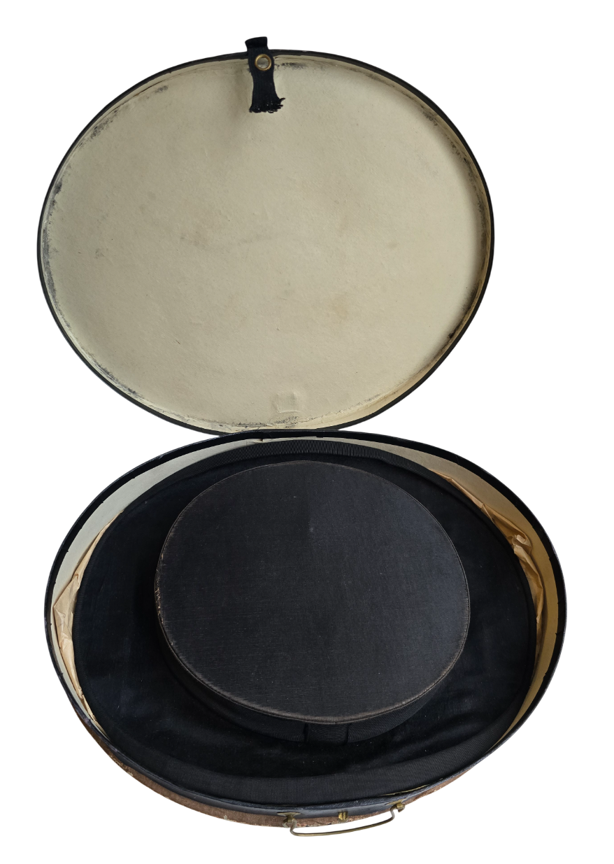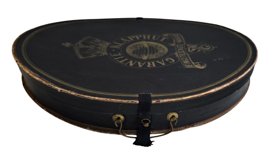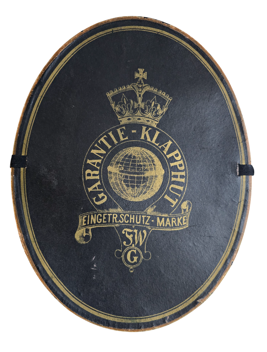 Popis: Unikátní skládací cylindr, tzv. klak. Ve starožitné původní euti se zapínáním na gumičku s háčky. Stav klaku výborný, skládací mechanismus je plně funkční. Uvnitř klobouku logo značky a nápis \“UNZERBRECHLICH Beste Marke\“ (Nerozbitný, nejlepší značka). Na etui je znatelné opotřebení, ale jinak je ve velmi dobrém stavu bez výrazného poničení. Na etui taktéž nápis výrobní značky a označení skládacího cylindru.