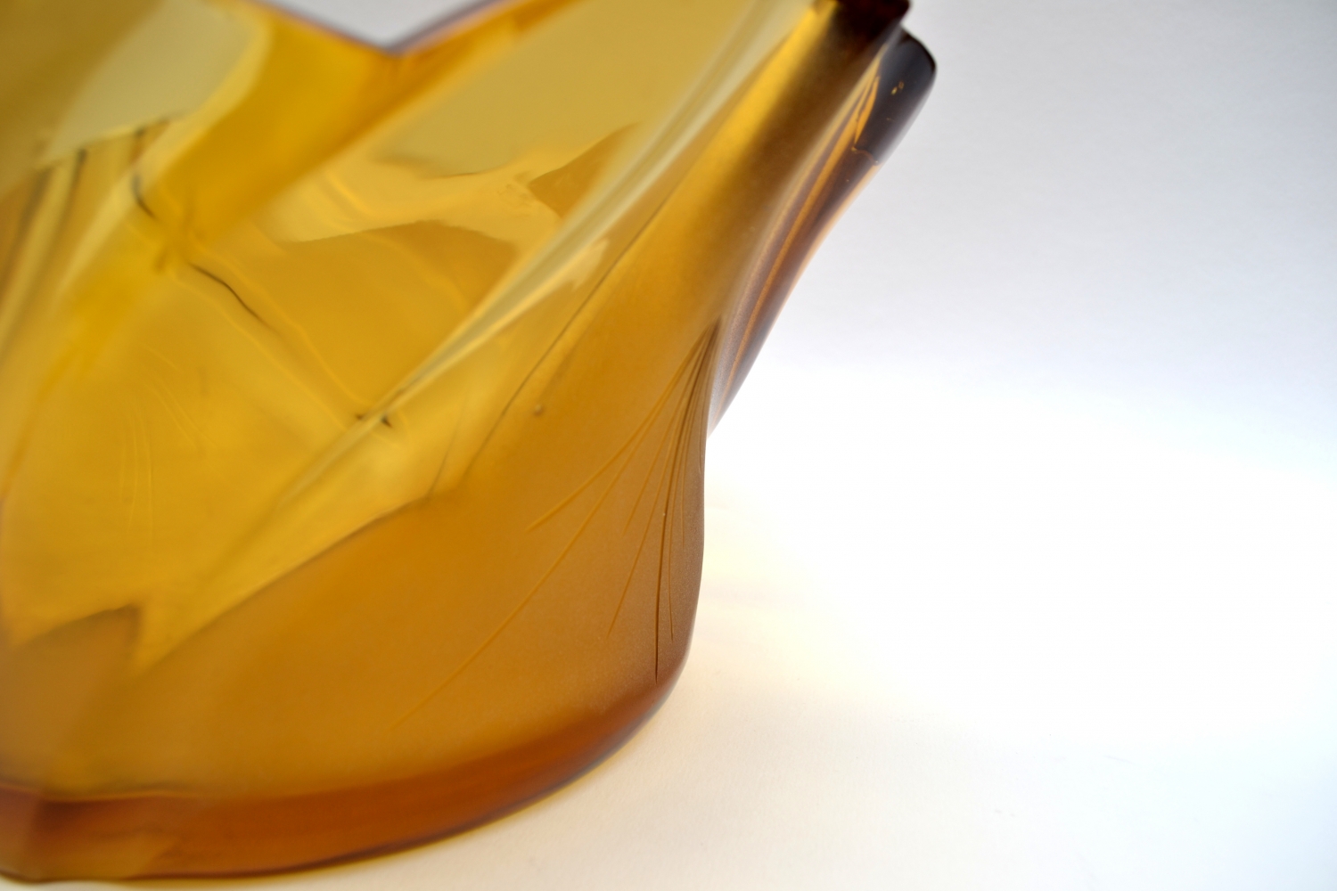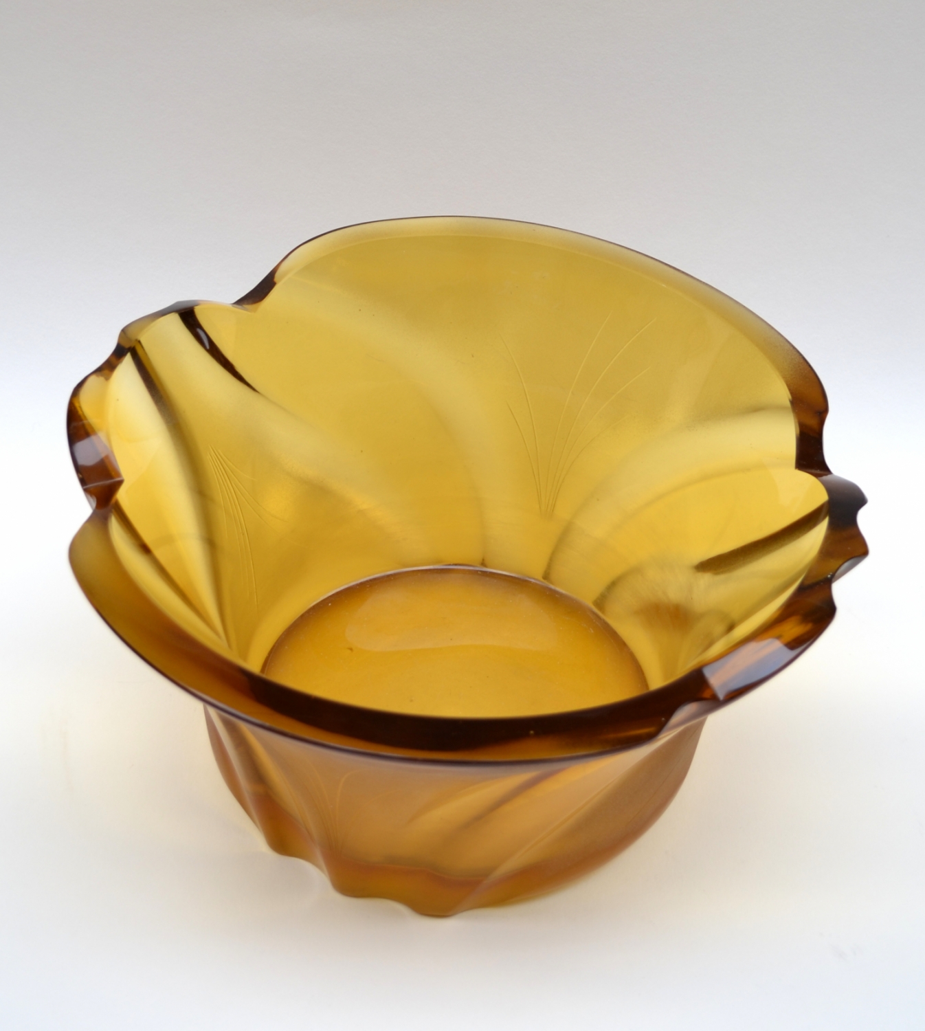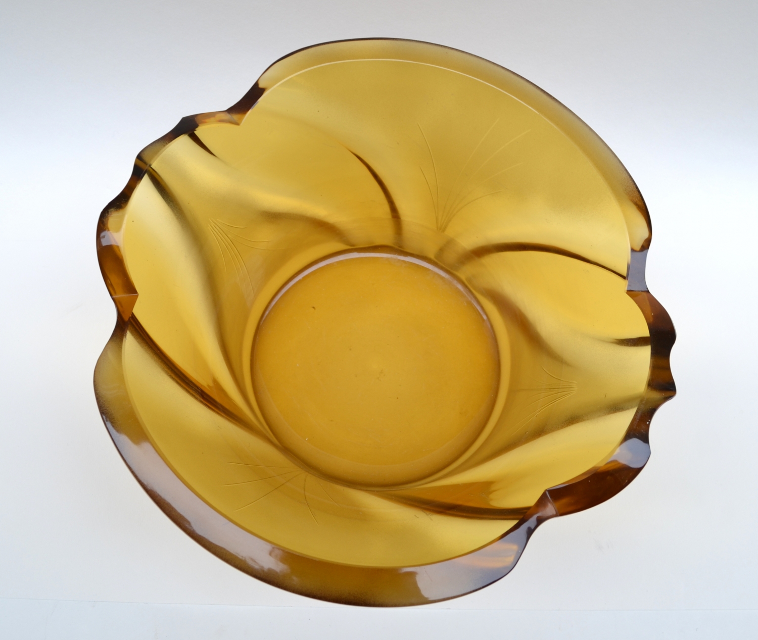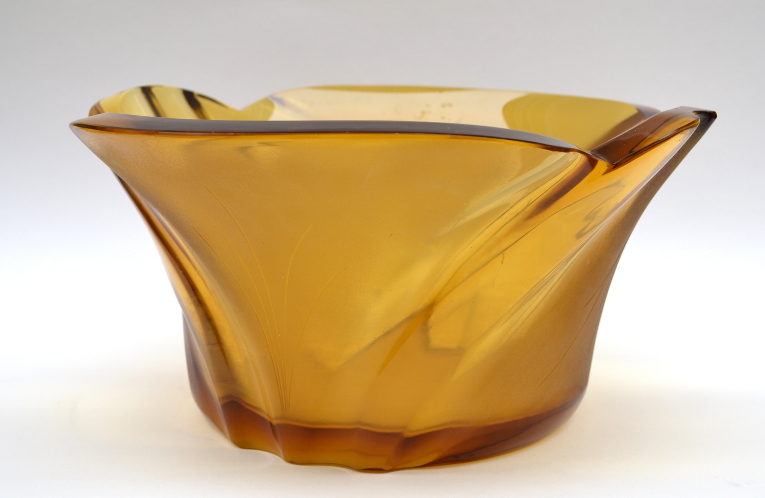 Skleněná mísa na ovoce zhotovená z medového skla. Československá provenience kolem roku 1930.