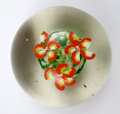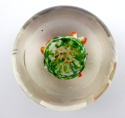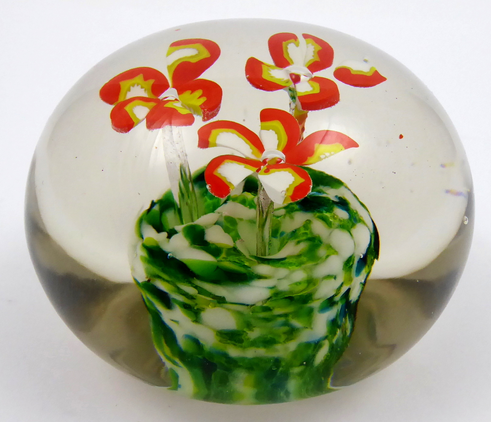 Bezbarvé a barevné sklo, leštěné. Skleněné těžítko klenutého kulatého tvaru, uvnitř se třemi barevnými kvítky v červené, bílé a zelené barevnosti. Vhodný dárek na pracovní stůl. Čechy 1910 – 1940. Výška 6 cm, průměr 8 cm.