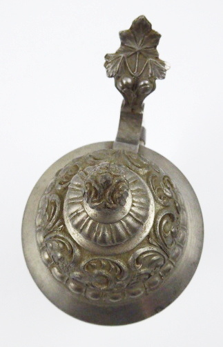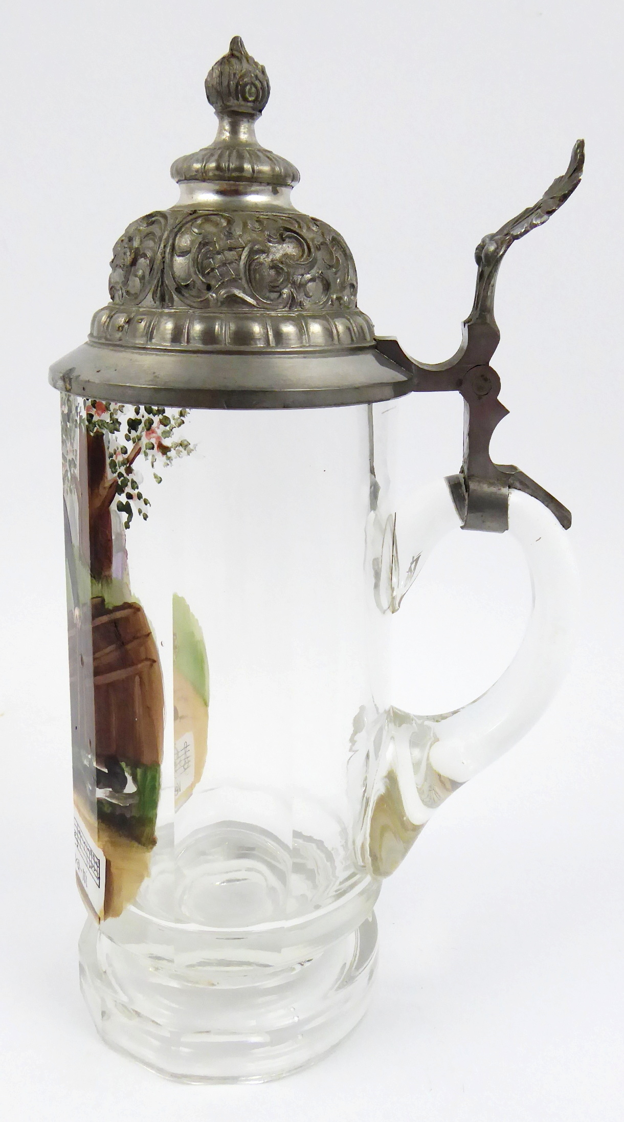 Čiré ručně broušené sklo, ruční malba emailem, cín. Korbel z čirého skla ručně broušený do svislých fazet. Centrální scenérie mileneckého páru v dobovém oděvu stojícího pod kvetoucím stromem a dole notový zápis s písní Věrné naše milování. Cínový úchyt zdoben na vrcholu listy a plody dubu, zdobně ryté cínové víko korbelu korunované rovněž žaludem. Čechy 1870 – 1910. Výška 24 cm.