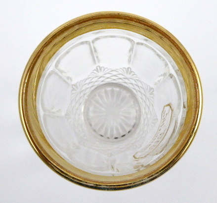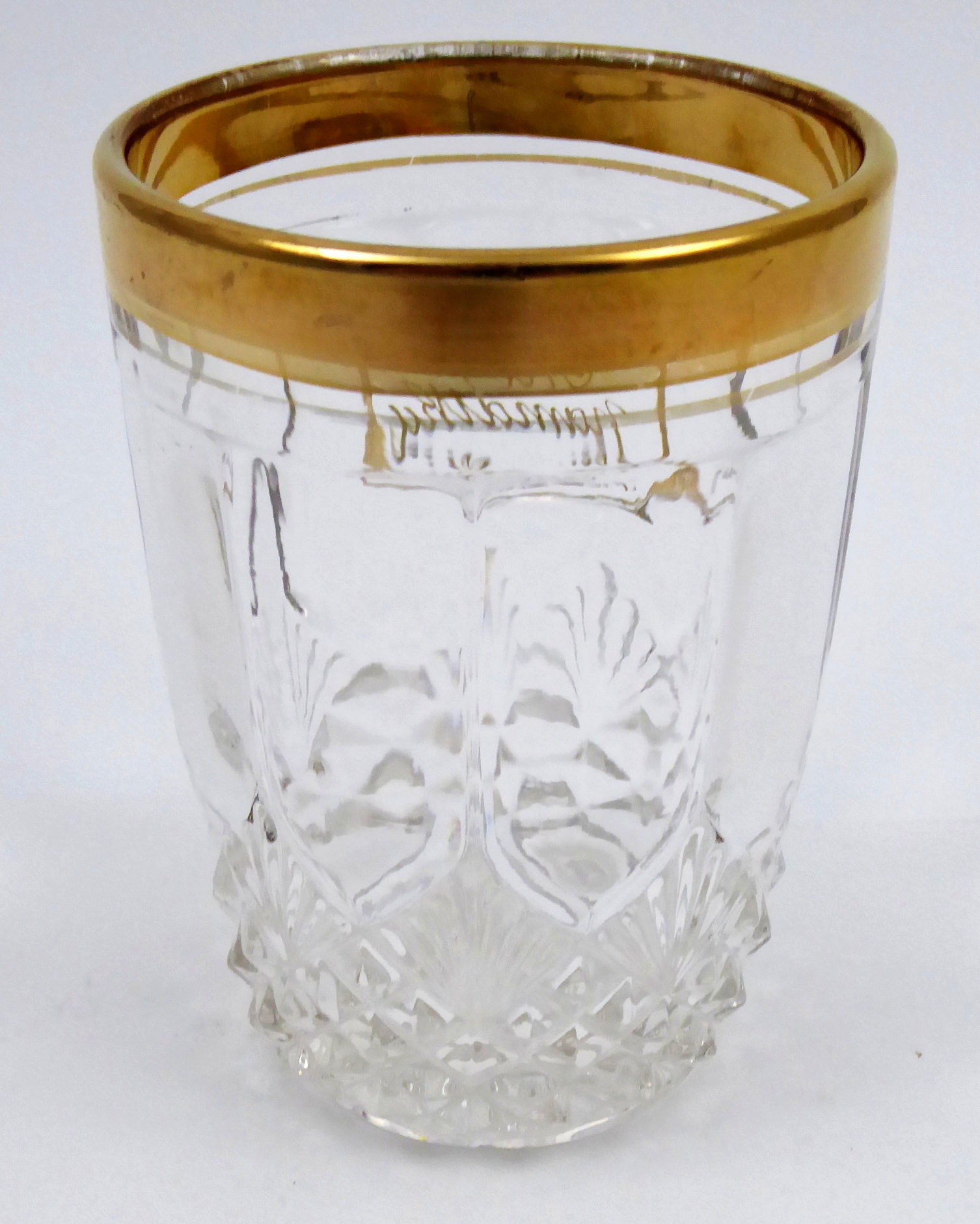 Bezbarvé lisované a zlacené sklo s ručně psaným nápisem. Sklenička z bezbarvého skla s lisovaným reliéfním dekorem stylizovaných diamantů se zlaceným horním okrajem a linkou a ručně psaným centrálním motivem v medailonu: \\\\\\\“Na památku\\\\\\\“. Čechy 1900 – 1930. Výška 10,5 cm.