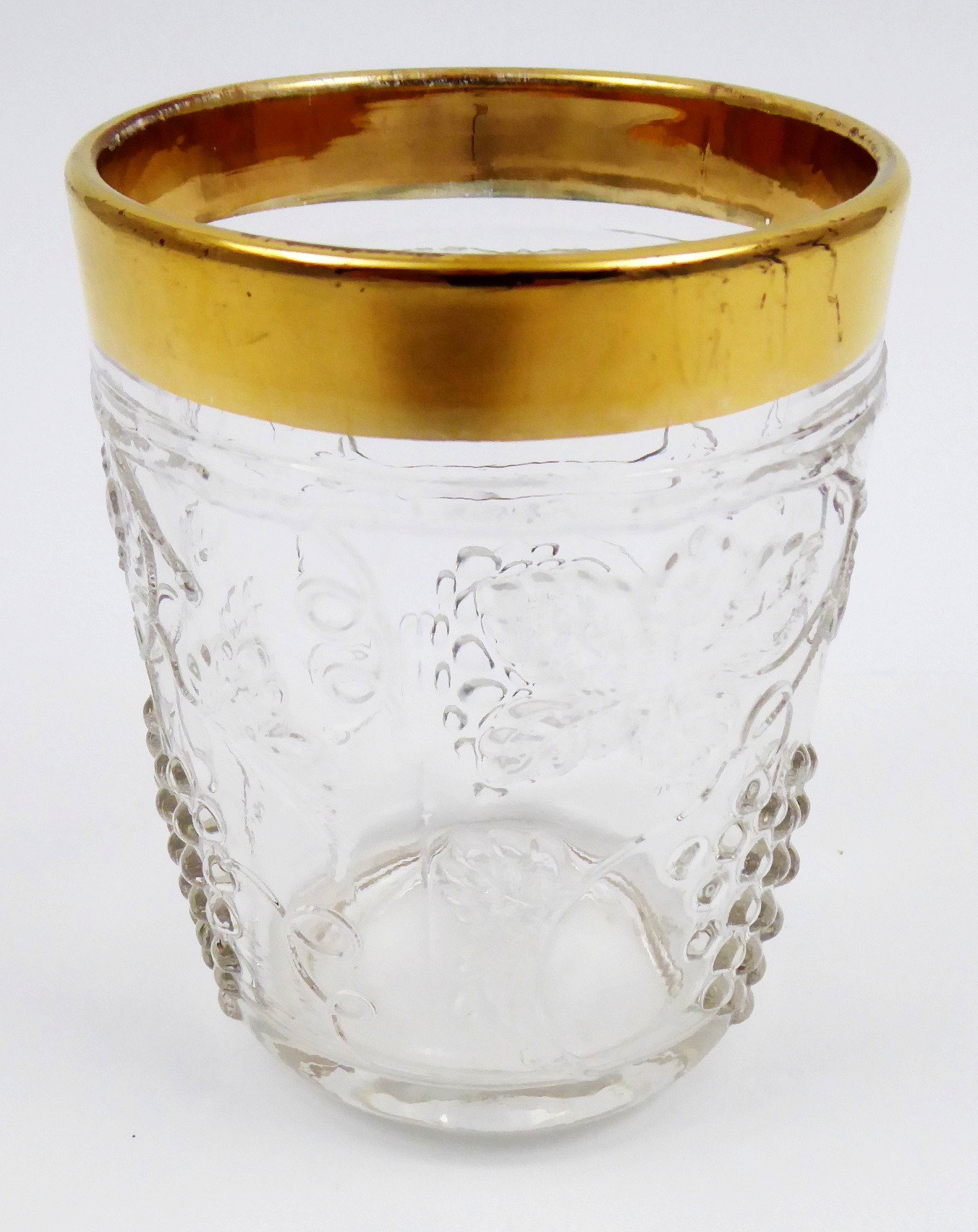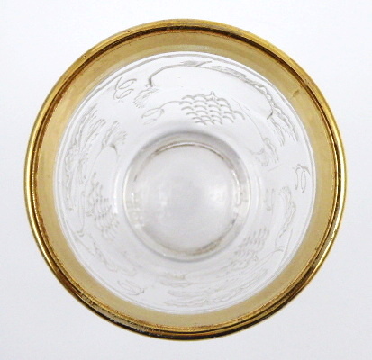 Bezbarvé lisované a zlacené sklo s ručně psaným nápisem. Sklenička z bezbarvého skla s lisovaným reliéfním dekorem stylizovaných diamantů se zlaceným horním okrajem a linkou. Na skleničce je reliéfní medailon s možností pro nápis (věnování aj.). Čechy 1900 – 1930. Výška 10,5 cm.