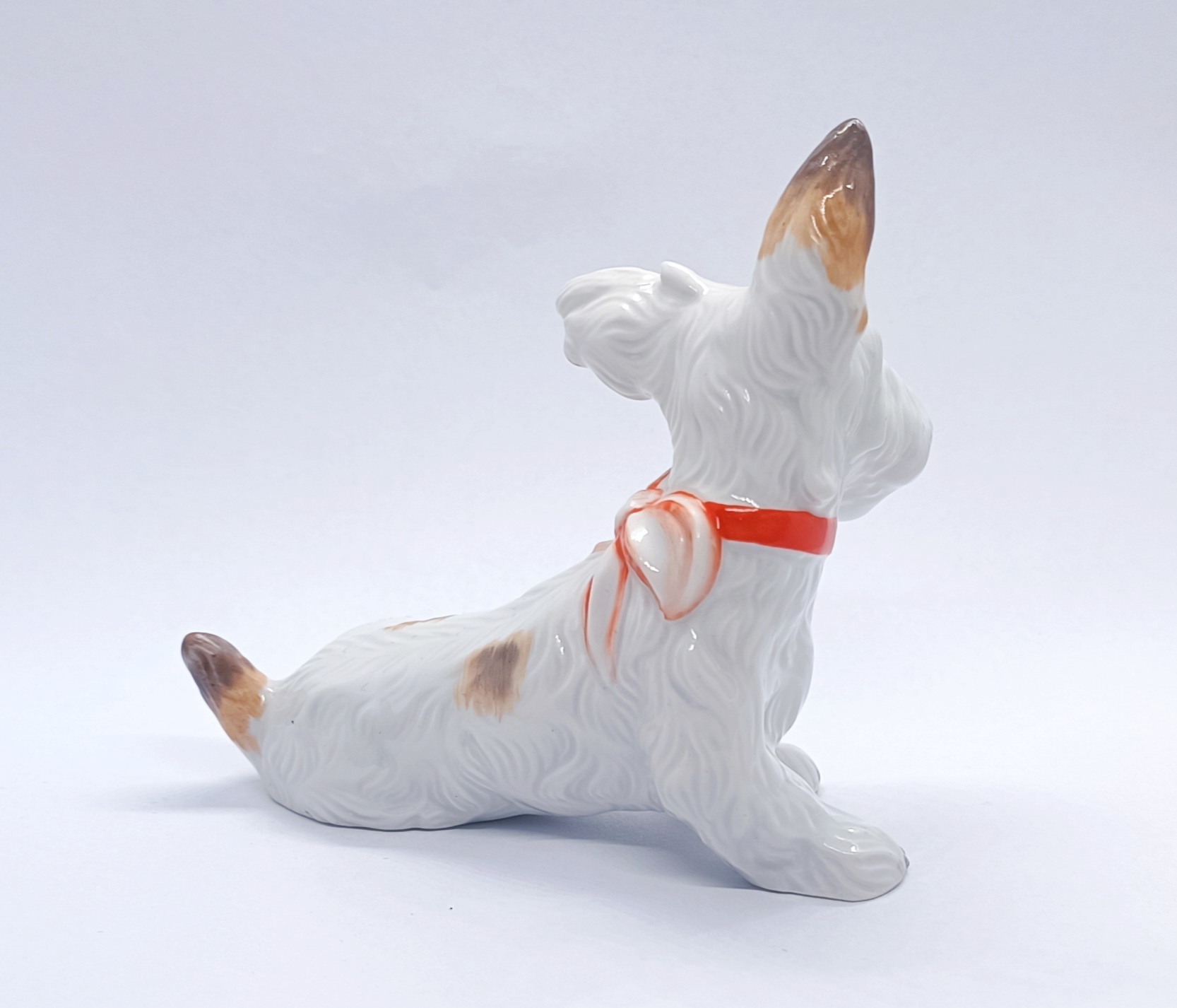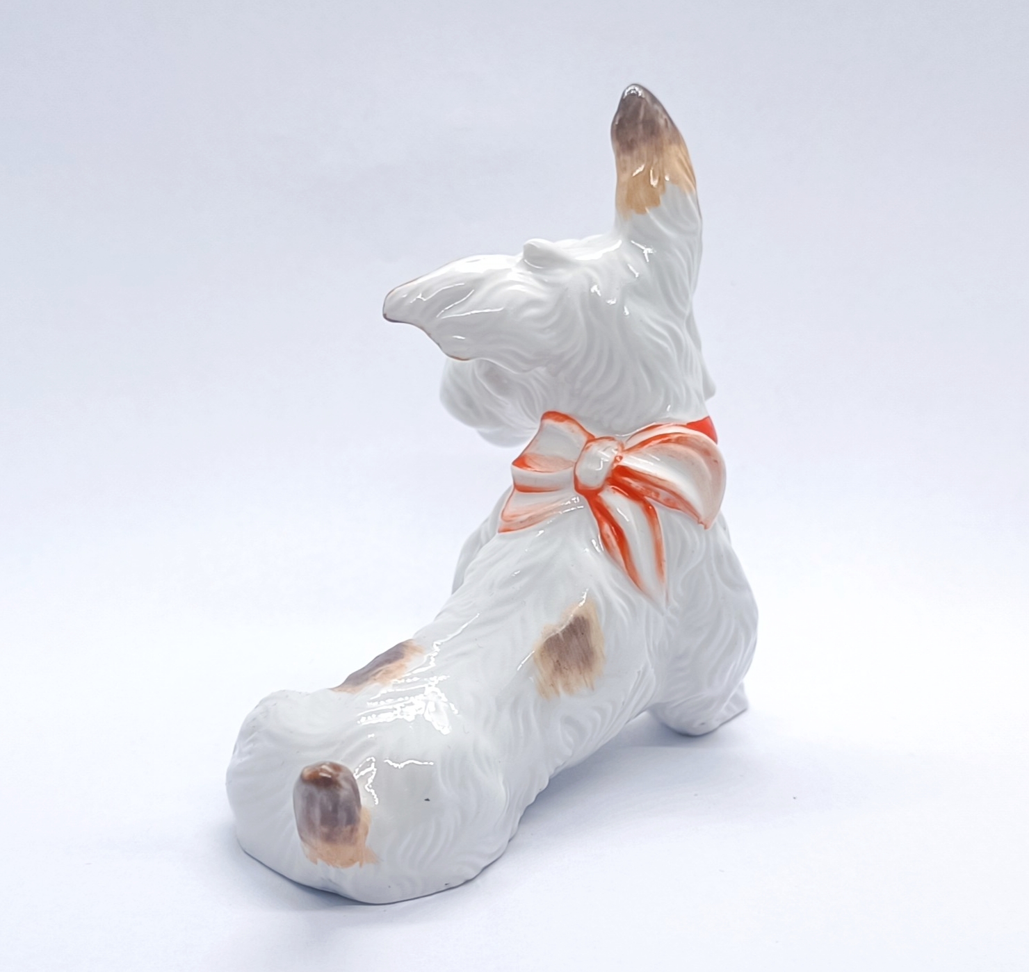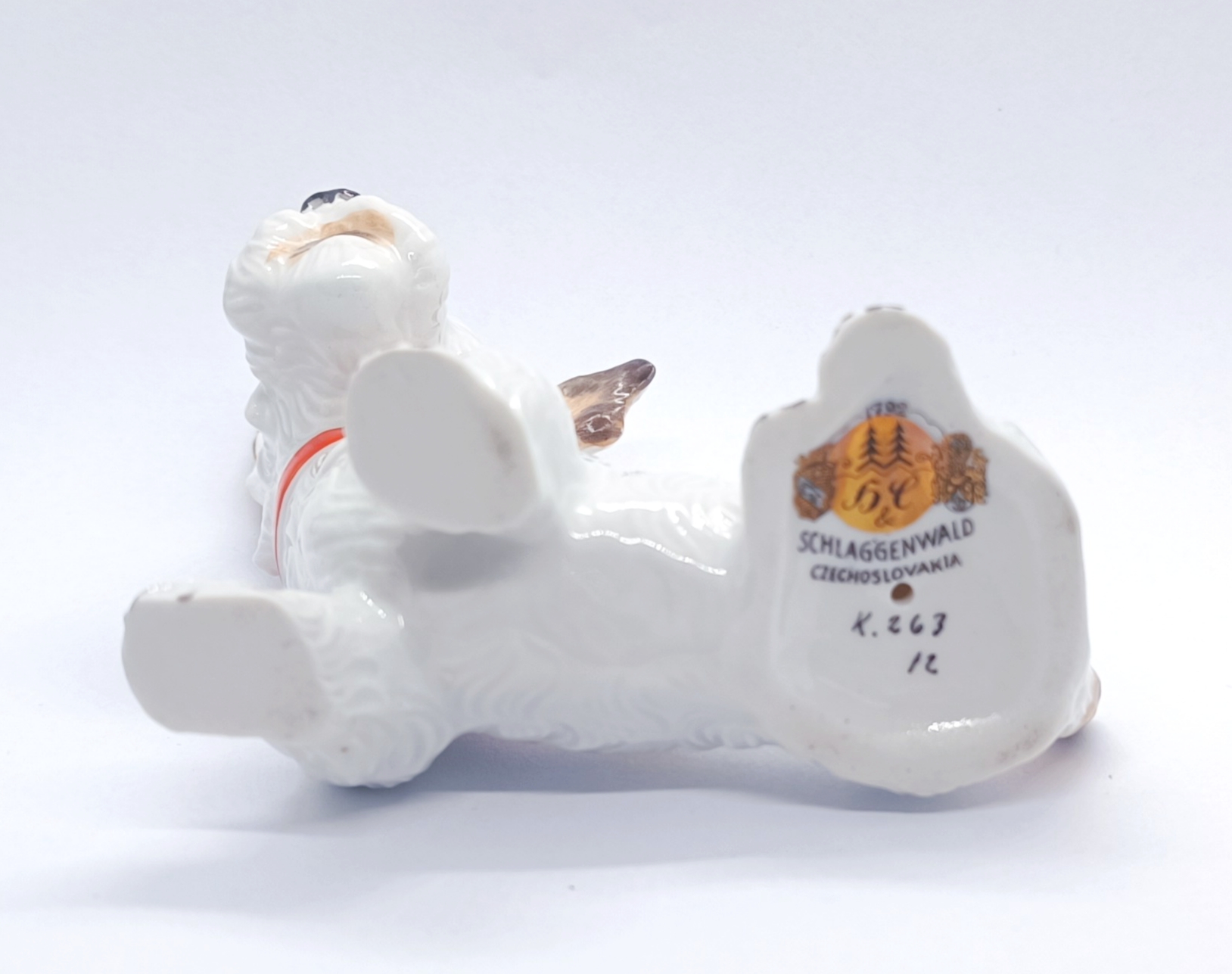Porcelánová figurka skotského teriéra, značeno Schlaggenwald/Slavkov, výroční značka, rok 1932; výška 8,5 cm, délka 9 cm