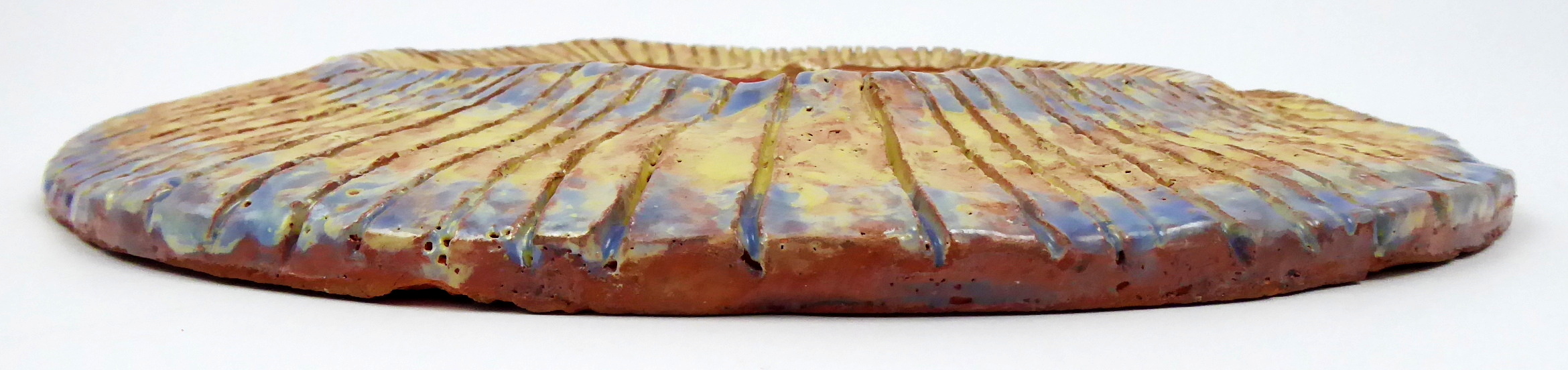 Ručně barevně malovaná terakota, pryskyřice – nálepy. Závěsný terakotový reliéf zpodobňující slunce s ručně barevně malovaným obličejem a s barevnými nálepy z pryskyřice, jež představují usměvavé tváře sluníčka. Vzadu drážka na úchyt. Československo, druhá polovina minulého století. Průměr 29,5 cm.