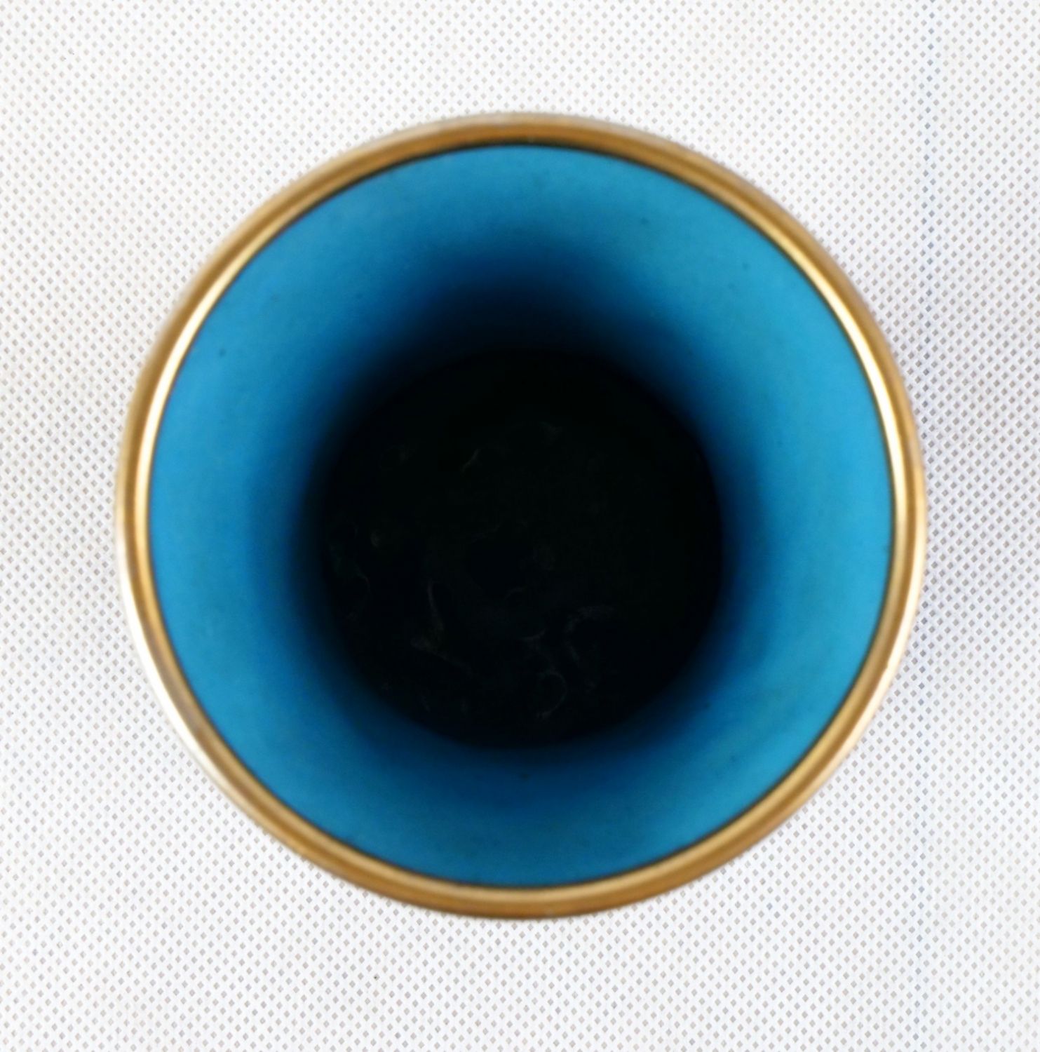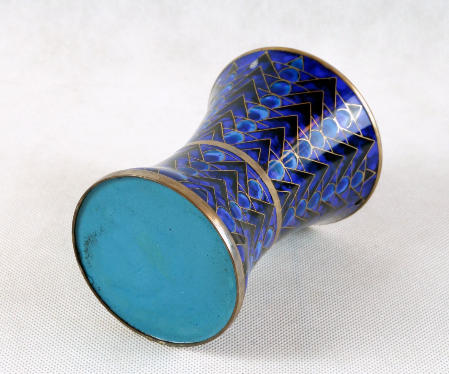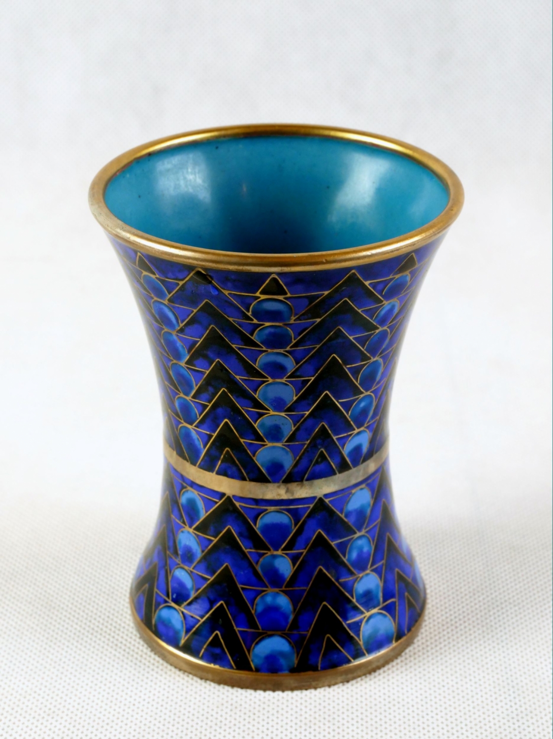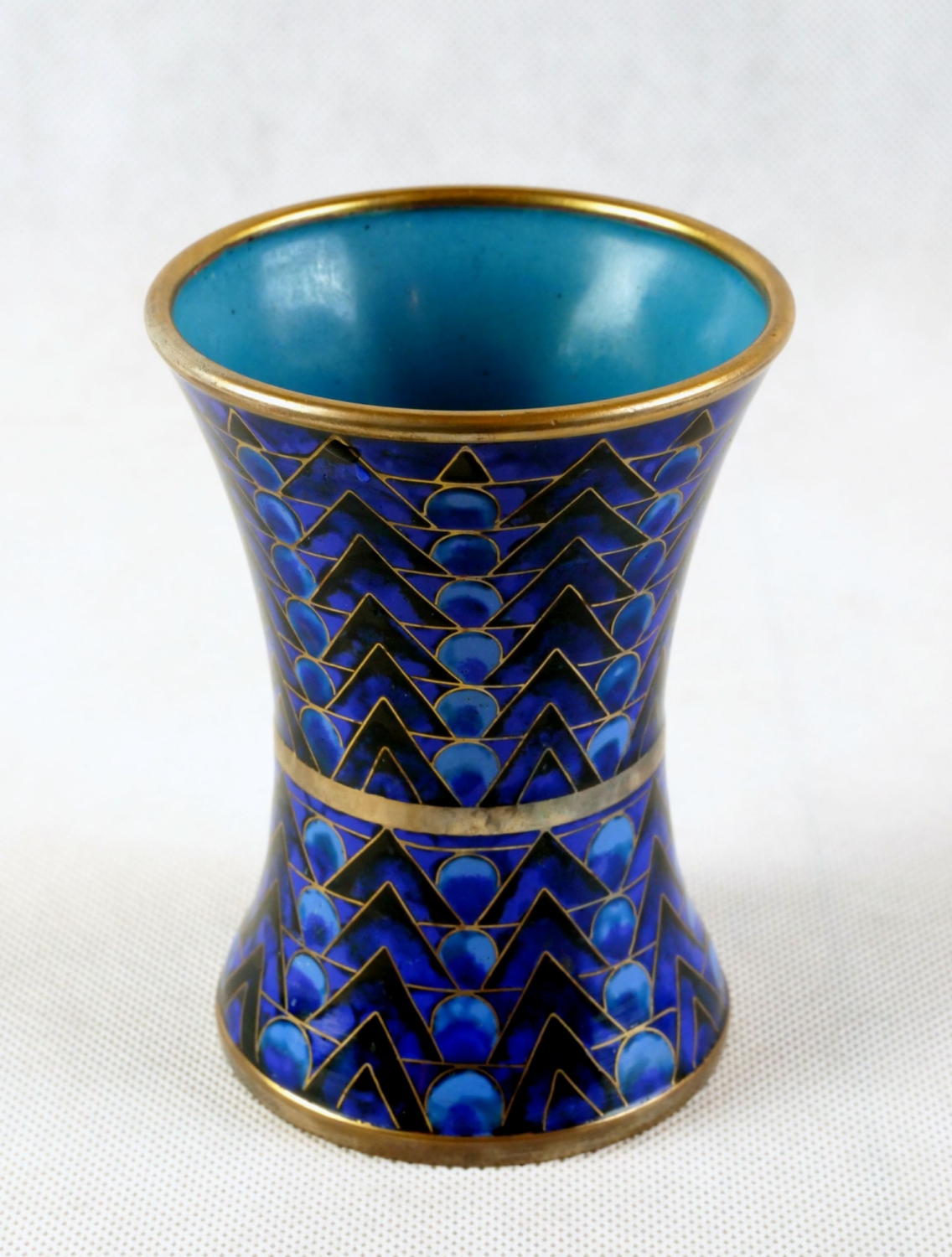 art deco vázička s výrazným modrým geometrickým dekorem provedeným smaltovou technikou cloisonné, Francie kolem roku 1925; průměr hrdla 8,5 cm, výška 11 cm; sběratelsky zajímavé