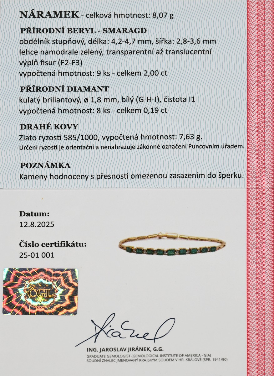 9 ks přírodních smaragdů, celkem 2,00 ct, obdélník stupňovaný, délka 4,2-4,7 mm, šířka 2,8-3,6 mm, výplň fisur (F2-F3)