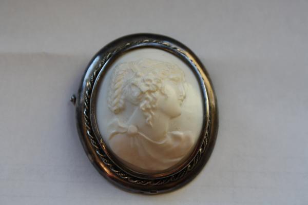 Krásná velká kamej z lastury ve stříbře – ryzost stříbra 925/1000, váha 20 g. Ve spodní části stříbrné