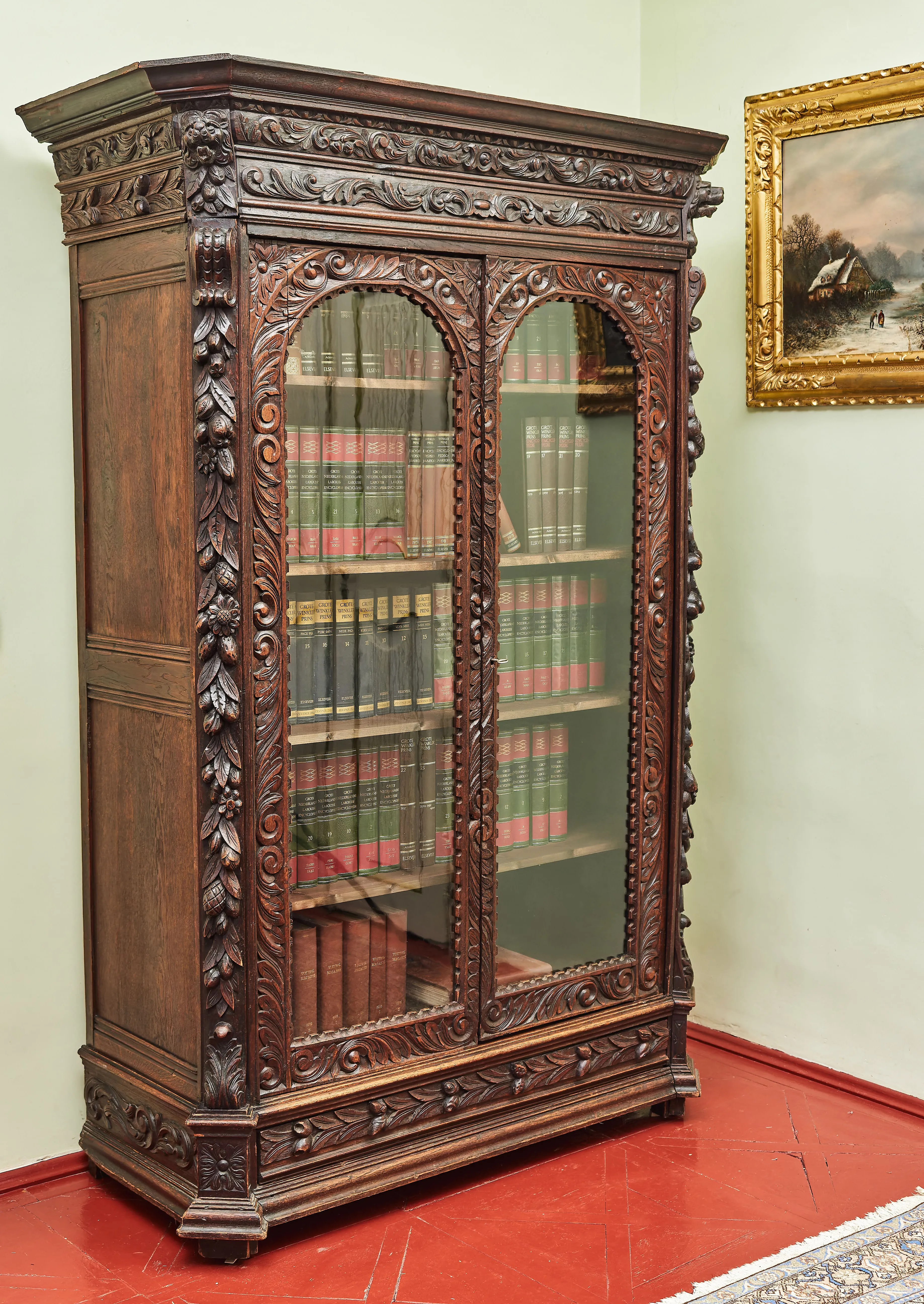 Starožitná knihovna z období regentství. Knihovna s prosklenou vrchní částí s dělenými skly v dvířkách a spodní částí se sedmi šuplíky z nichž slouží vrchní středový po odklopení jako psací stůl s úložnými šuplíky a tajnými schránkami. Výborná kvalita užitých materiálů a řemeslného zpracování. Lité mosazné kování. Psací plocha sekretáře je čalouněná kůží a zdobená zlatotiskem a slepotiskem. Středová část knihovny je zdobená ručním vyřezáváním. Zámky jsou značené.