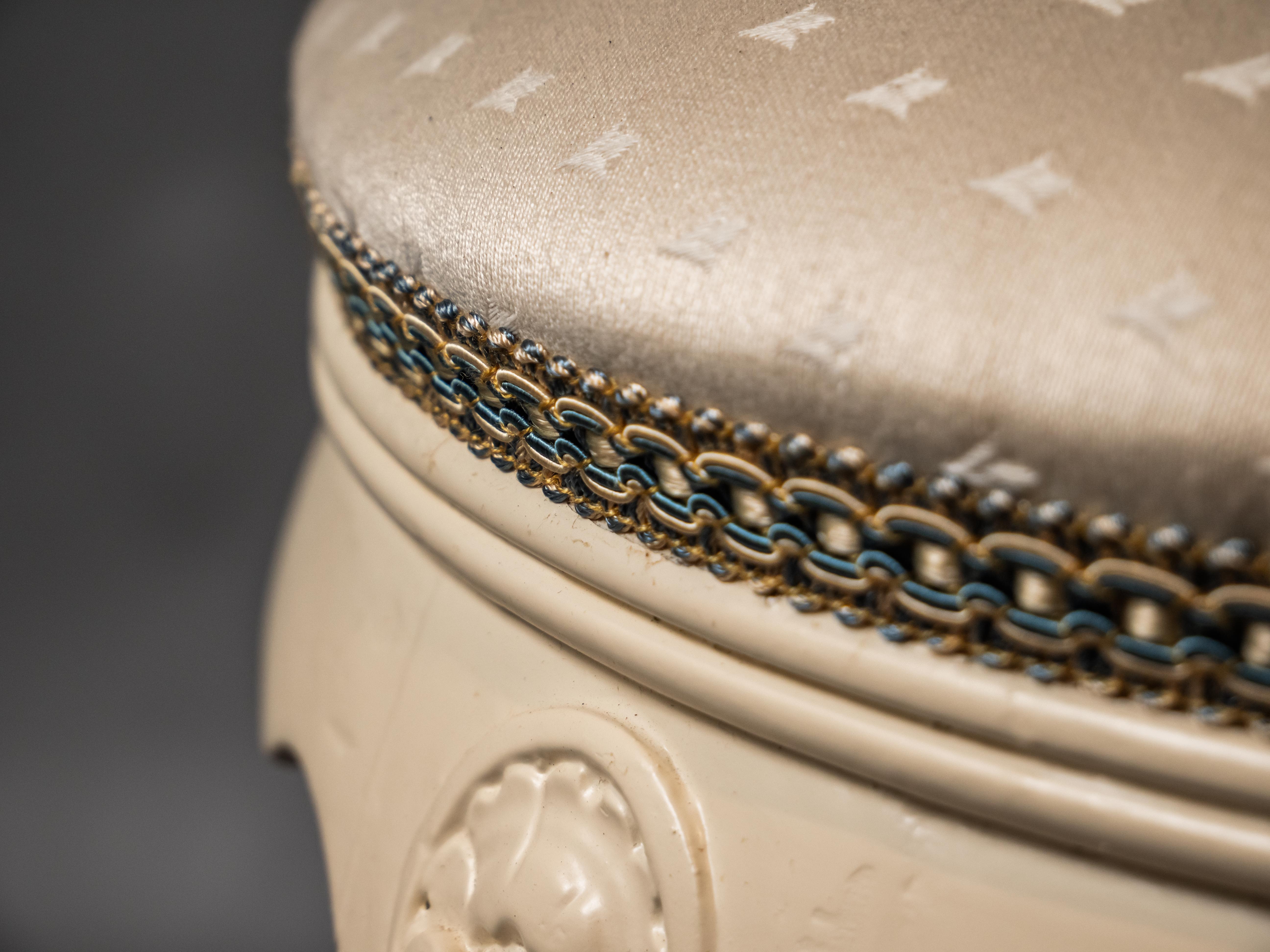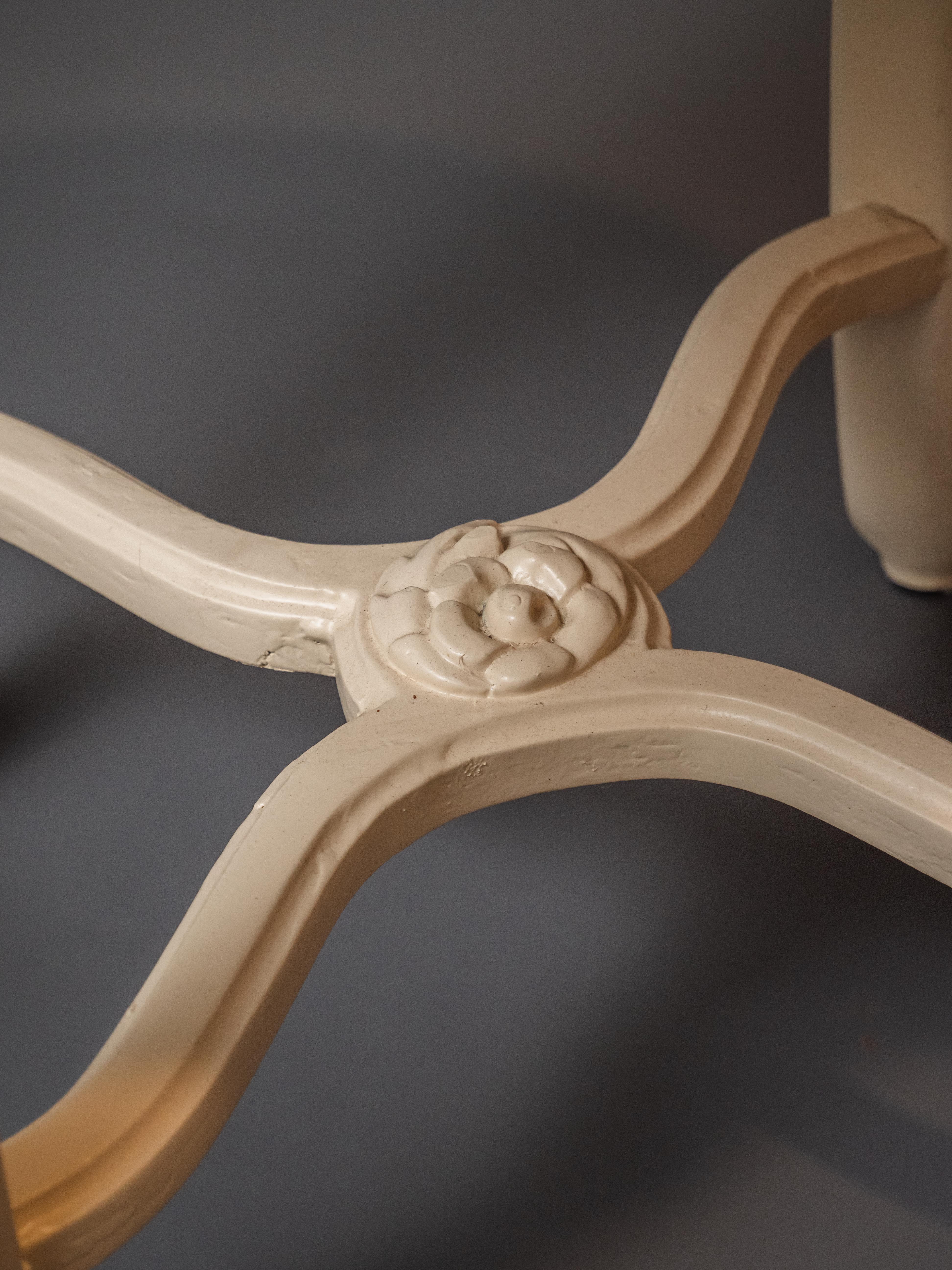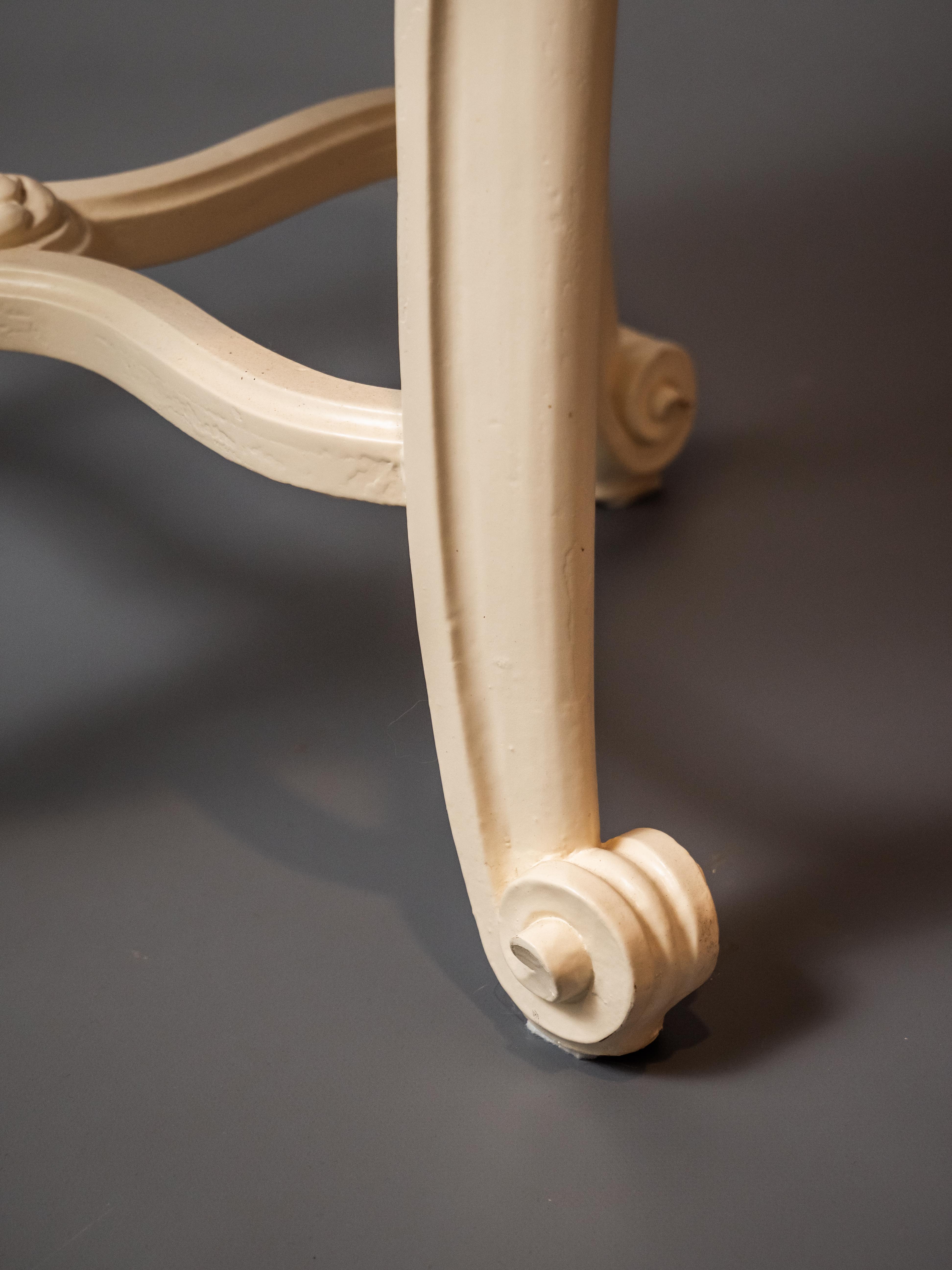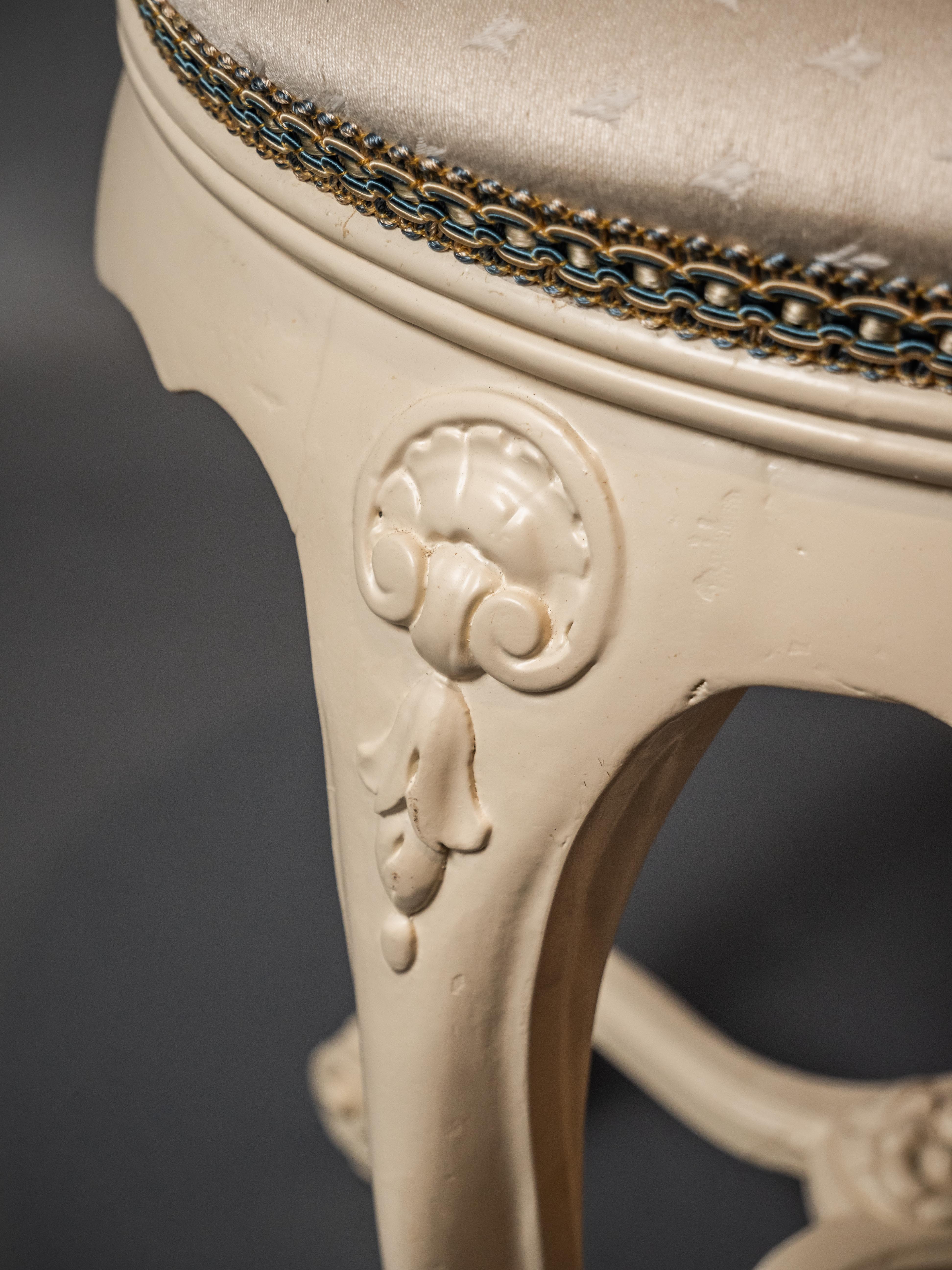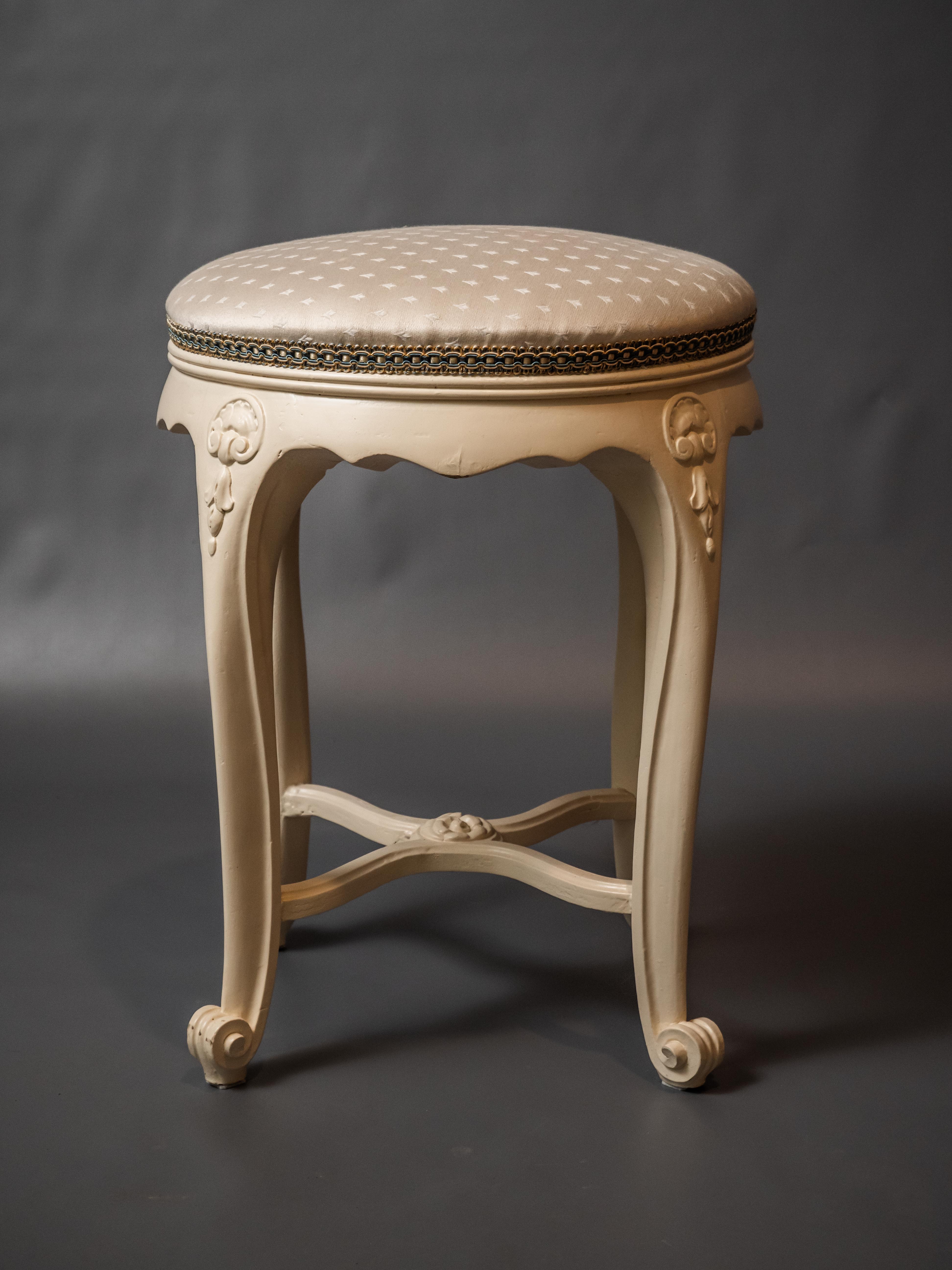 Čtyři lehce prohnuté laní nohy se spodní volutou spojené trnoží zdobenou středovou řezbou květu. Stolička má dále vyřezávané vrchy nohou. Stolička má nové čalounění kvalitní historickou látkou, čalounění je zakončené ozdobnou pórtou. Sedák je pohodlný a dobře se na něm sedí. Stolička prošla celkovou renovací: zpevněna, nová povrchová úprava do starobílé barvy, nově čalouněná. Stav je výborný, ihned k užívání bez dalších investic. Stolička je pevná a robustní, a proto je vhodná k běžnému užívání. Datace: první třetina 20. století. Provenience: Čechy.