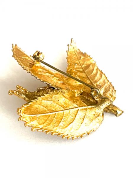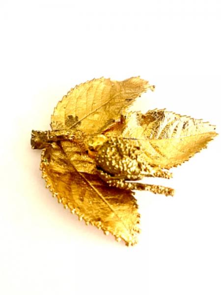 Krásná brož ve tvaru poupátka růže a listů, detailně propracovaná, přibližný rozměr 57 mm x 60 mm, funkční zapínání.