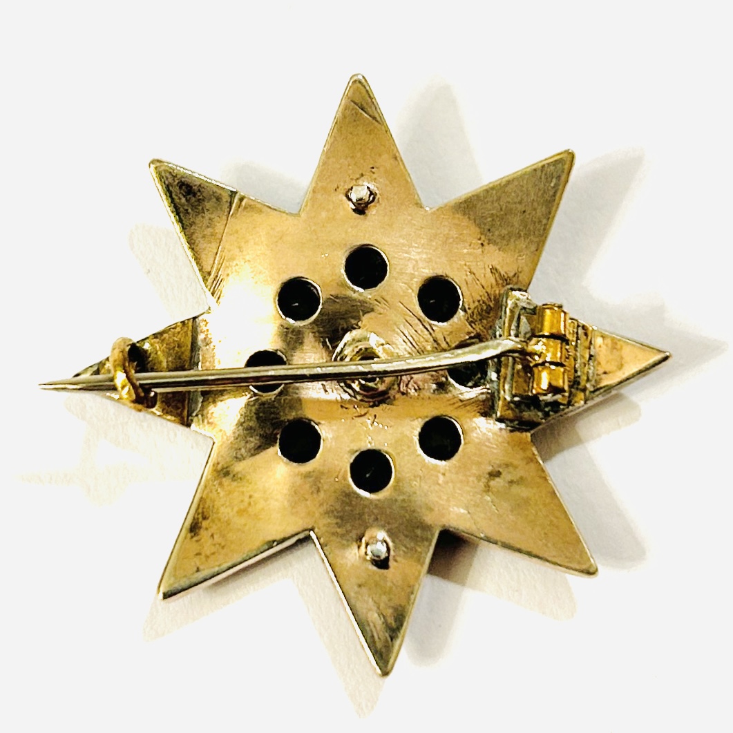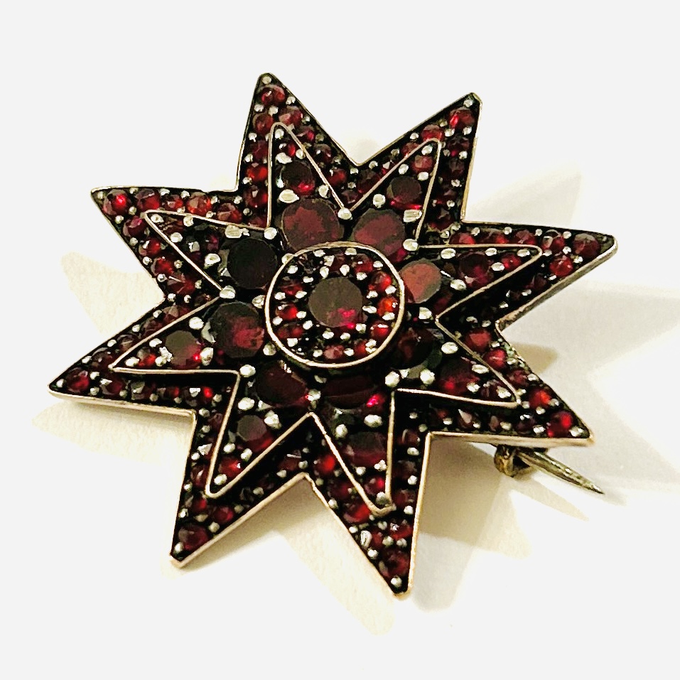 Starožitná brož ve tvaru honosné osmihroté hvězdy, v několika stupních osazeno českými granáty kulatého plochého a routového brusu, efektní kontrast větších (až 4 mm!) a drobných kamenů. Kameny mají jiskrnou barvu, fasováno nýtkovou technikou. Precizní tuzemská granátnická práce z 80. let 19. století s reflexí dobového pseudorenesančního stylu.