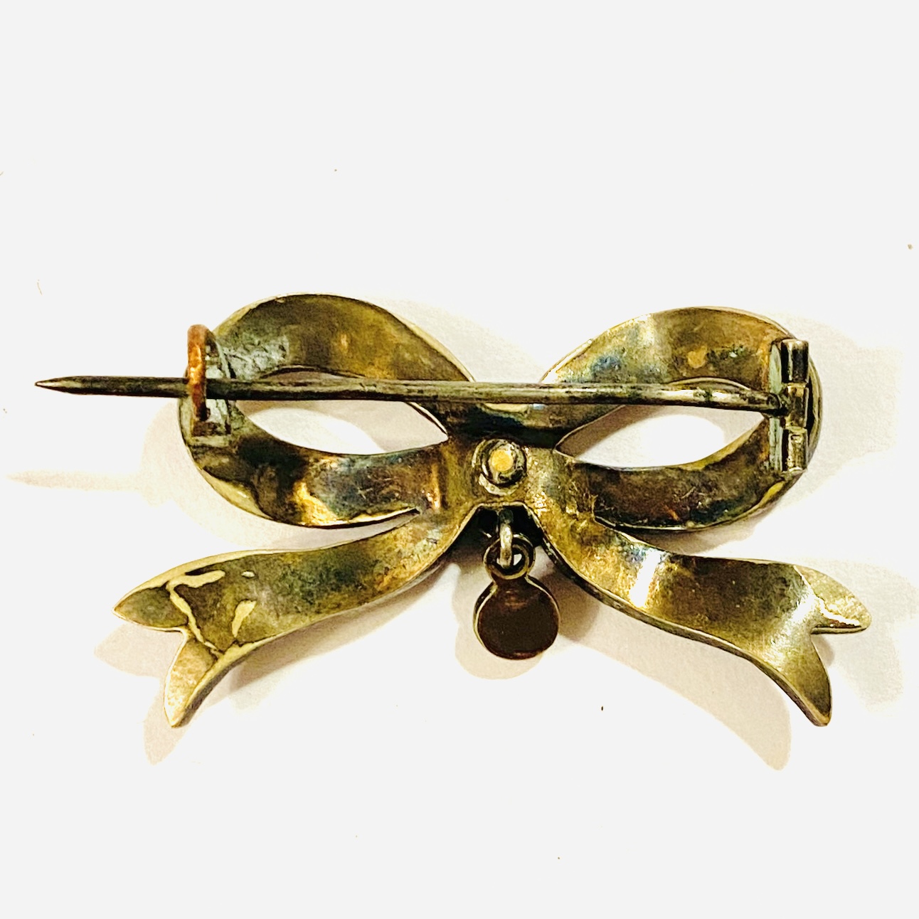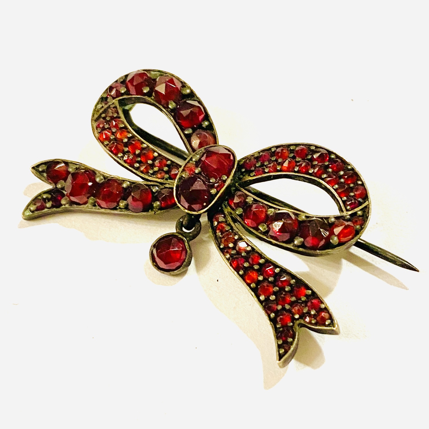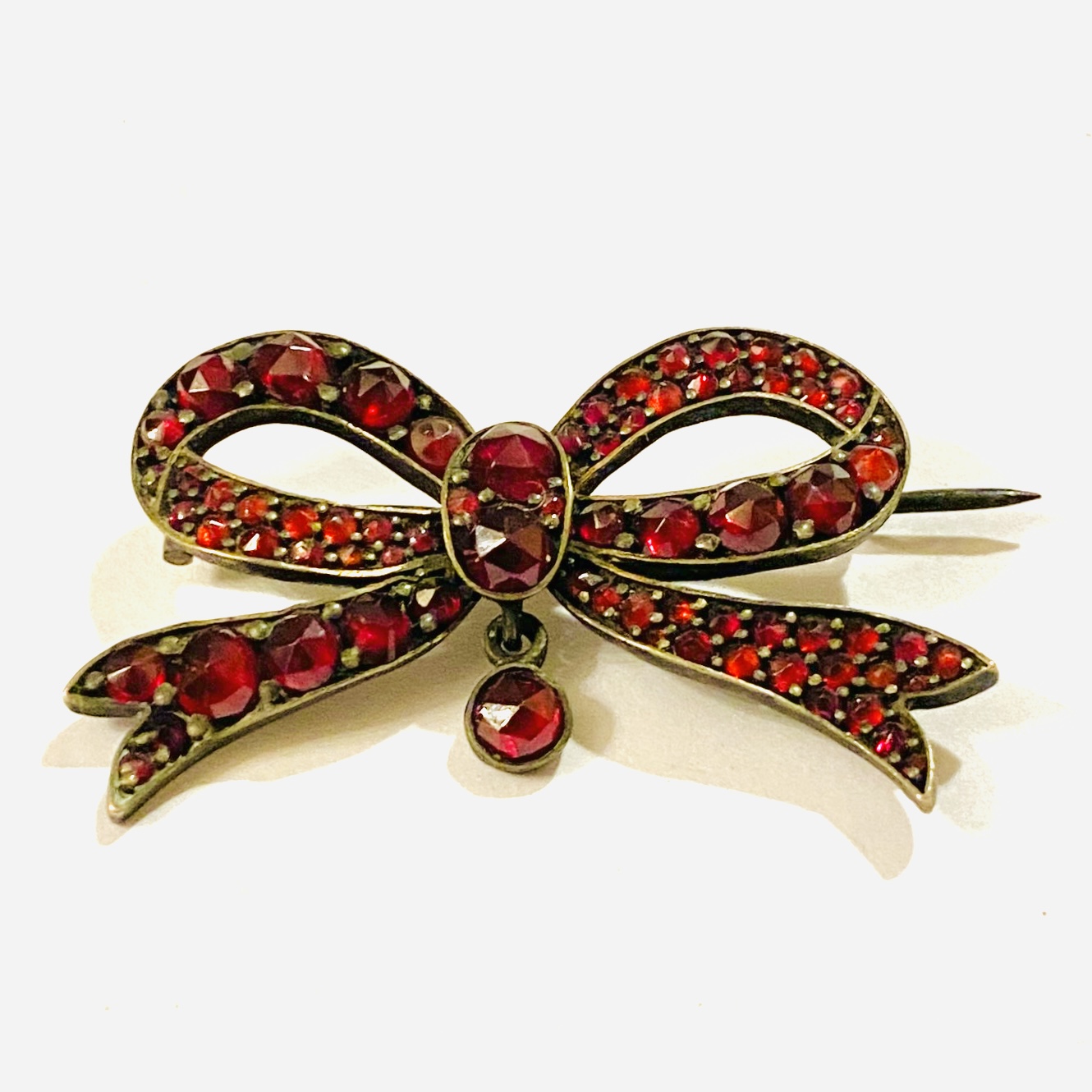 Starožitná brož ve tvaru mašle, oživeno drobným ověskem. Osázeno českými granáty kulatého routového brusu, kontrast linií s pavé drobných kamenů oproti těm s většími. Kameny mají jiskrnou barvu a ty největší jsou o nadstandardním průměru 4 mm, fasováno nýtkovou technikou. Elegantní a hravý šperk z poslední pětiny 19. století, precizní tuzemská granátnická práce.