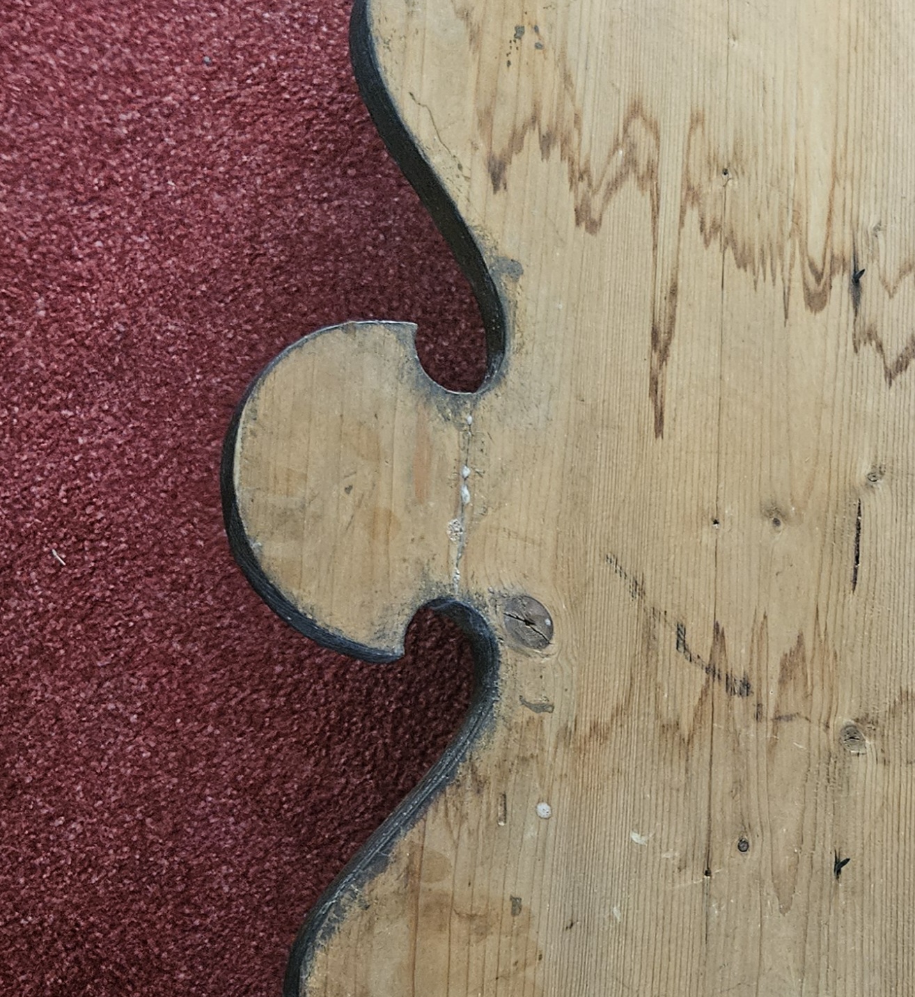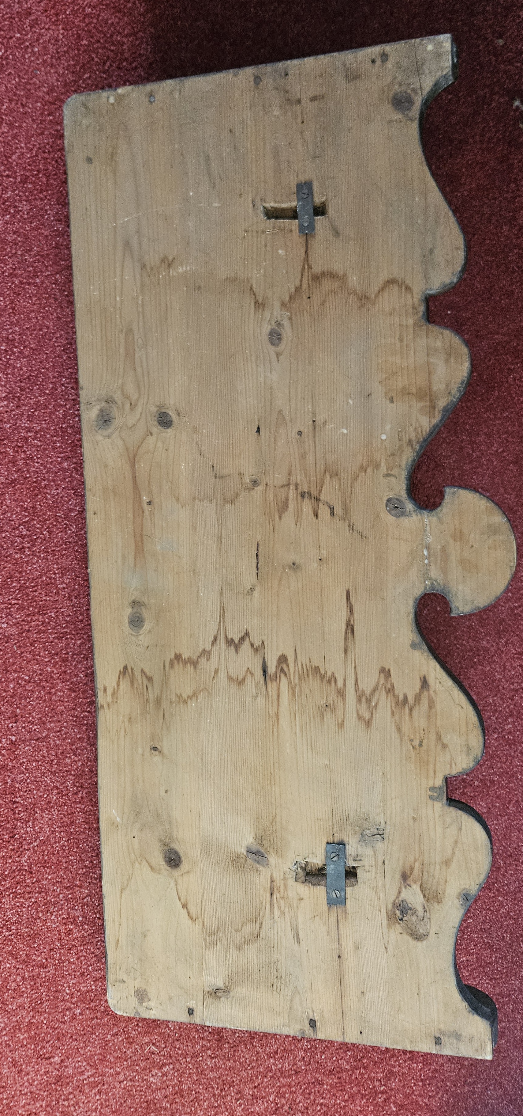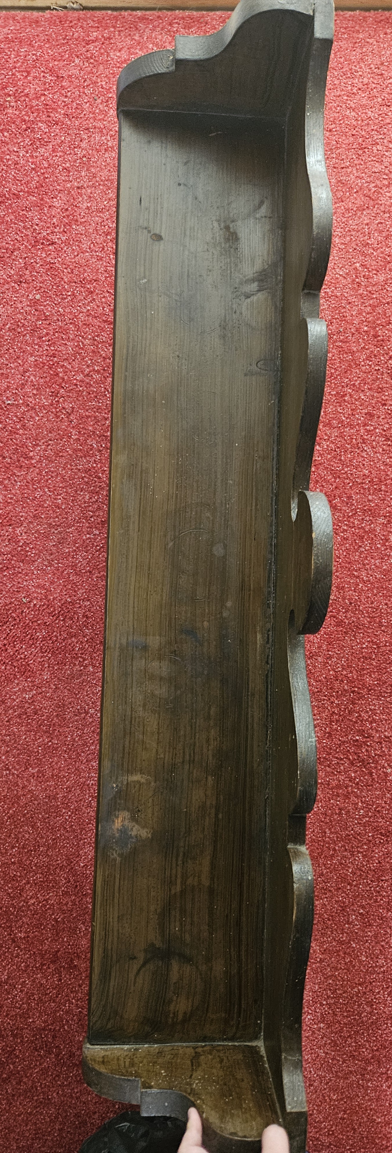 Starožitná dřevěná police z masivního dřeva, fládrovaný vzhled, horní středová ozdoba již historicky podlepena viz foto, z přední strany není úprava vidět. Police v původním stavu, nyní nerestaurováno.