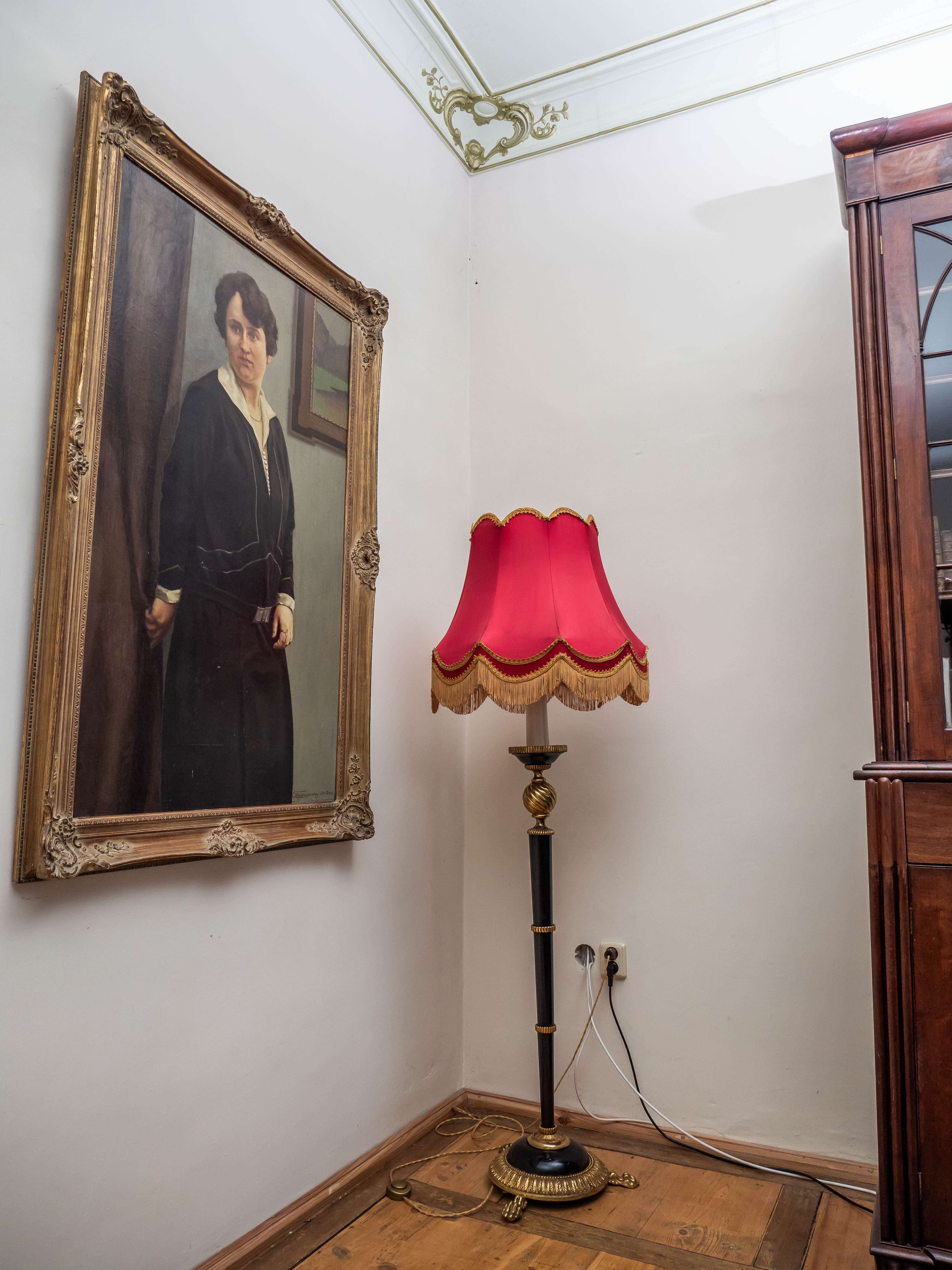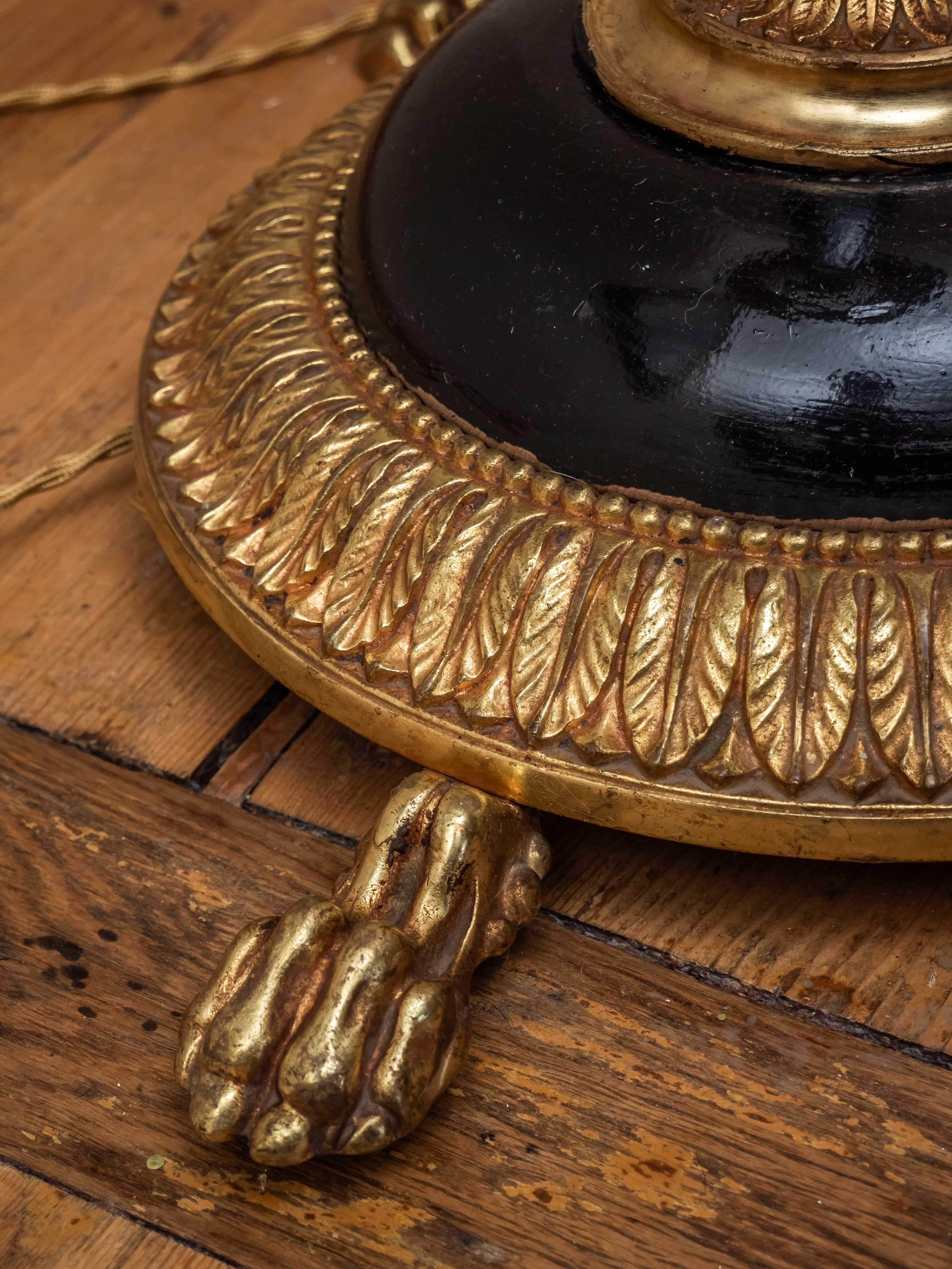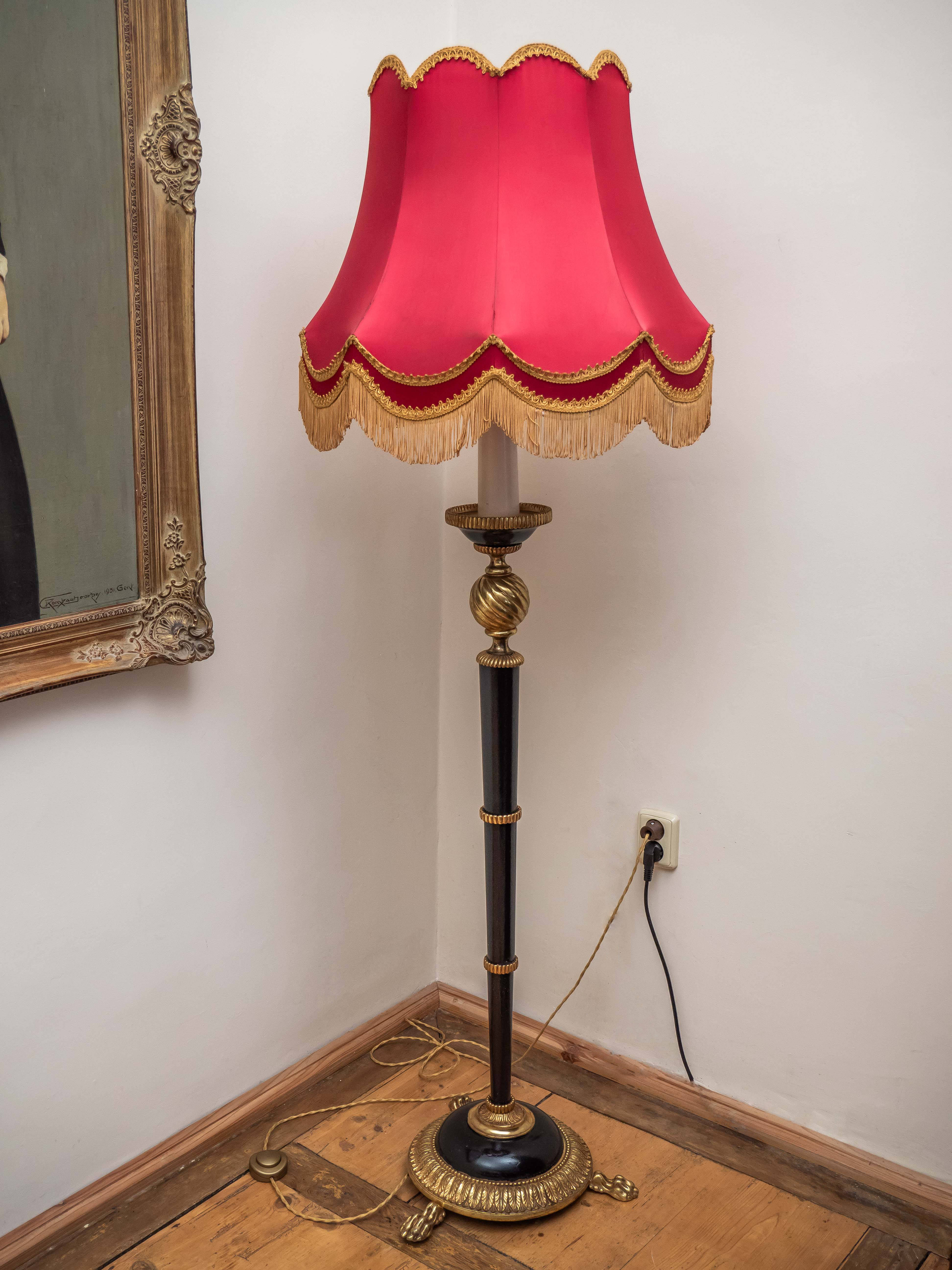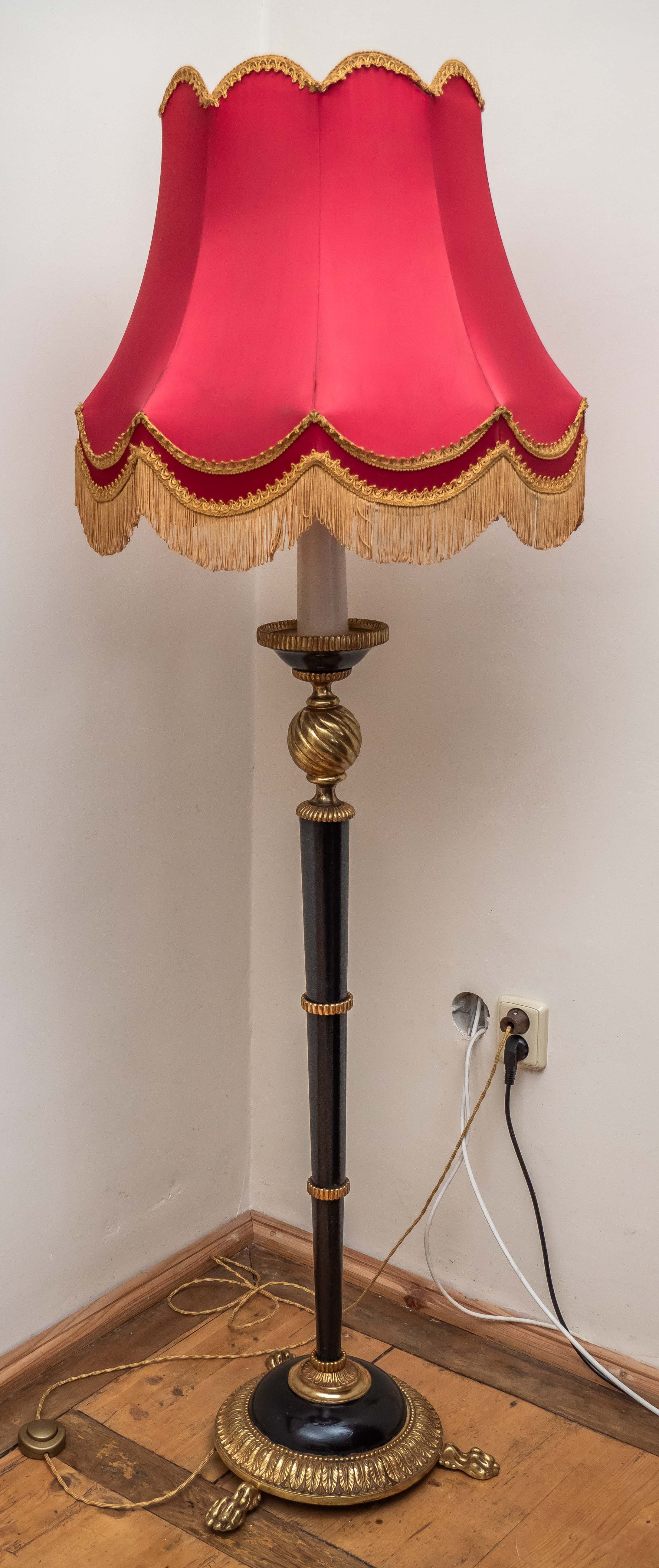 Kovová stojací lampa z leštěné mosazi a černě natřené mosazi s krásným látkovým stínidlem s ozdobnými třásněmi a portami. Kruhovou podstavu s akantovými listy vynáší trojice lvích tlap. Kónicky se zvětšující tělo lampy je děleno mosaznými kruhy a ve vrchní části je zdobení s rýhovanou koulí. Lampa je na jednu žárovku s klasickým závitem E 27 do 40W. Elektroinstalace je nově udělaná v látkou opleteném vodiči ve zlaté barvě s nožním vypínačem také ve zlaté barvě – dle moderních norem. Provenience: Francie. Datace: kolem roku 1930.