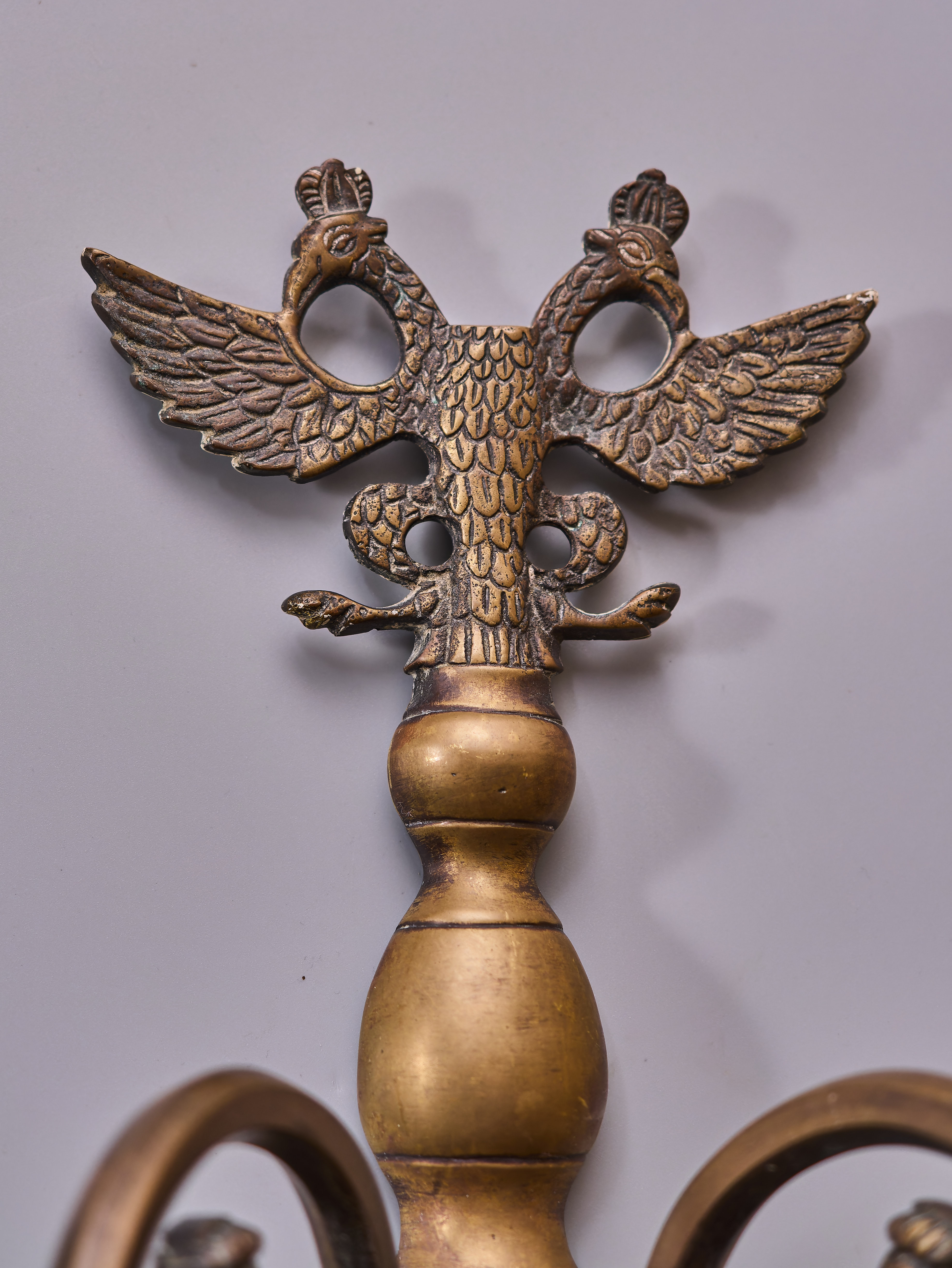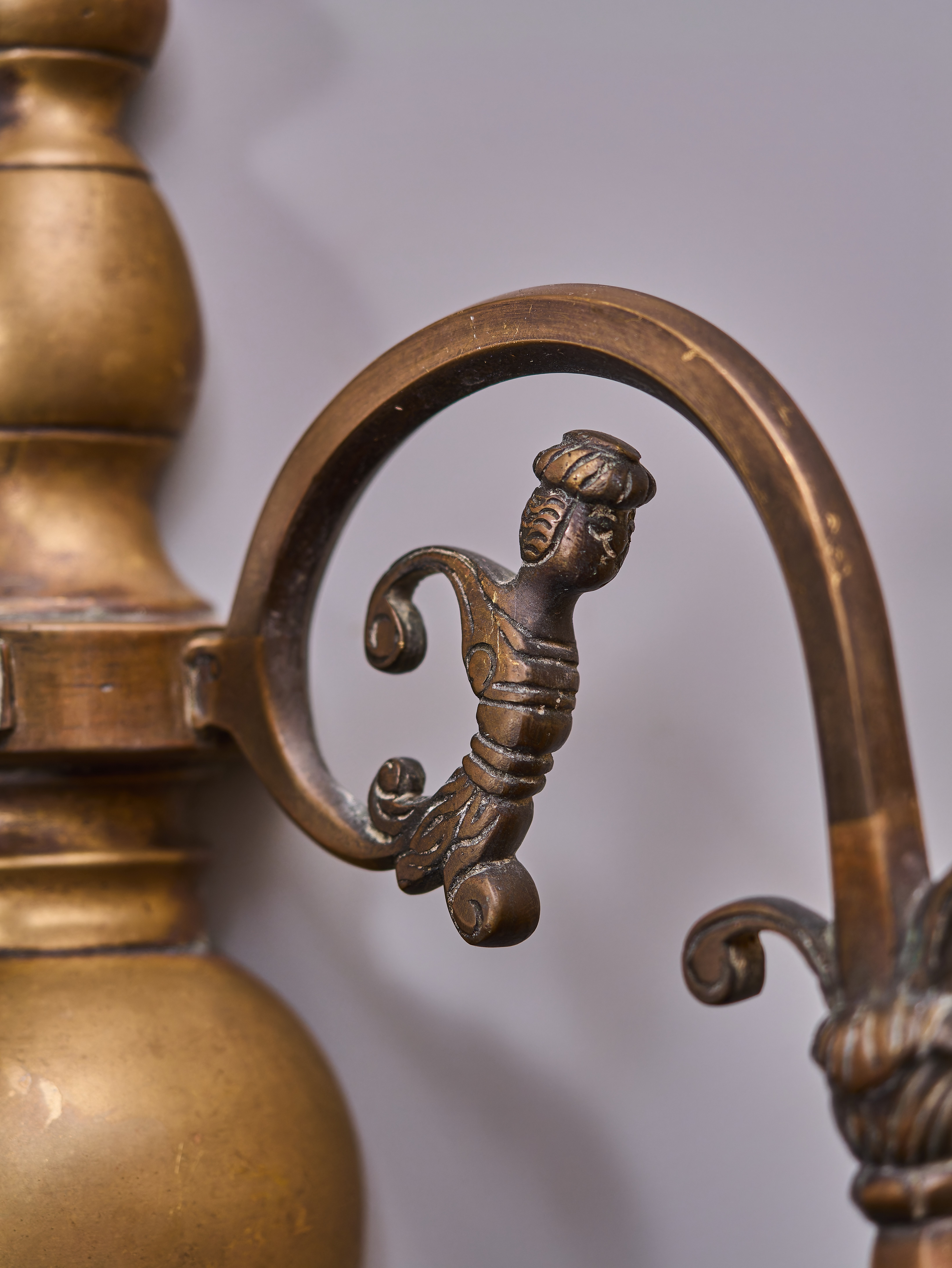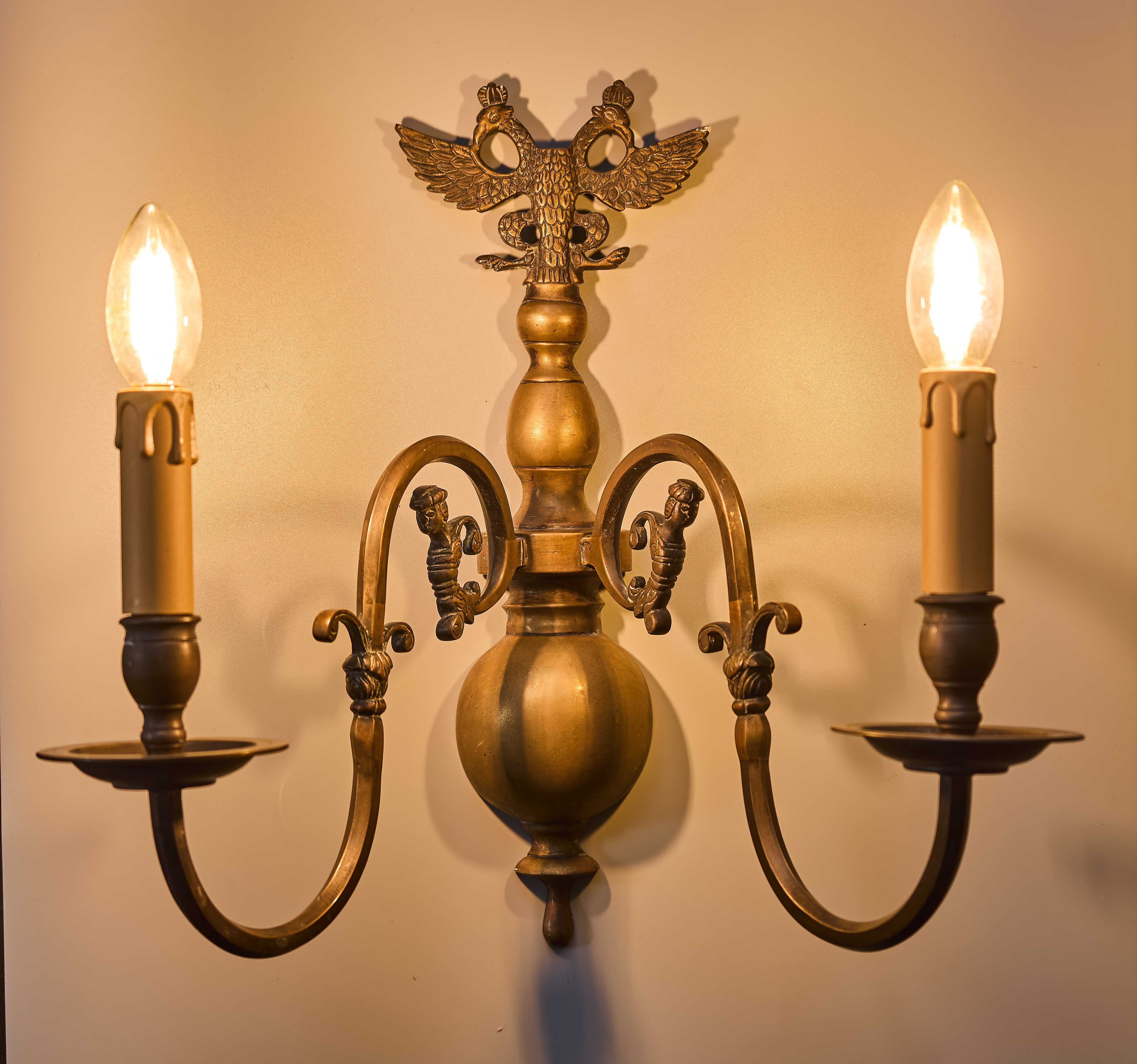 Vlámská nástěnná lampa s figurkami a vrchní orlicí. Lampa byla vyrobena koncem 19. století. Nyní je nově elektrifikovaná – plně funkční. Lampa je na dvě svíčkové žárovky s paticí E14 do 40W – vhodné jsou normální, halogenové i led žárovky.