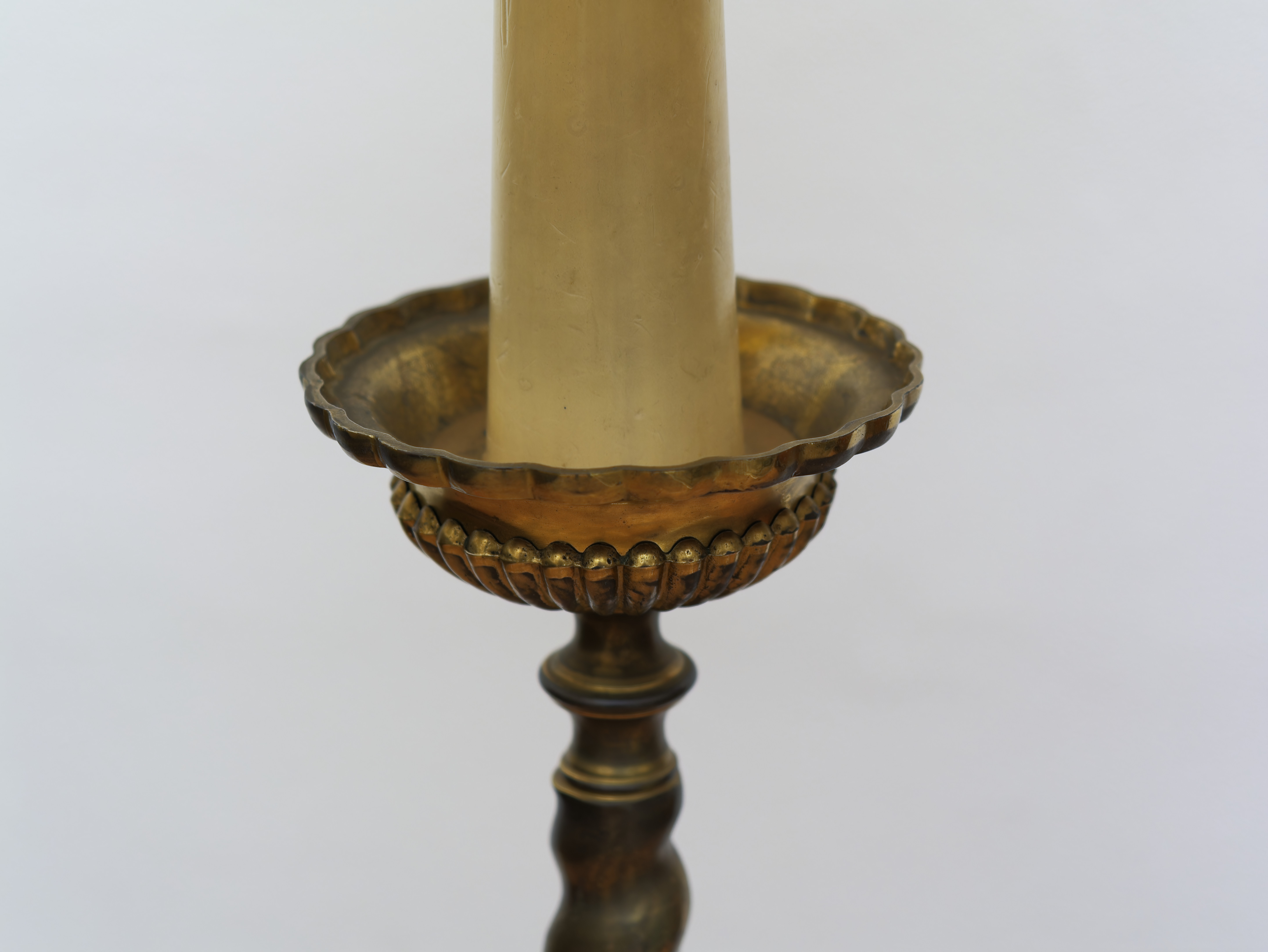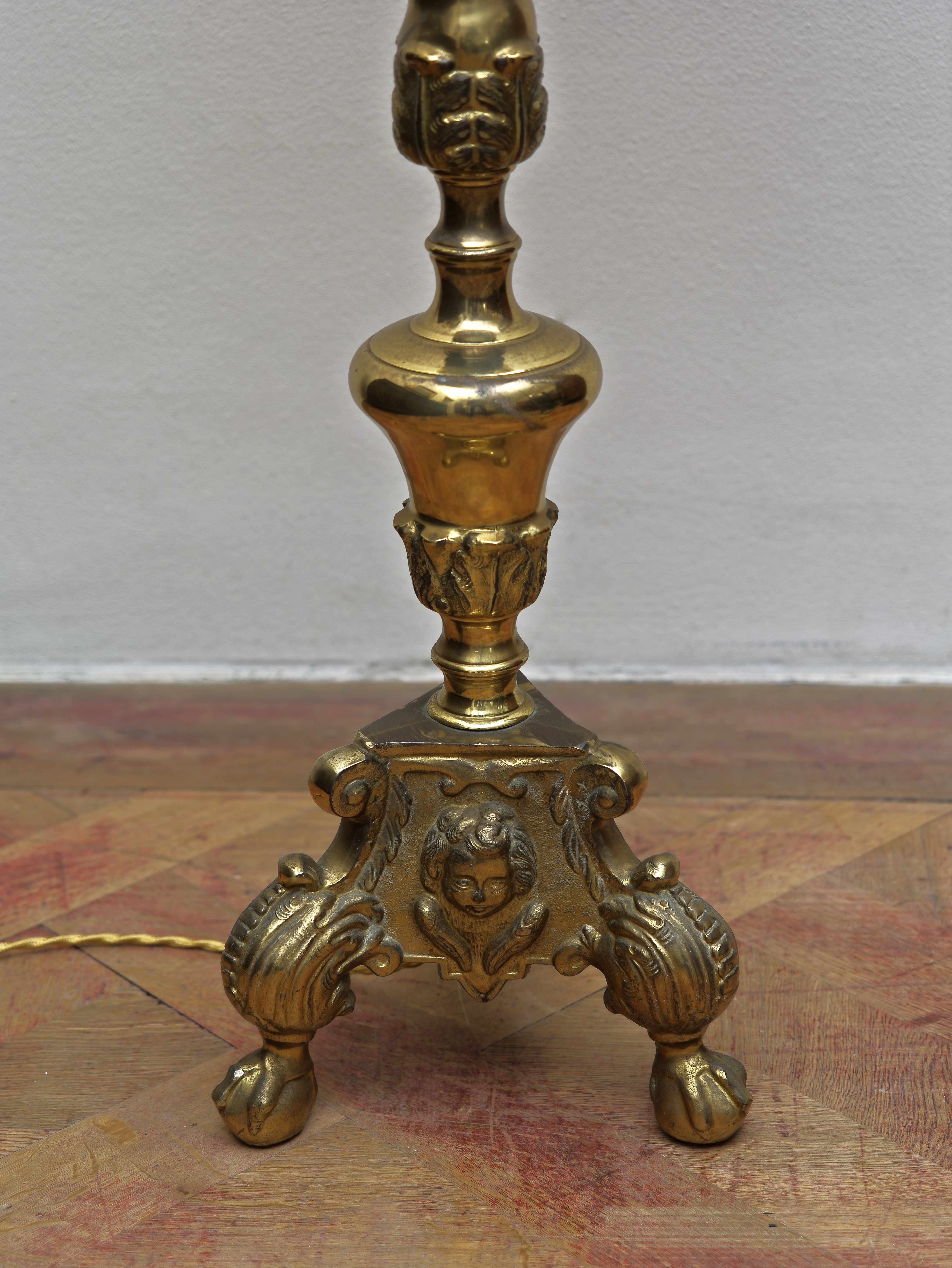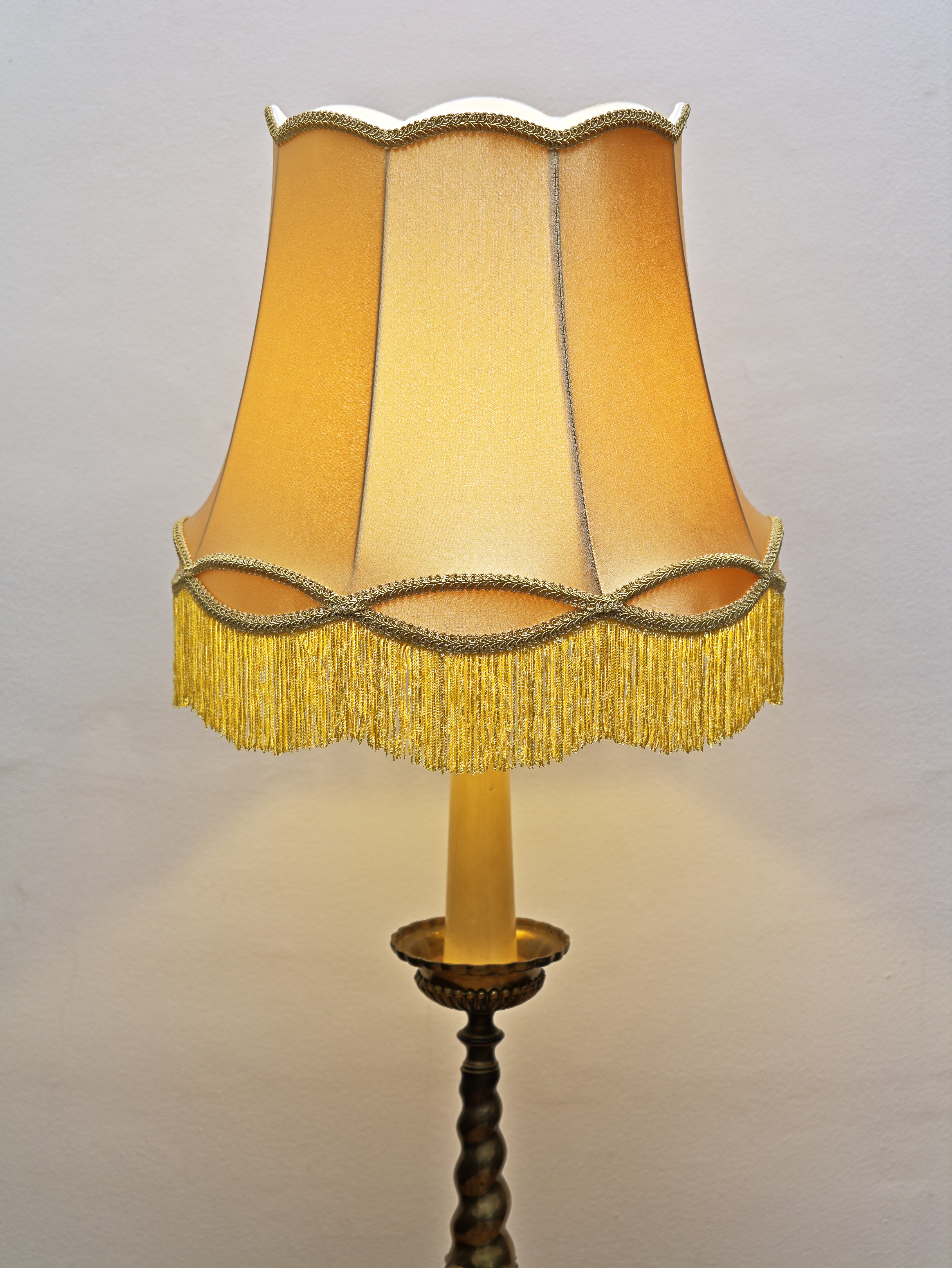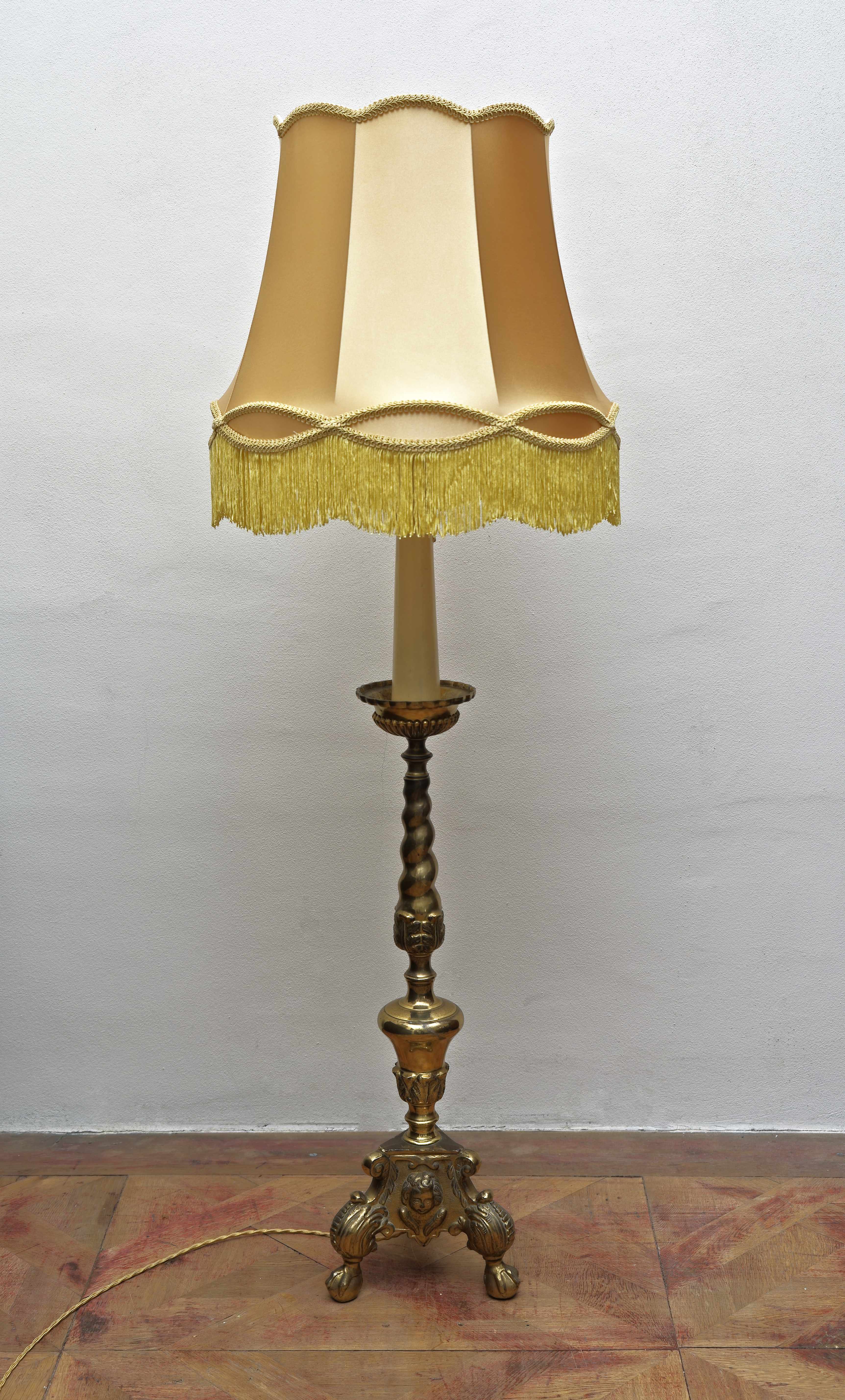 Luxusní stojací lampa v barokním stylu. Lampa je na jednu žárovku s klasickým závitem E27 do 40W – vhodné jsou normální, halogenové i led žárovky – ty doporučuji nejvíce kvůli teplotě (žárovka nejsou součástí balení, ale mohu doporučit nejvhodnější pro váš záměr na základě našich zkušeností, případně je po dohodě dodat také). Lampa má novou elektroinstalaci ve starém stylu – přívodní kabel je třílinka s dvojitou izolací a látkovým opletem ve zlaté barvě, nový nožní vypínač a novou koncovku. Lampa má nové stínidlo – působí svěže a čistě. Velmi detailní provedení nohy. Lampa je těžká a stabilní. Datace: 20. století. Provenience: Belgie. Stav: plně funkční, částečně restaurovaný, ihned k užívání.