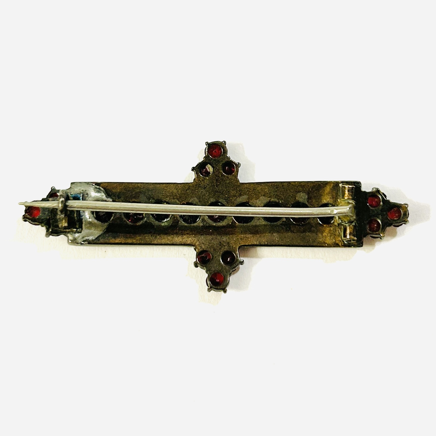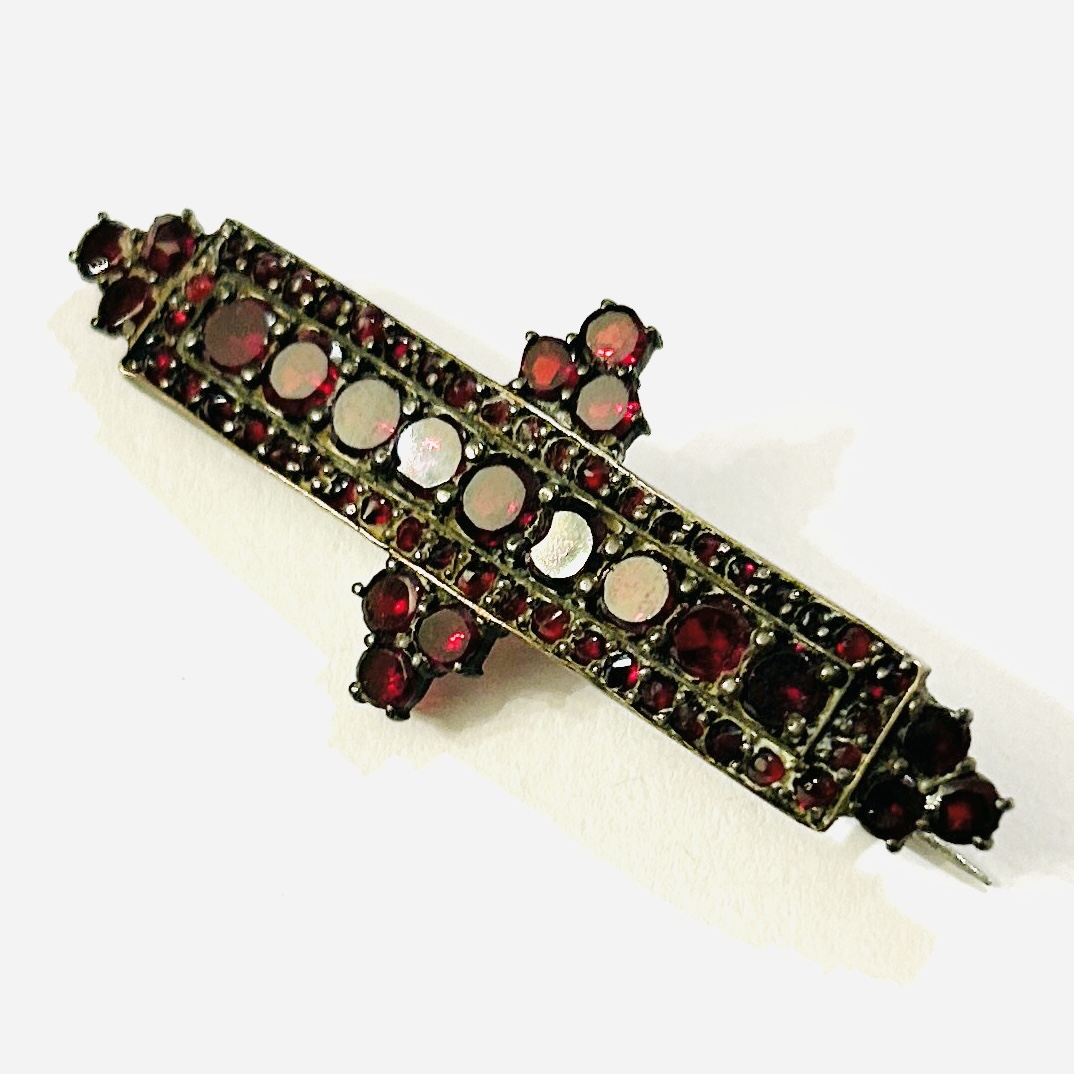 Starožitná brož v novorenesančním stylu, osázeno českými granáty, středový pás a ozdobné výstupky kulatého plochého brusu, rámováno kontrastně menšími kulatého routového brusu, fasováno nýtkovou a zrnkovou technikou, větší kameny opatřeny průsvitkami. Precizní tuzemská granátnická práce z 80. let 19. století. Reflexe dobových pseudoslohů v granátovém šperkařství je méně častá i díky tomu se jedná o sběratelsky zajímavý kousek.
