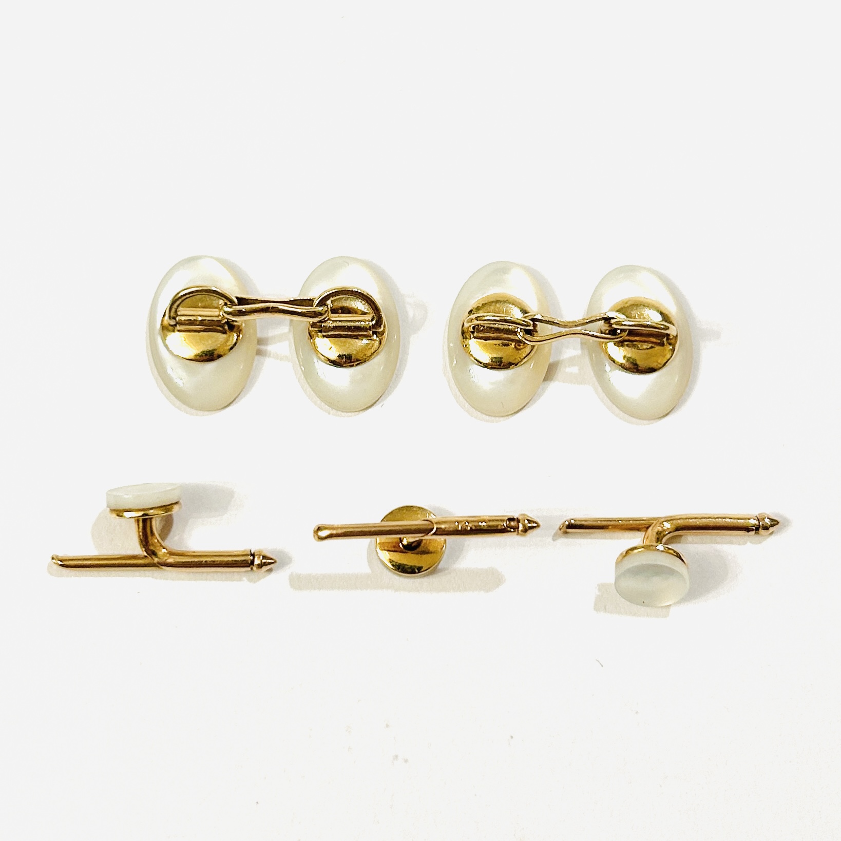 Souprava decentních, nadčasově pojatých manžetových a 3 náprsenkových knoflíčků, hlavice zhotoveny z přírodní bílé perleti broušené do oválu či kruhu. Vhodné do fraku či smokingu, solidní americká (USA) zlatnická práce z 20. až 30. let 20. století.
