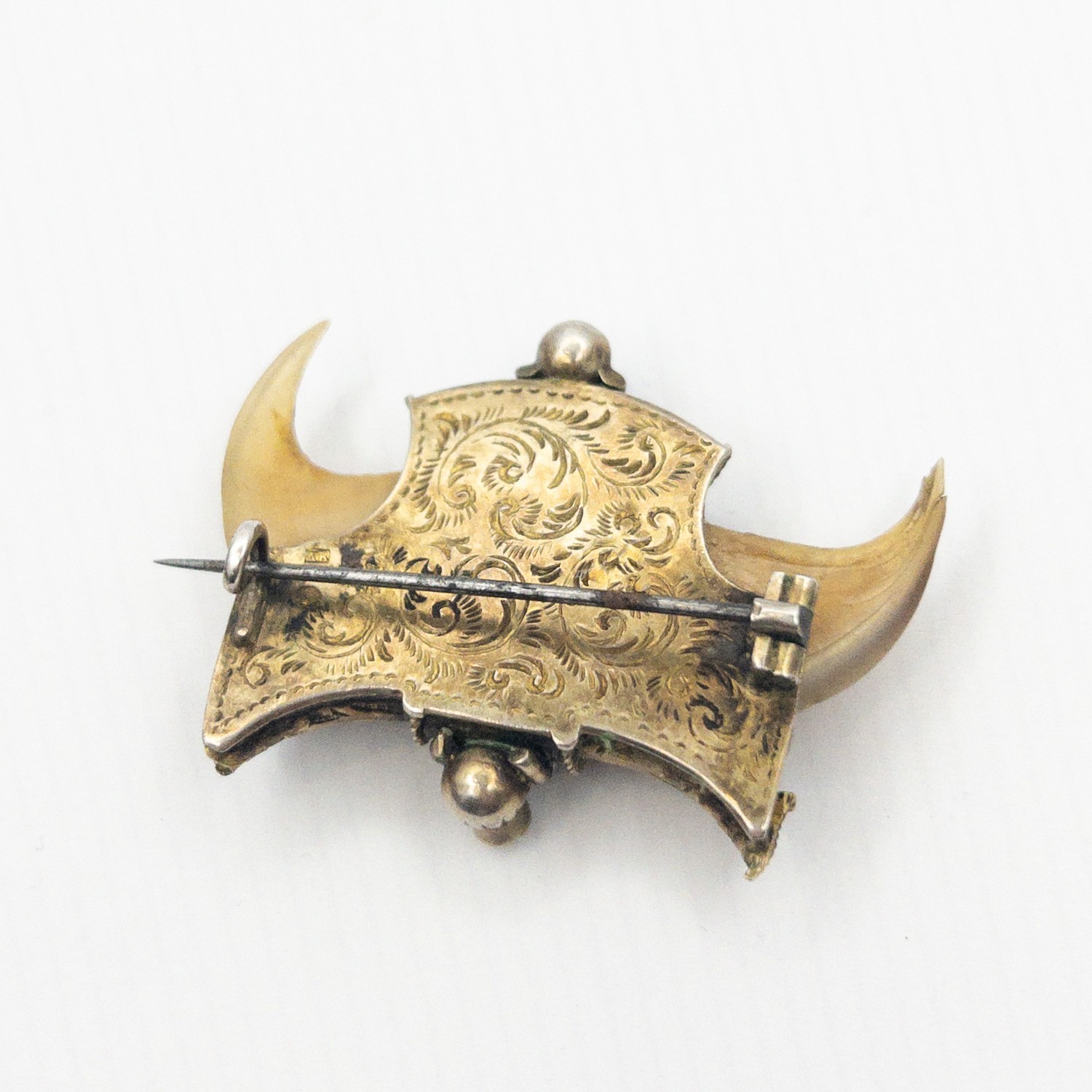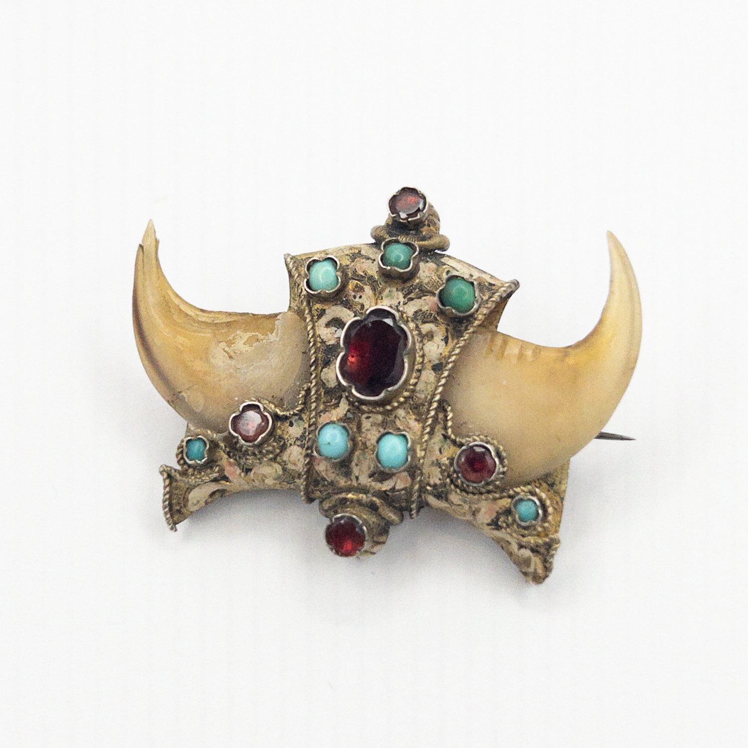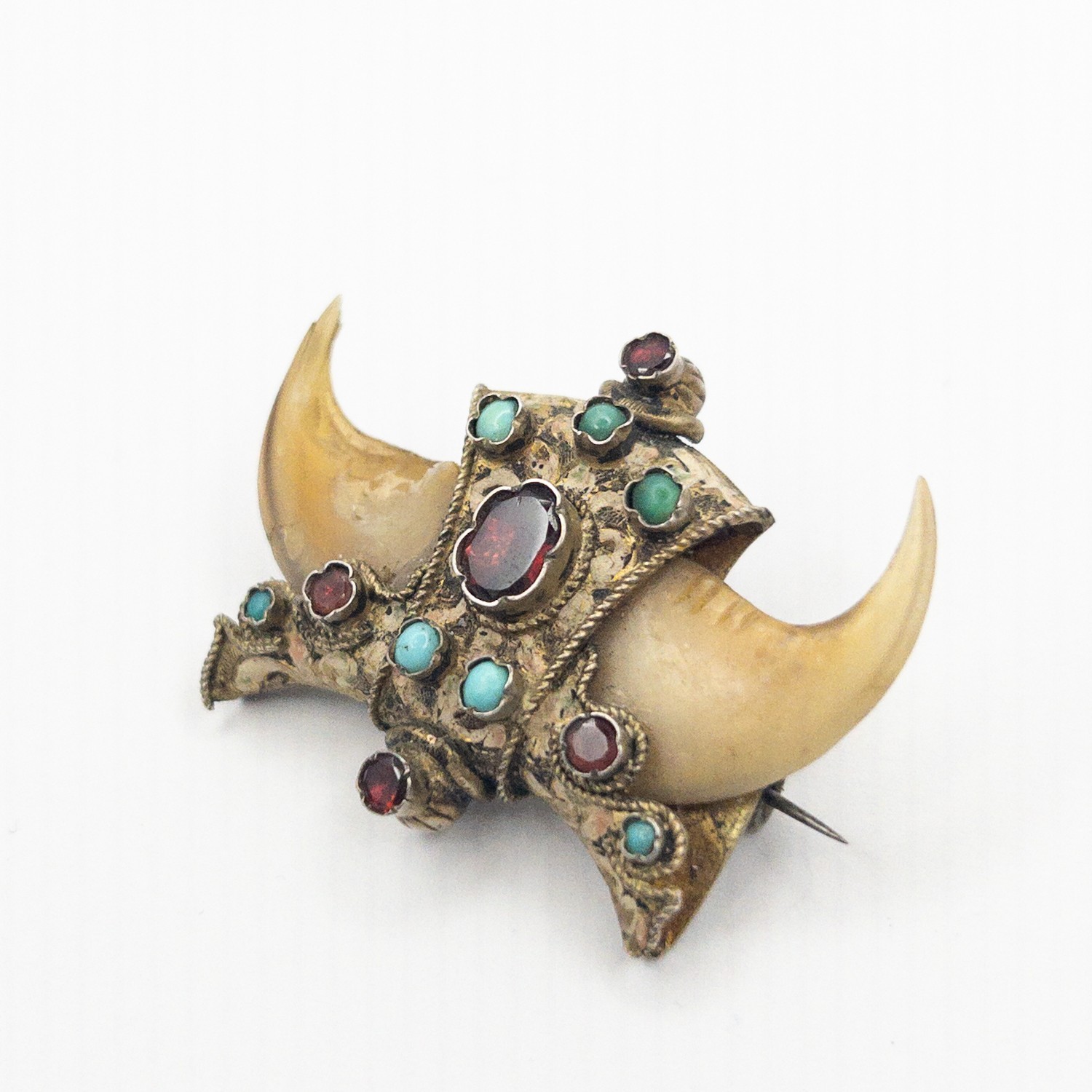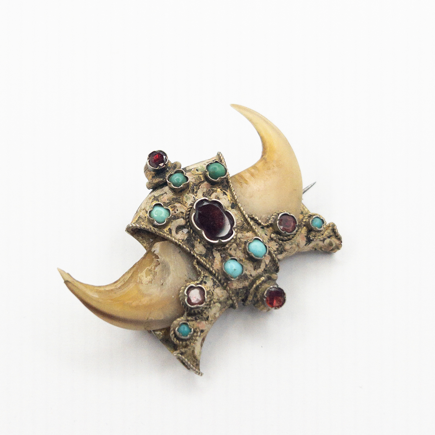 Starožitná stříbrná brož s tygřími drápy, tyrkysy a almandiny