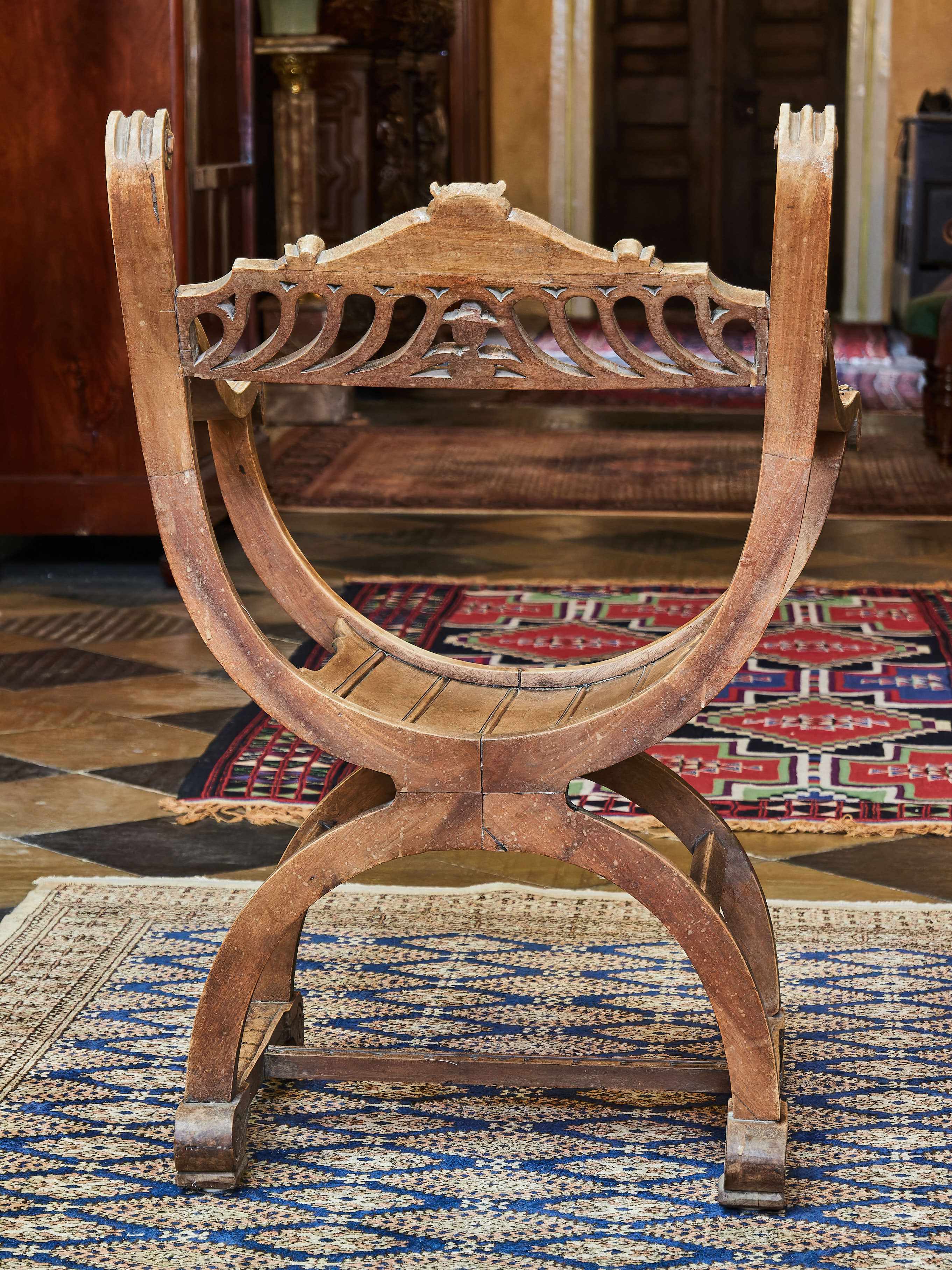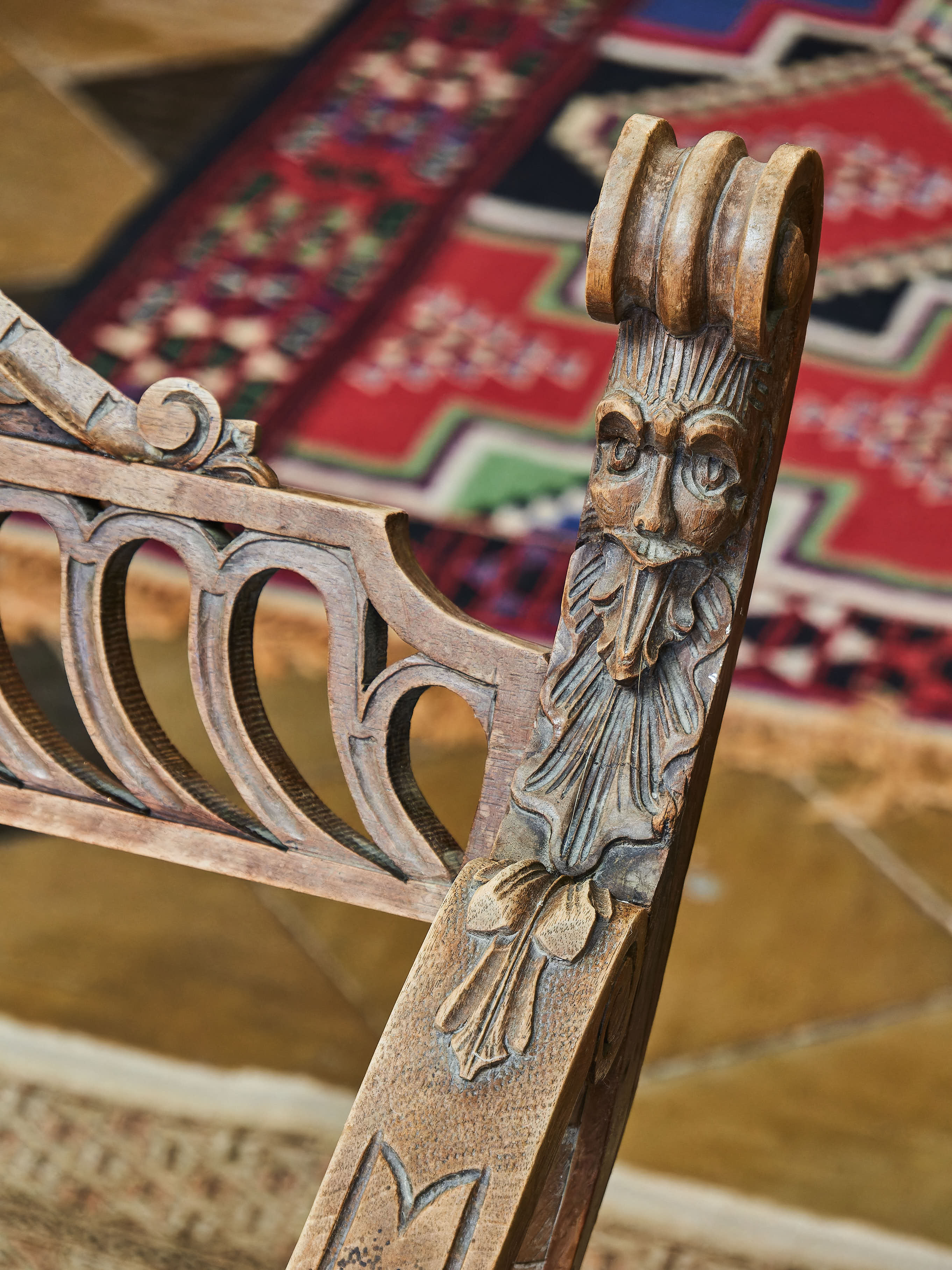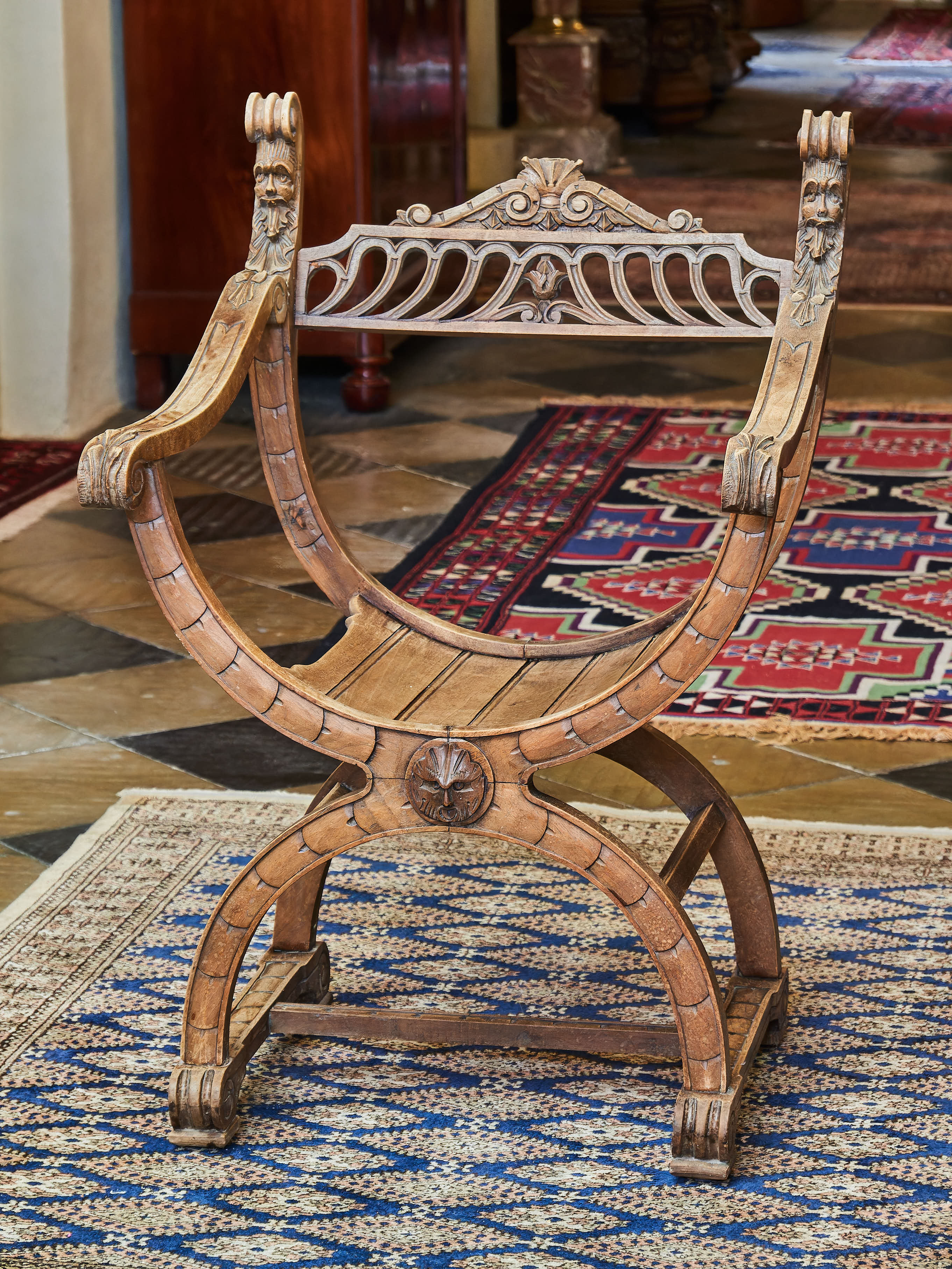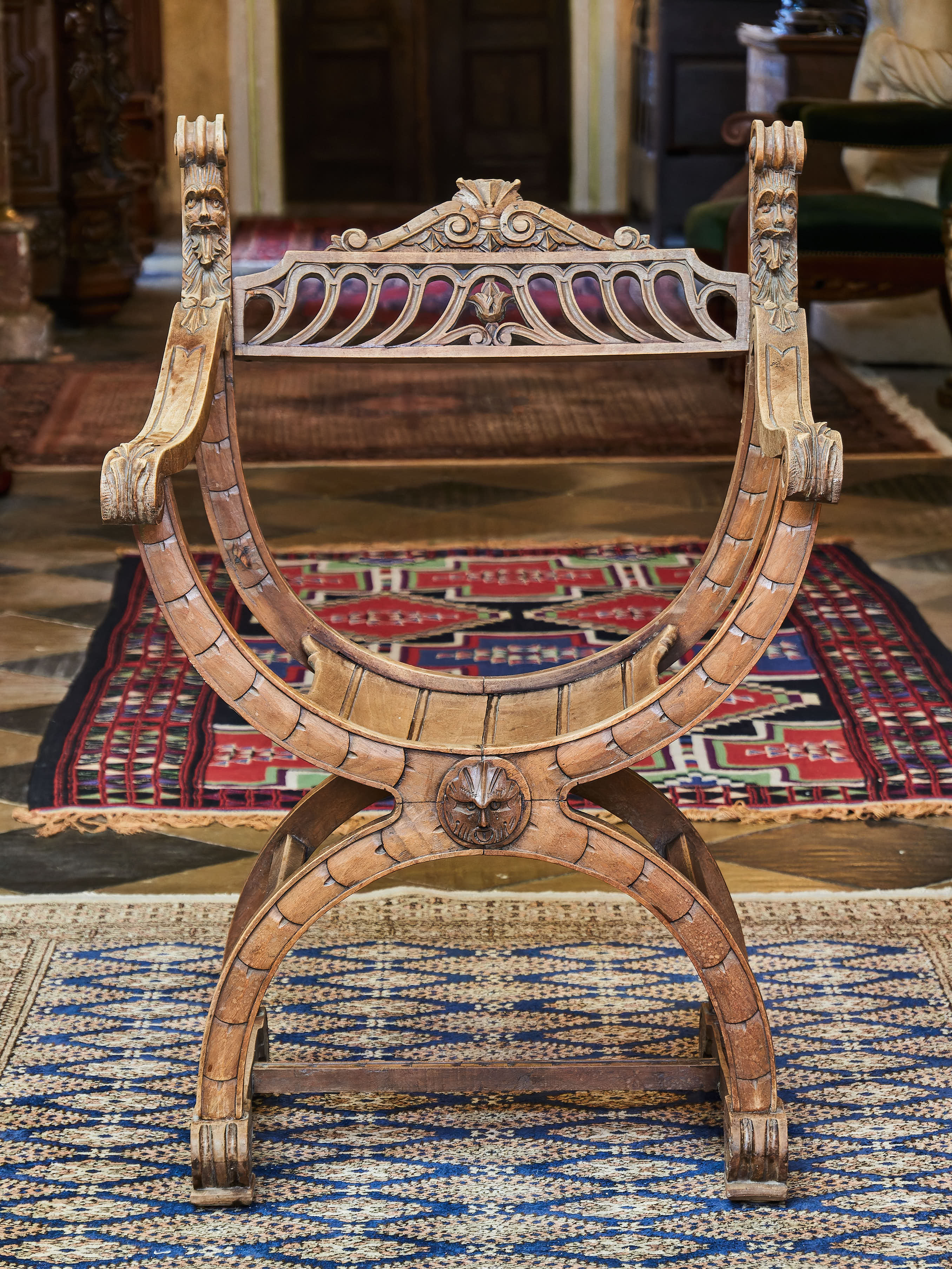 Křeslo z masivního ořechu zdobené ručními řezbami Maskaronů, akantových listů a velkým šupinovým vzorem. Nůžková konstrukce typu Dagobert. Křeslo je spodní trnoží. Bez červotoče.