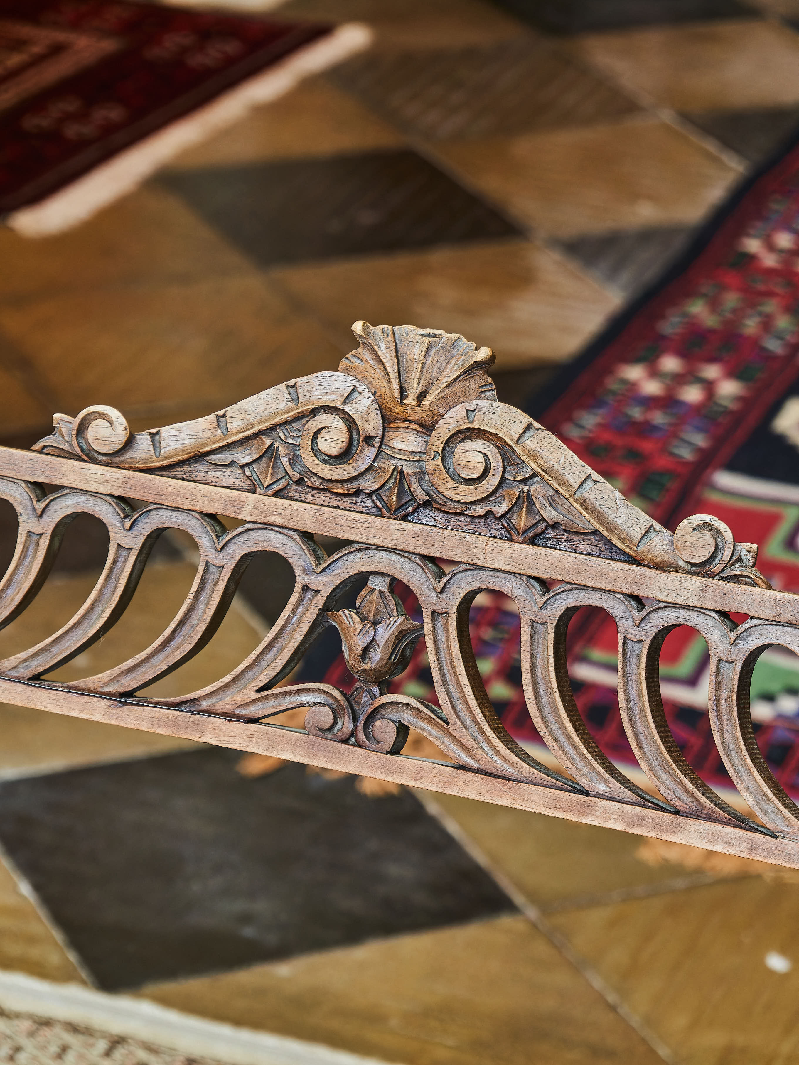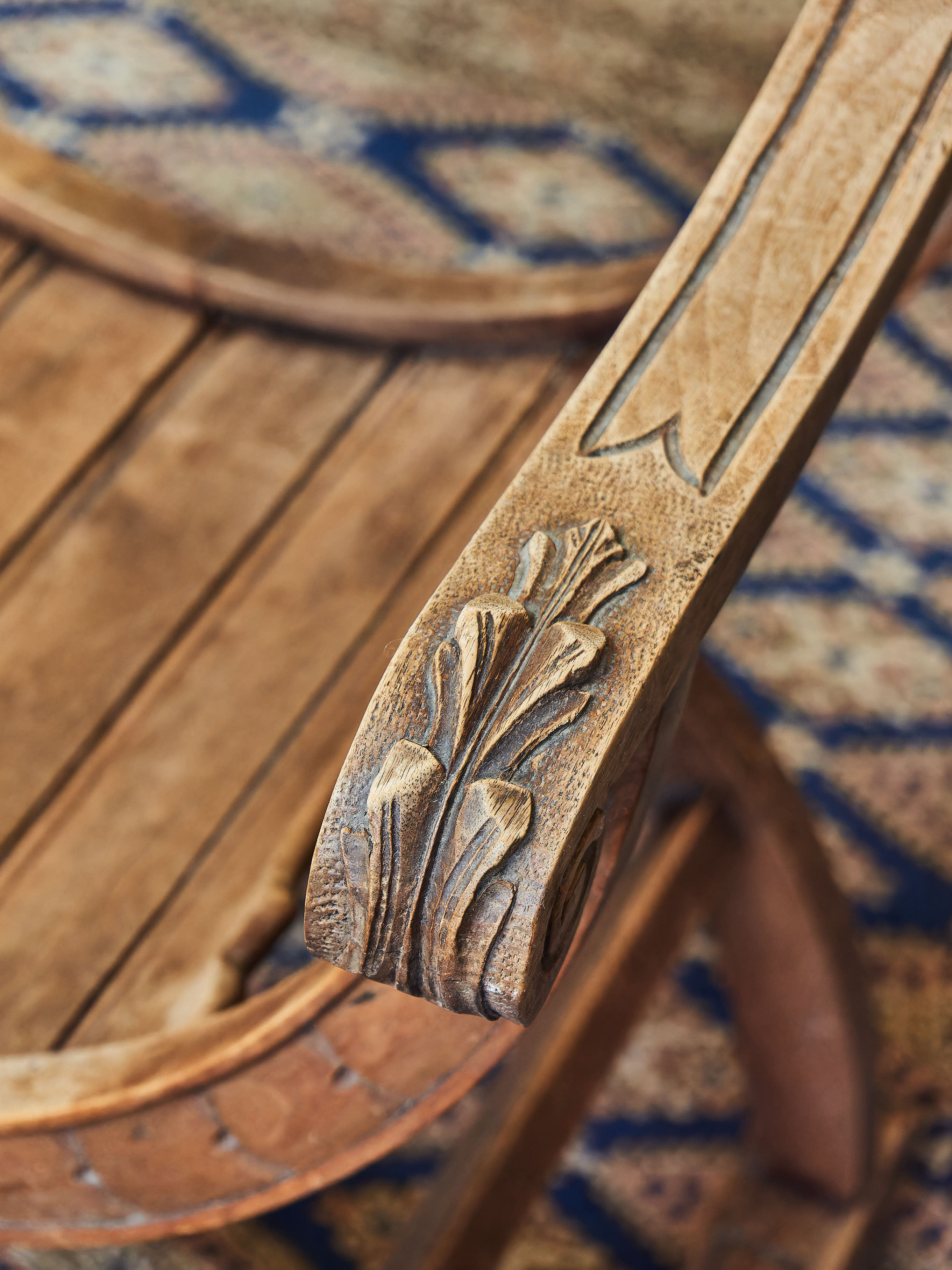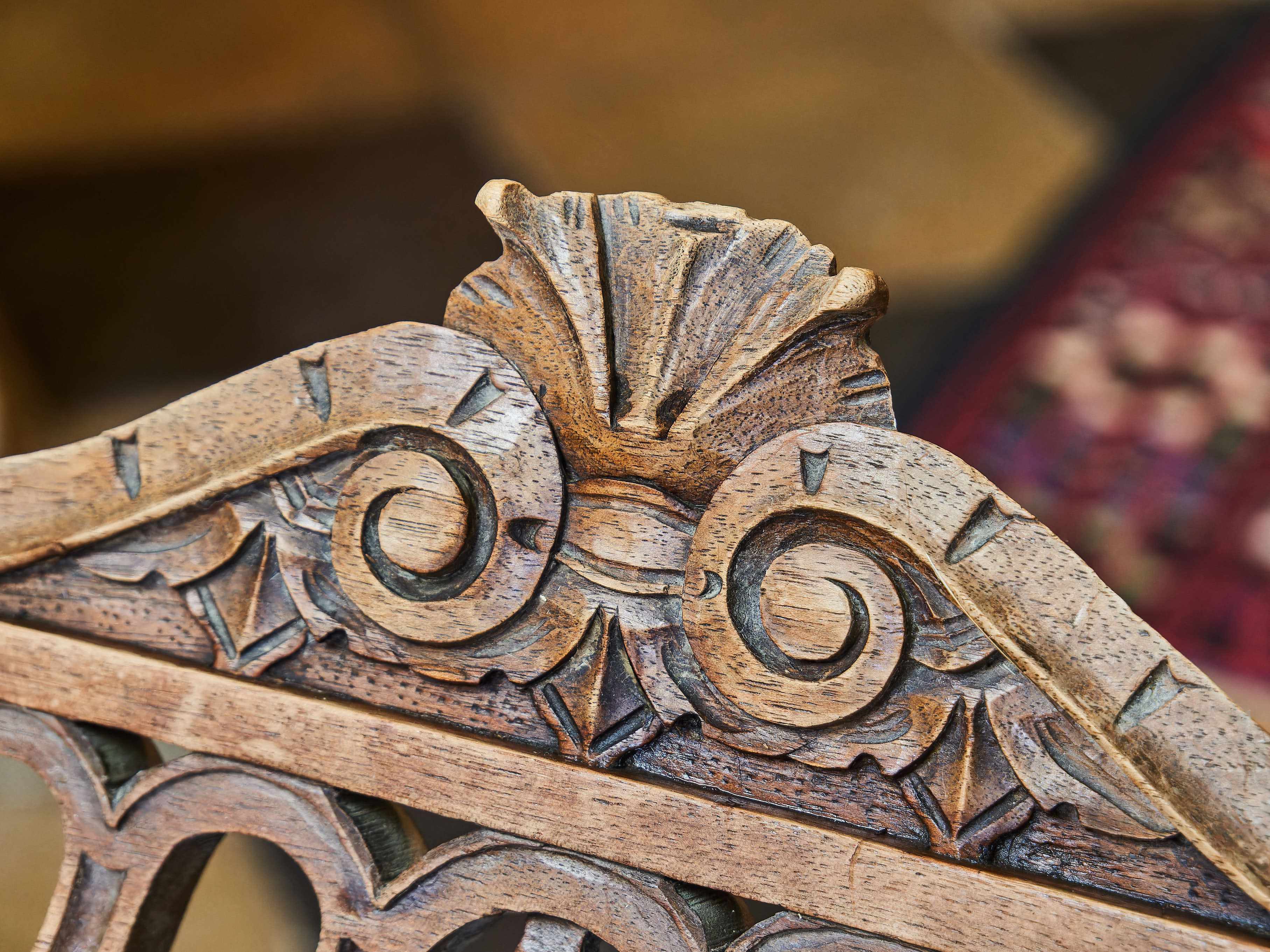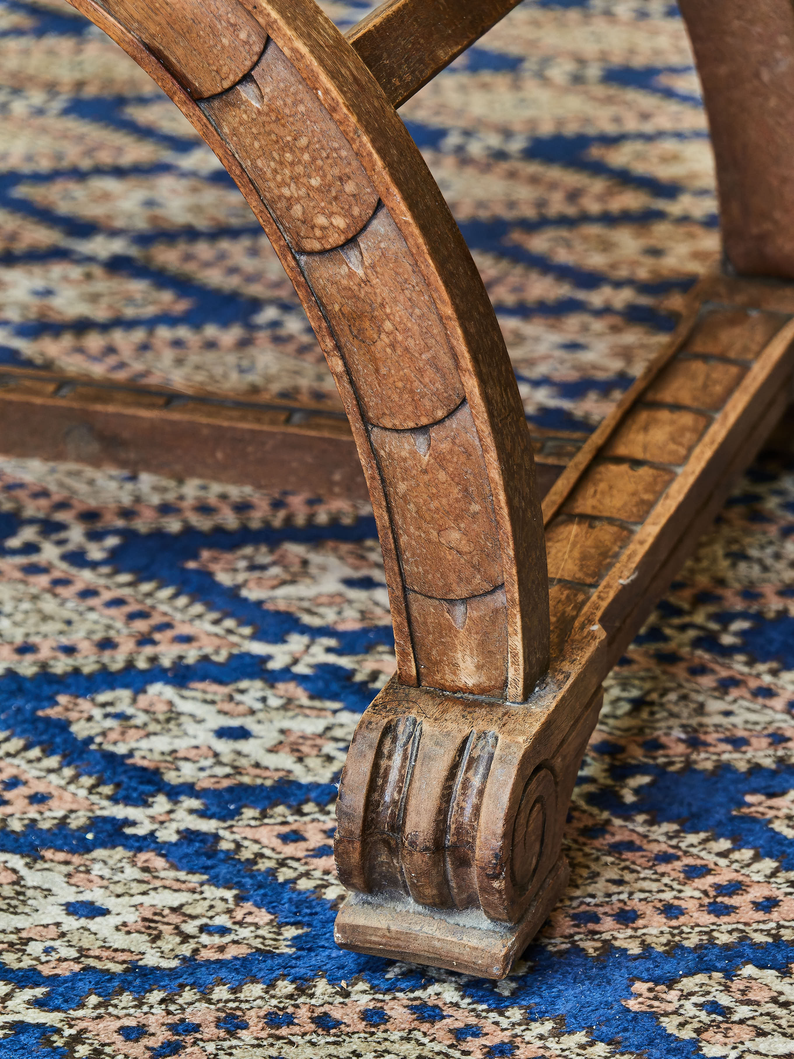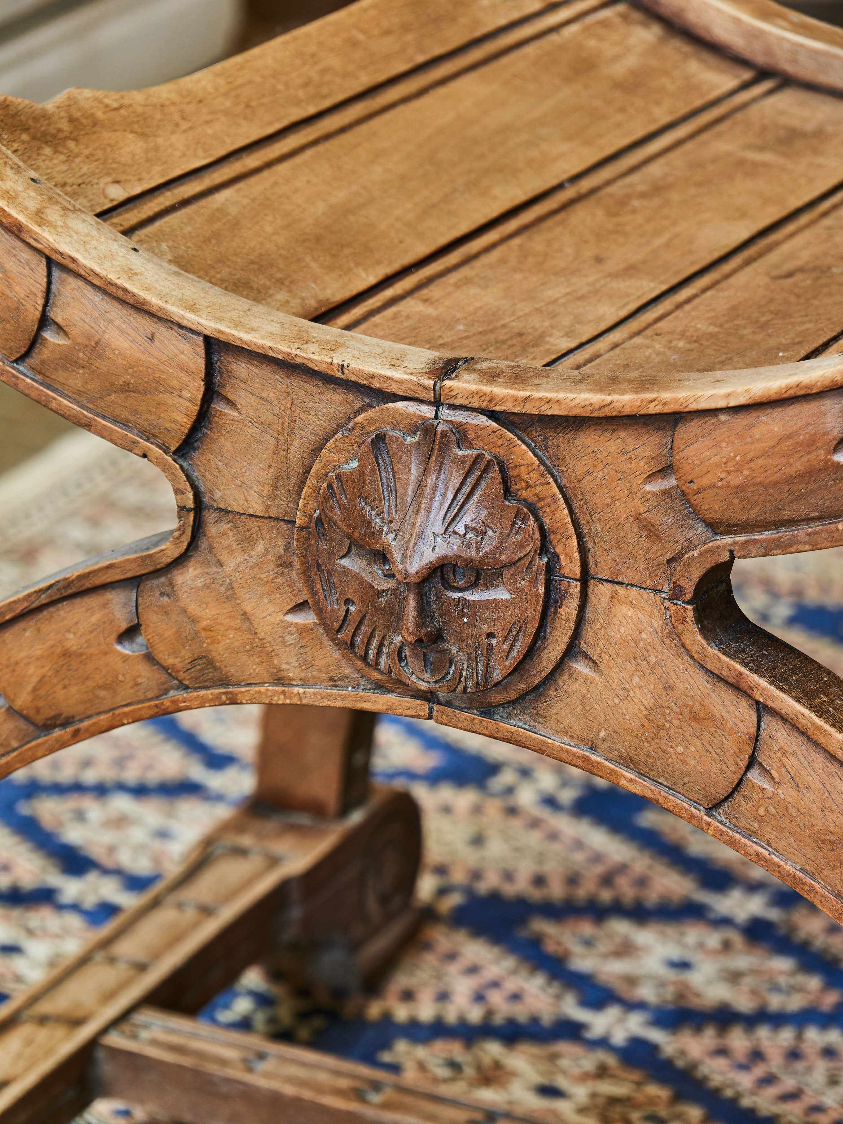 Křeslo z masivního ořechu zdobené ručními řezbami Maskaronů, akantových listů a velkým šupinovým vzorem. Nůžková konstrukce typu Dagobert. Křeslo je spodní trnoží. Bez červotoče.