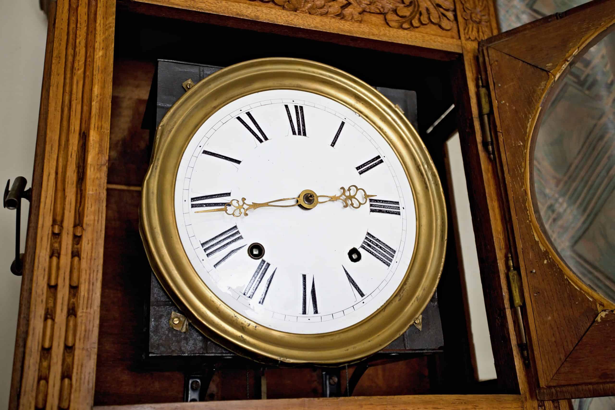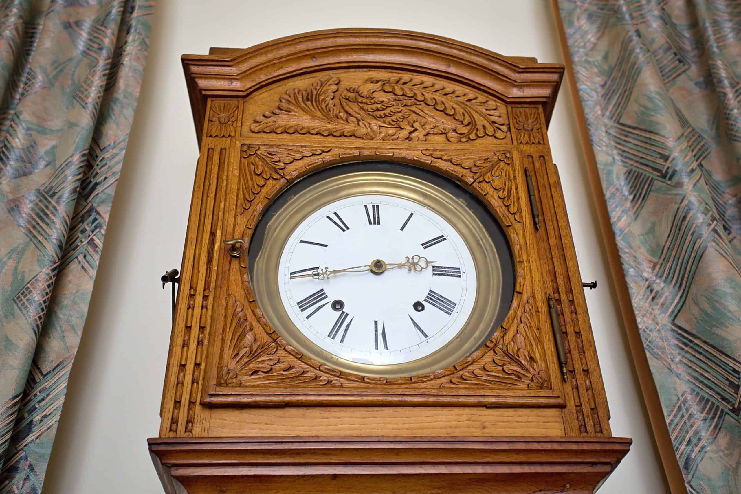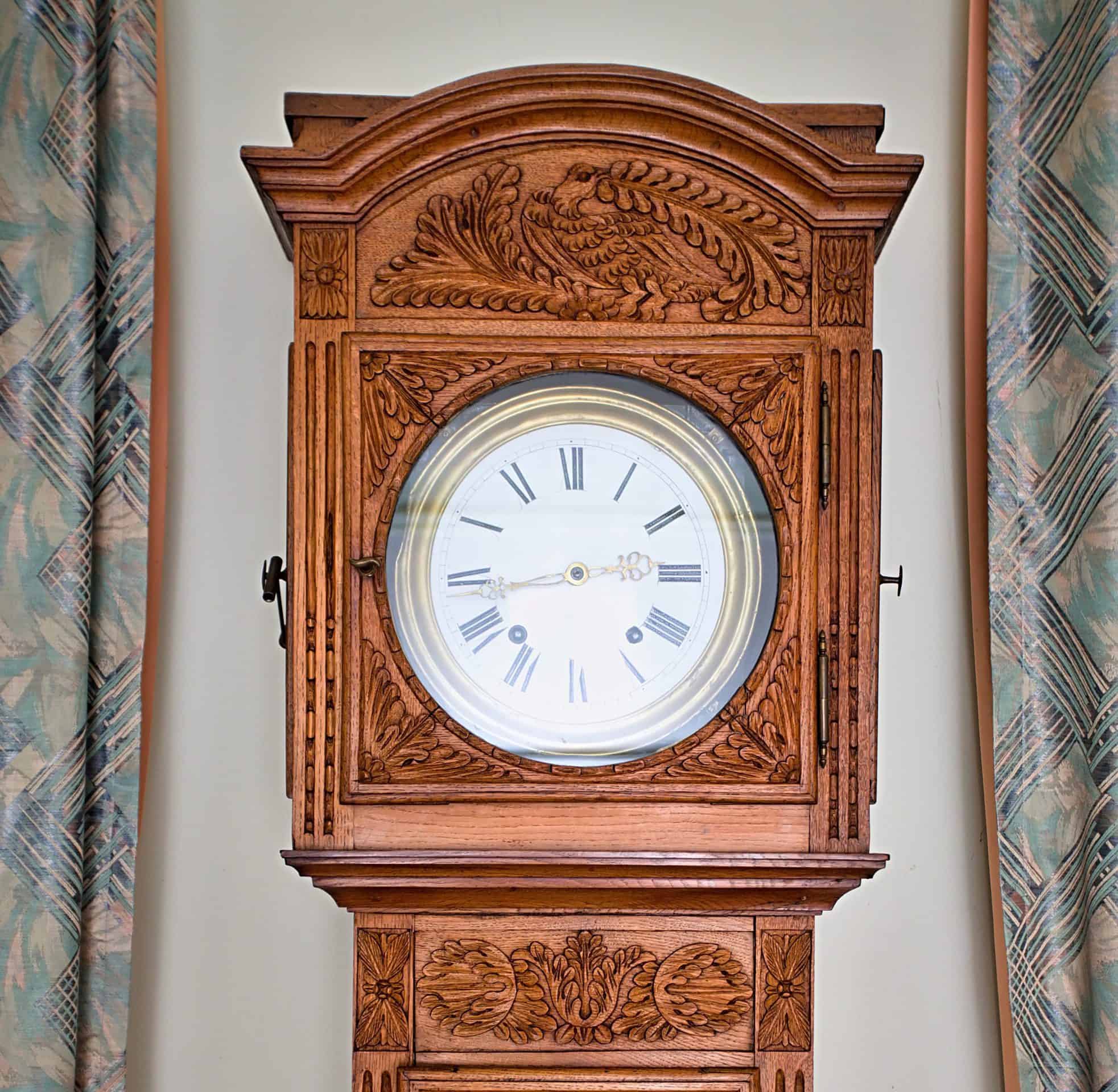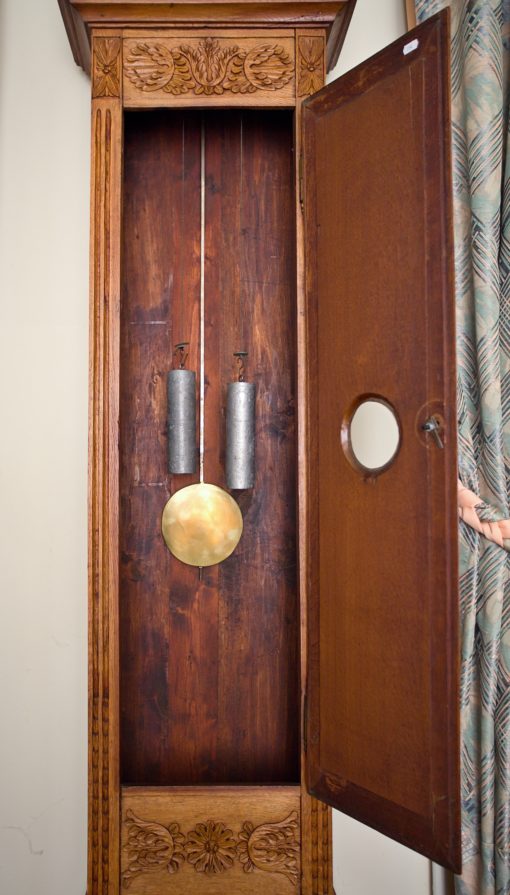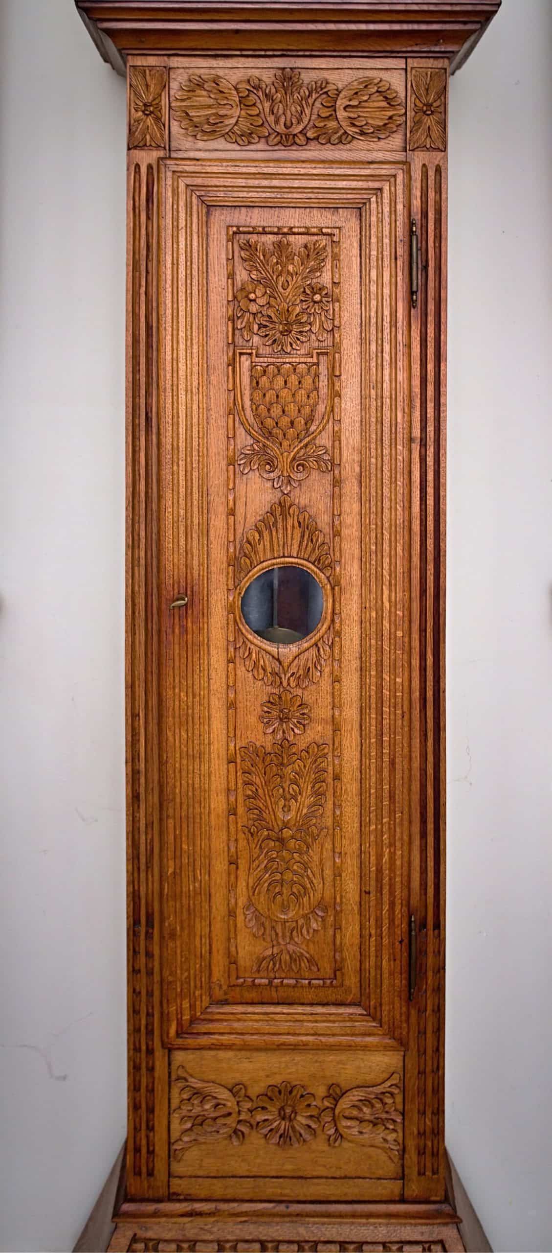 Bohatě řezbované podlahové hodiny. Půlové s odbíjením. Hodiny jsou zrestaurované – plně funkční. Tělo z masivního dubu. Ciferník s římskými číslicemi. Provenience: Západní Evropa. Datace: polovina 19. století. Stav: funkční, velmi dobrý, bez dřevokazného hmyzu.