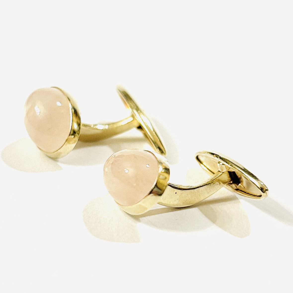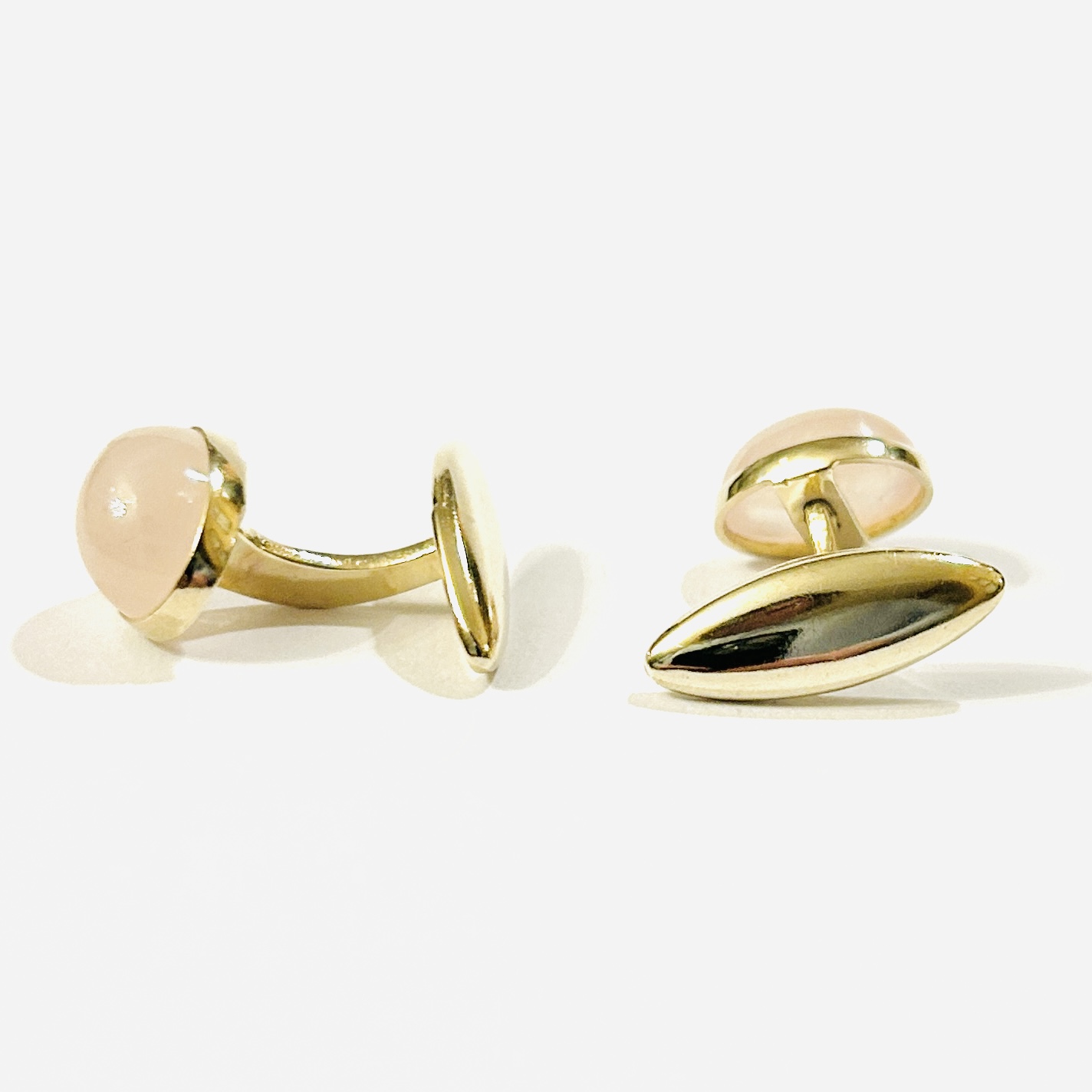 Decentní, nadčasové manžetové knoflíčky s hlavicí osazenou oválnou muglí přírodního růženínu s inkludovanou strukturou, fasováno plně přiléhající obrubou. Středoevropská či západoevropská zlatnická práce z počátku 20. století.
