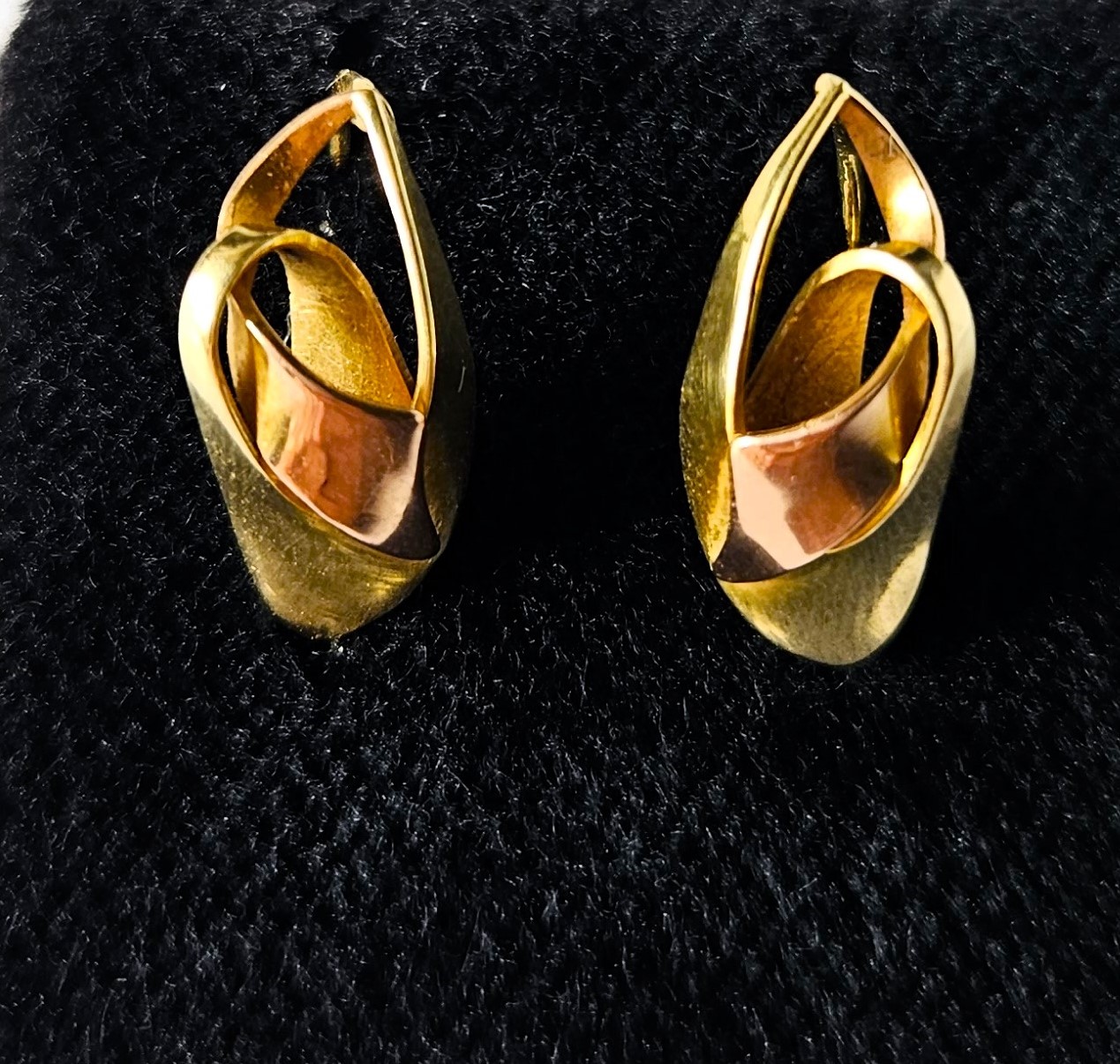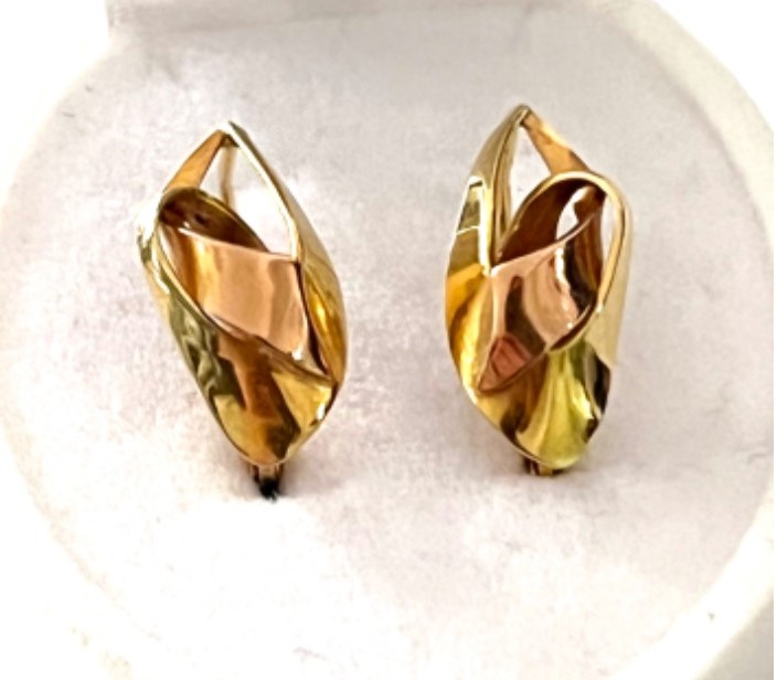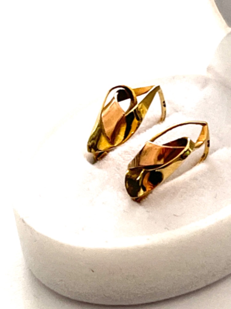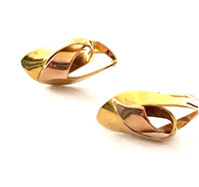 Starožitné zlaté náušnice v ryzosti AU 585/1000 ze žlutého a jemně růžového zlata označeném historickým puncem čejka, ryzost zlata 14 karátů, váha 2,94 gramů, klasické zapínání, hezký stav.