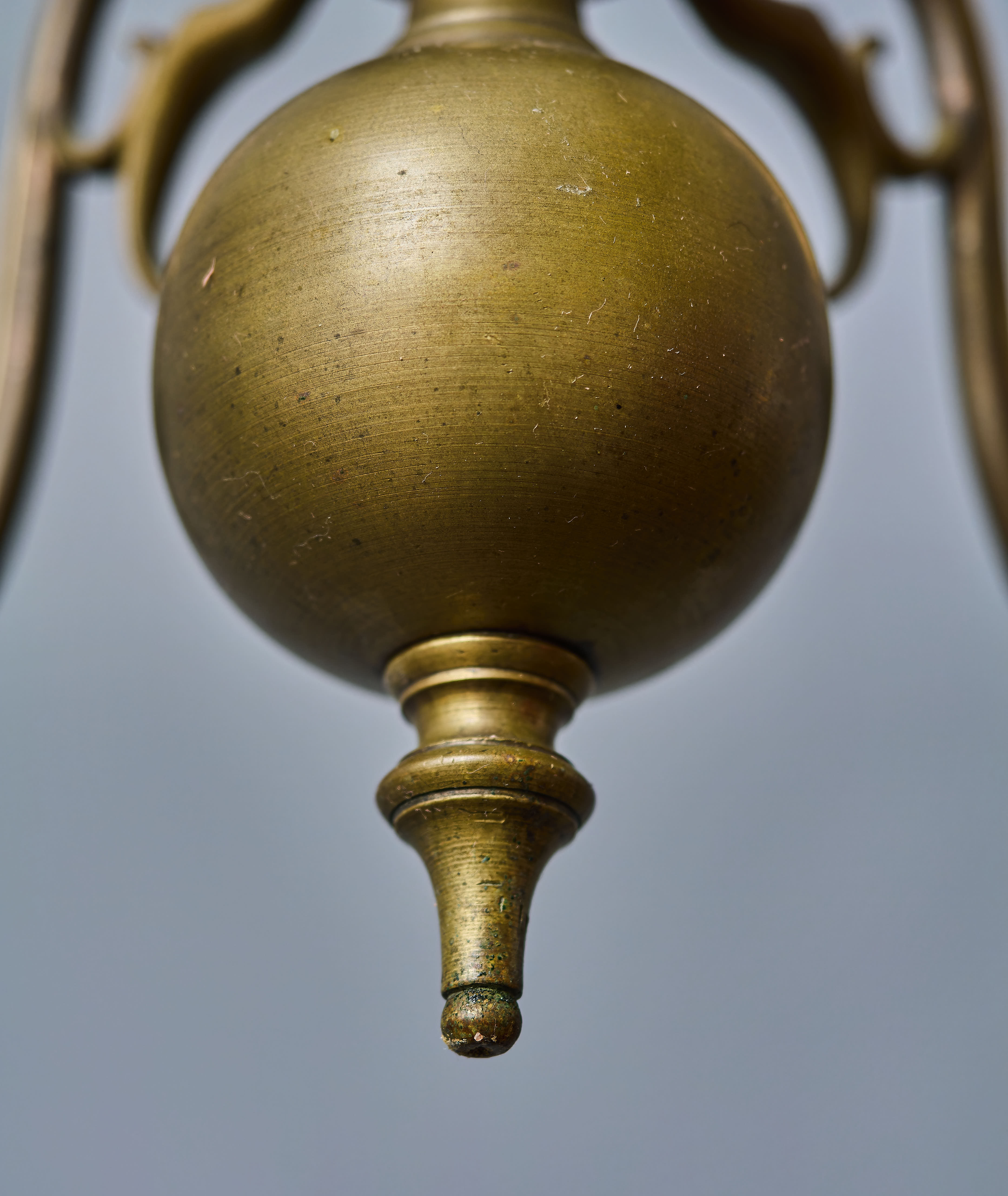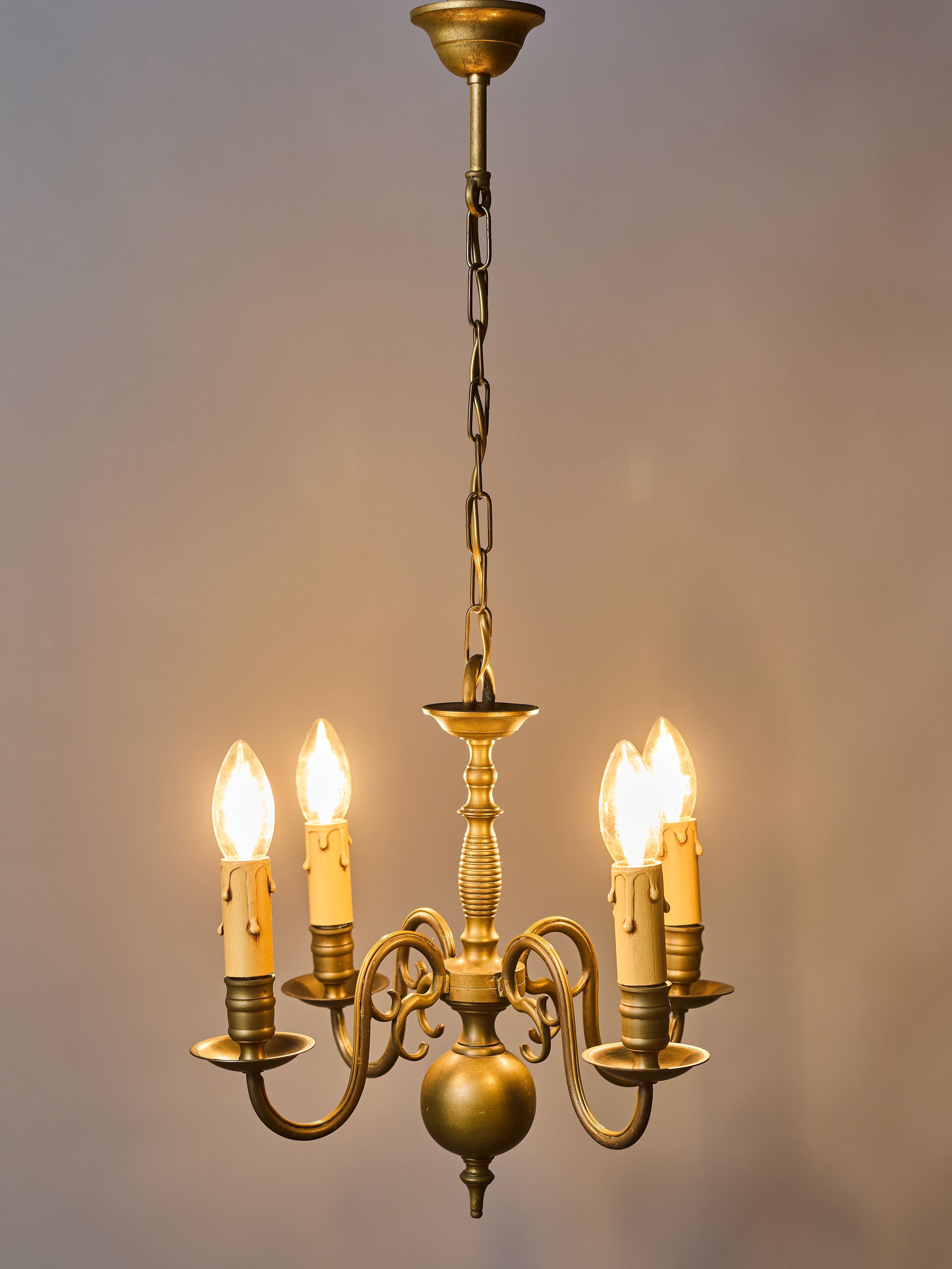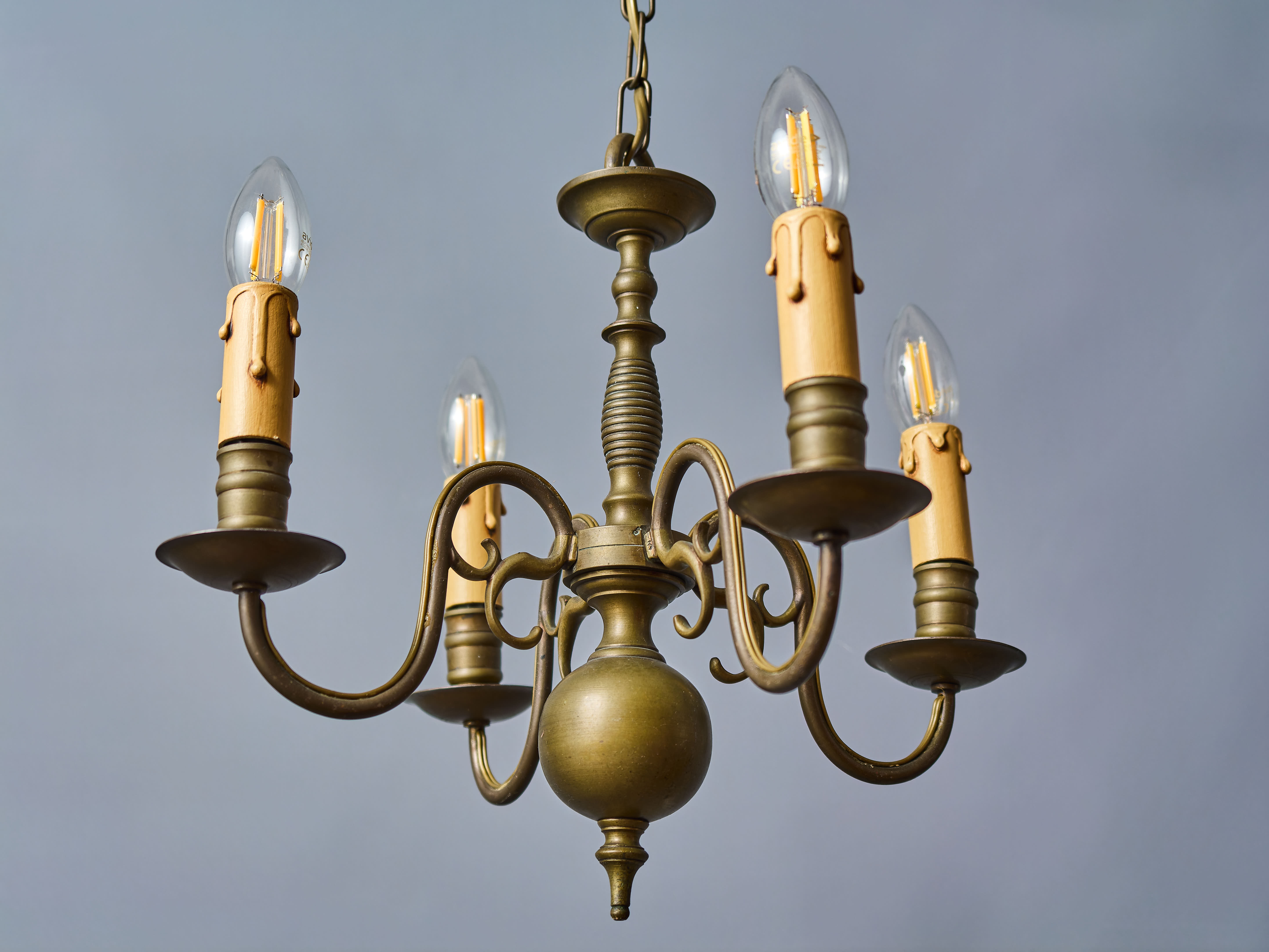 Elegantní menší starožitný lustr z bronzu pocházející z oblasti Vlámska, datovaný přibližně do poloviny 19. století. Lustr je zpracován v tradiční historické formě s centrálním tělem a čtyřmi ladně prohnutými rameny, které nesou svíčkové objímky. Celek působí velmi harmonicky a díky svým proporcím je vhodný jak do menších salonů, tak například do vstupních hal, ložnic či stylových interiérů.