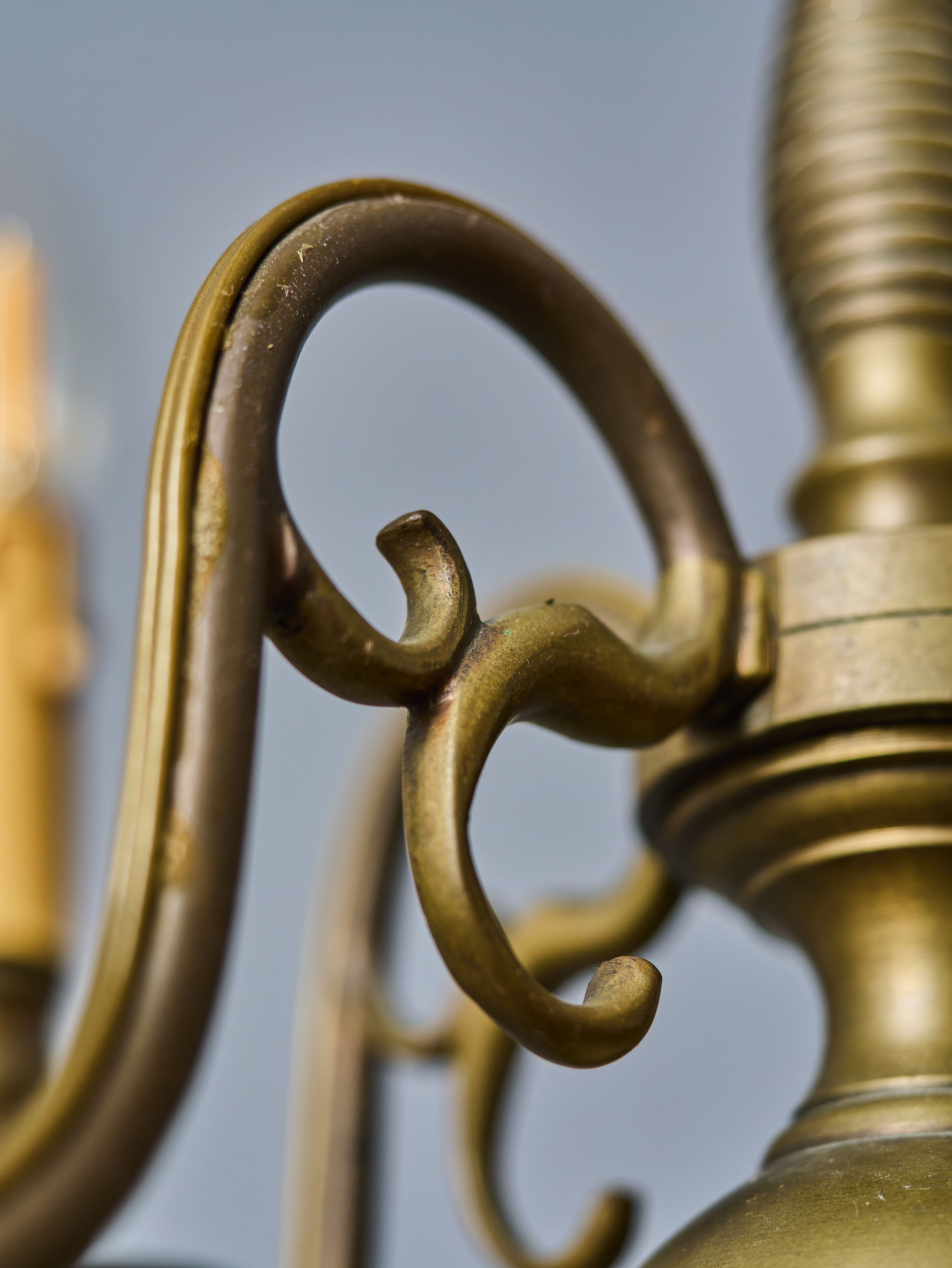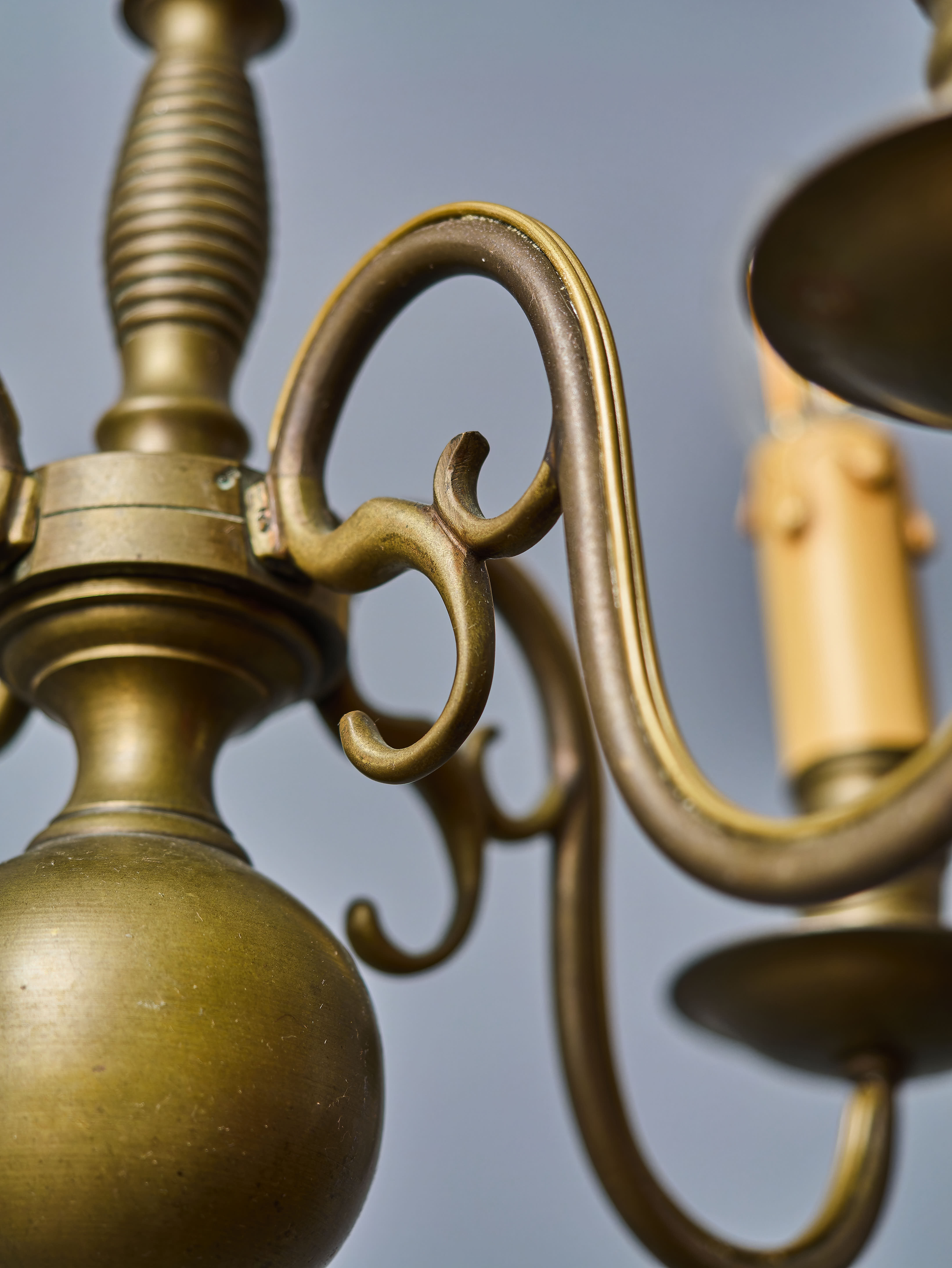 Tělo lustru je vyrobeno z bronzu s krásnou přirozenou patinou. Dekorativně tvarované ramena a soustružené středové prvky dodávají svítidlu klasický historický charakter typický pro vlámské a severoevropské lustry 19. století.