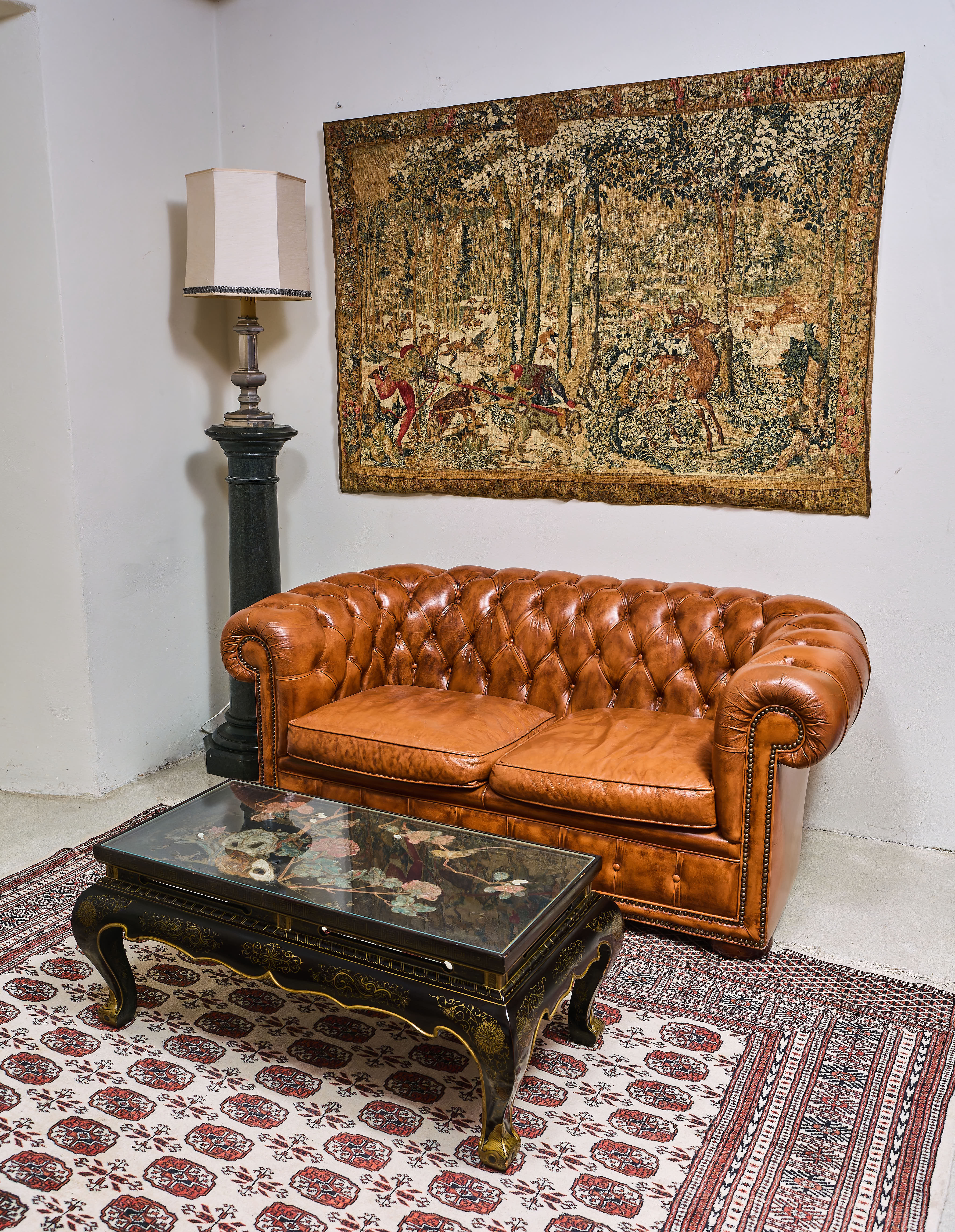 Masivní exotické dřevo, čínský lak, ruční malba, kamenná intarzie, sklo